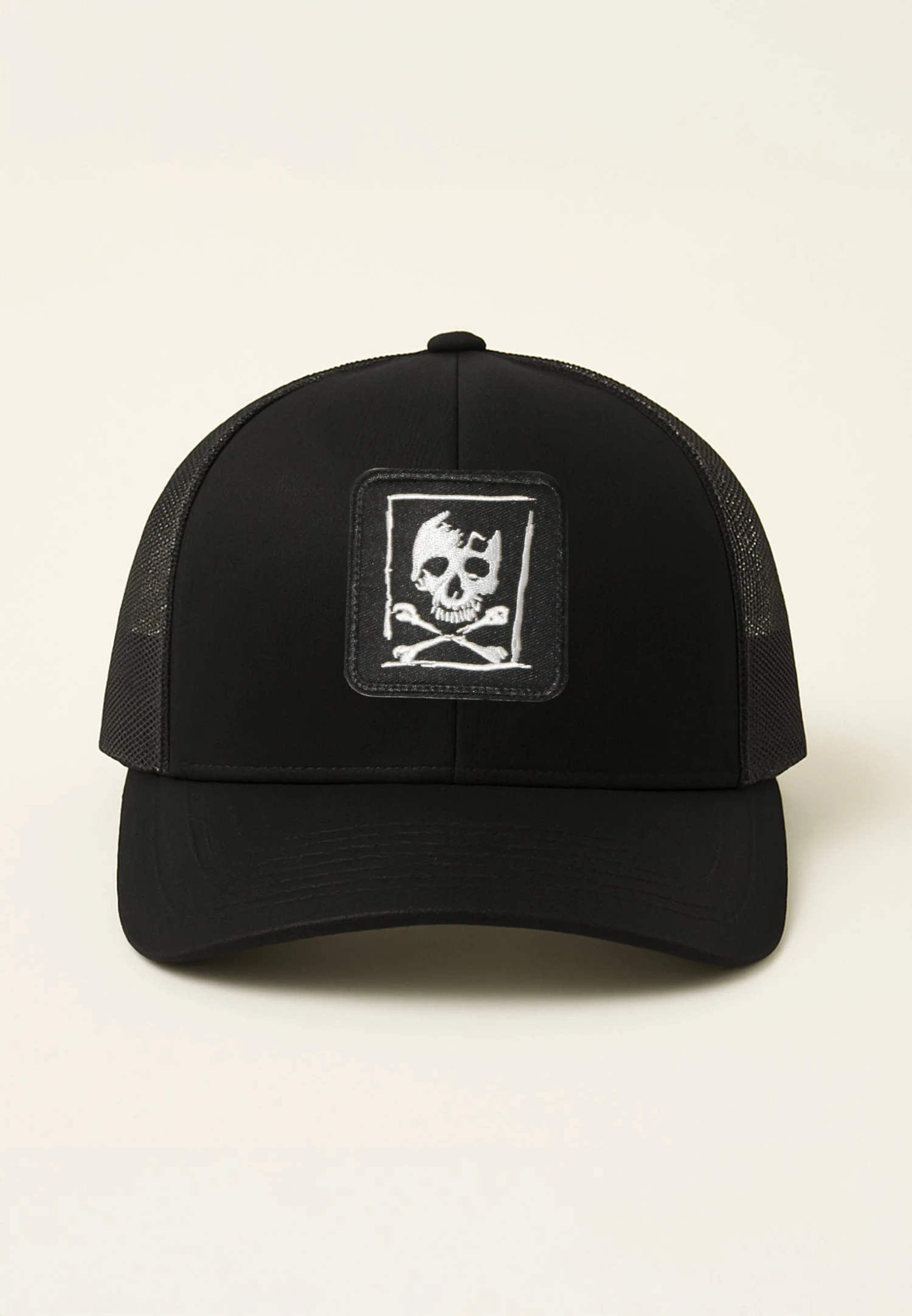 Complete your look with the Skull Crossbones Trucker Cap in black, featuring a cool skull and crossbones patch on the front, a curved peak and a mesh back with an adjustable snapback closure.