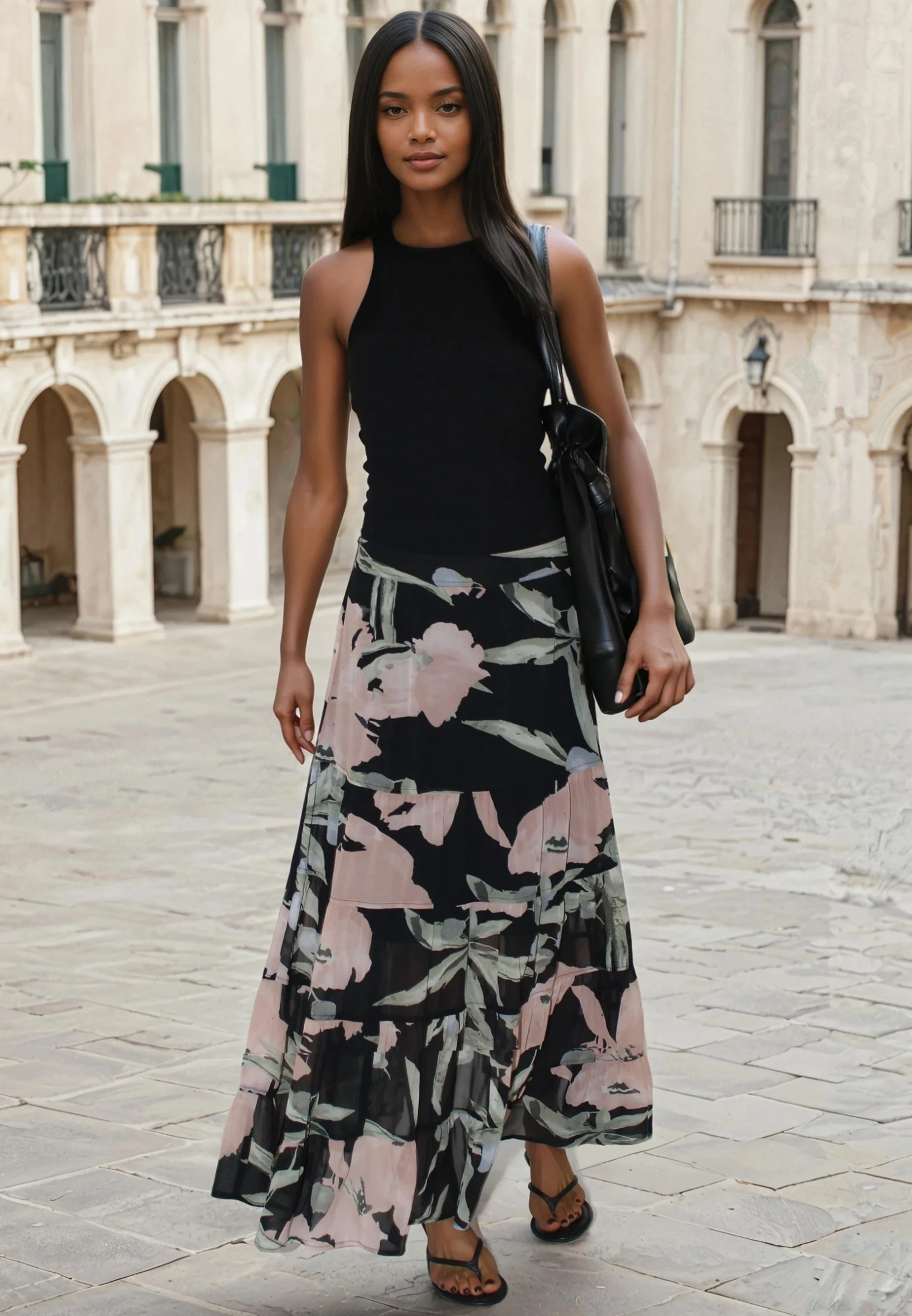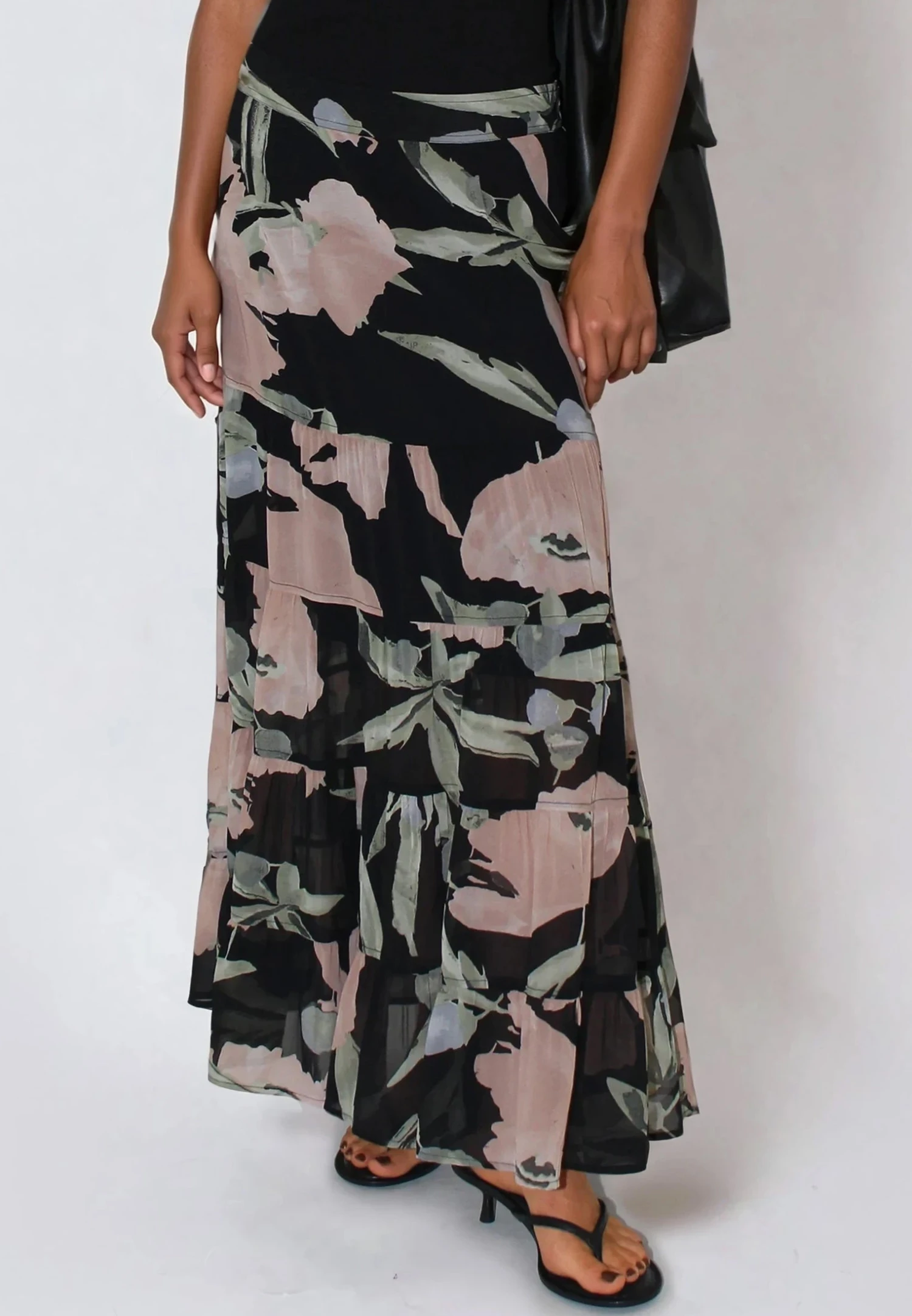 The relaxed fit of the Angelina skirt makes it an easy and versatile style crafted in our floral Prime print in dusty pink and black. The Maxi length skirt features an elasticated waistband at the back for ease and comfort, is long length with gathered panneling and has a short lining. Wear with a jumper or tshirt for an eeveryday effortless outfit or wear with the matching Ivy top. The model wears a size 10. Length from the top: 92 cm