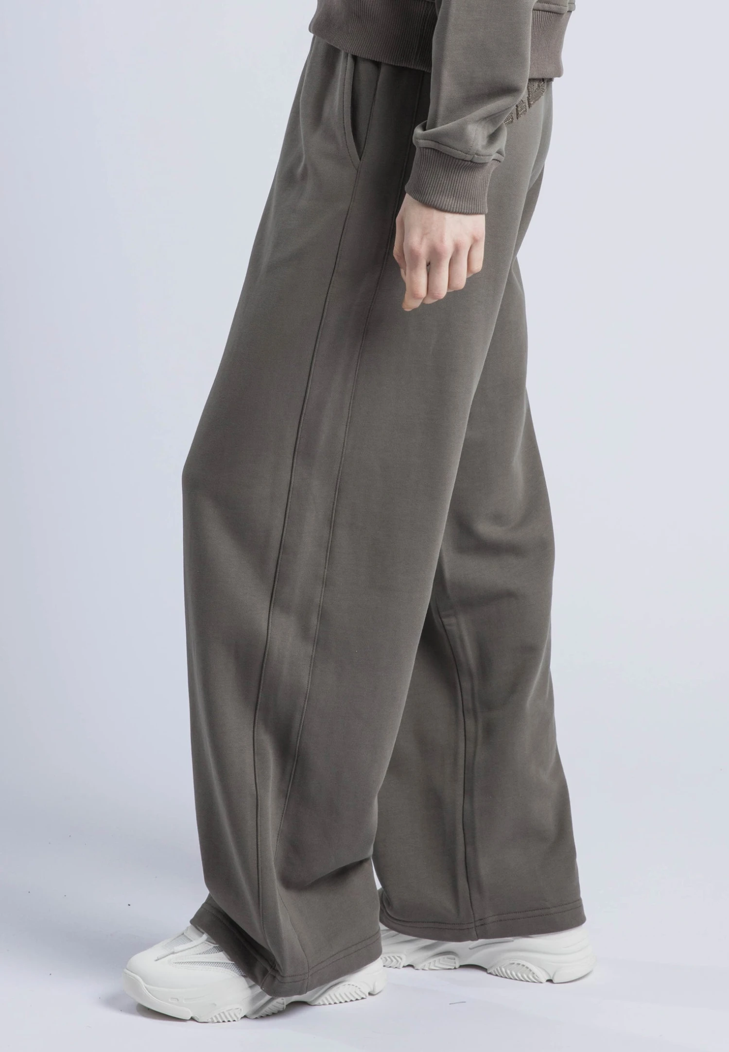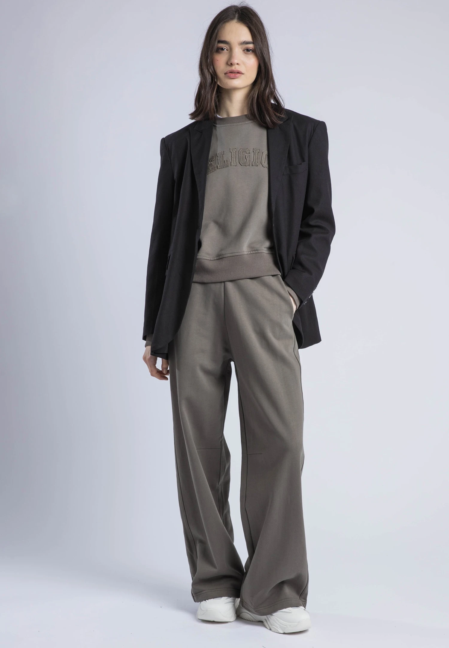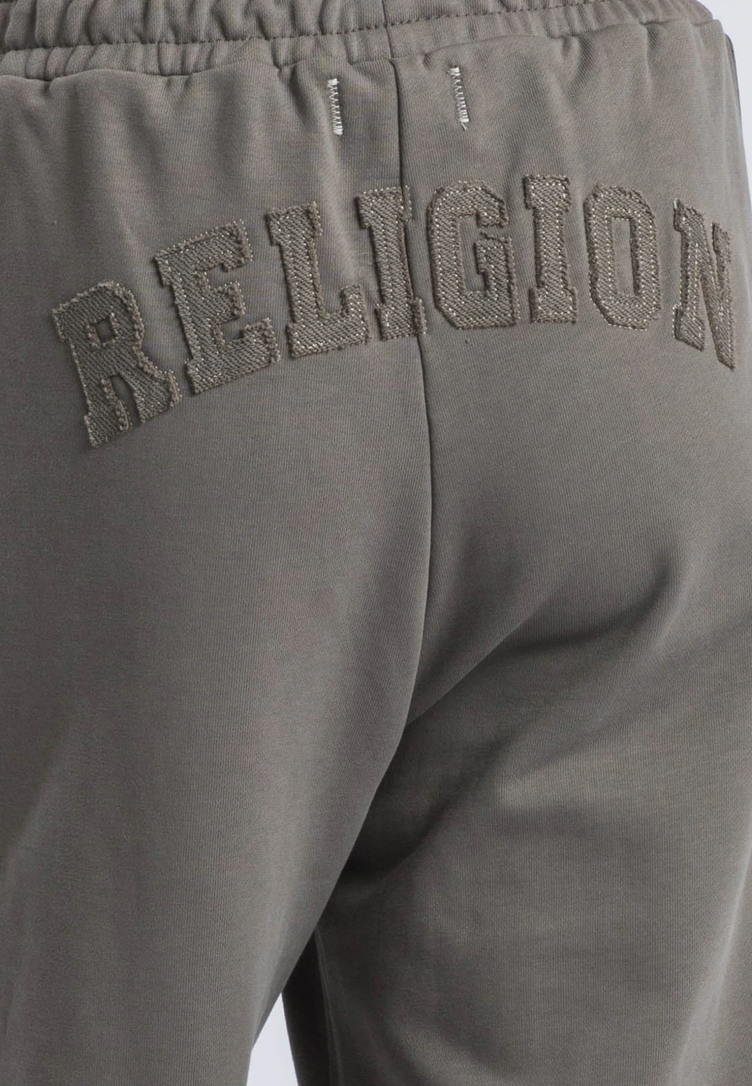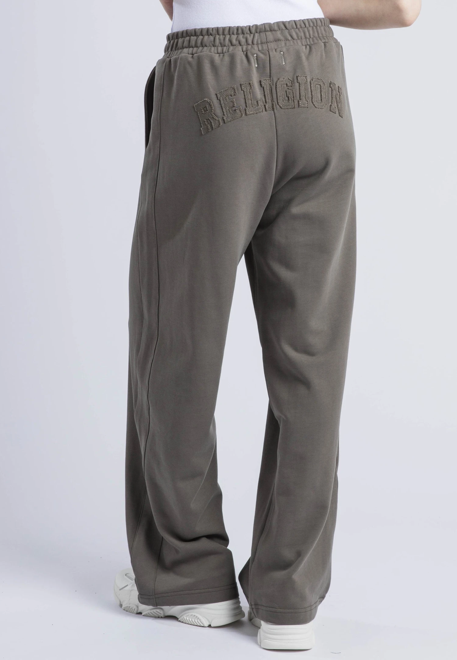 These relaxed-fit sweatpants in brindle offer both style and comfort with a wide leg, elasticated waist, and front pockets. Crafted from soft cotton, they feature a signature Religion applique at the back for added flair. Perfect for lounging or heading out, pair them with a cozy knit or the matching sweatshirt for a laid-back, coordinated look. The model wears a size UK 10. Inseam length: 75 cm.