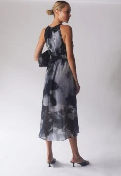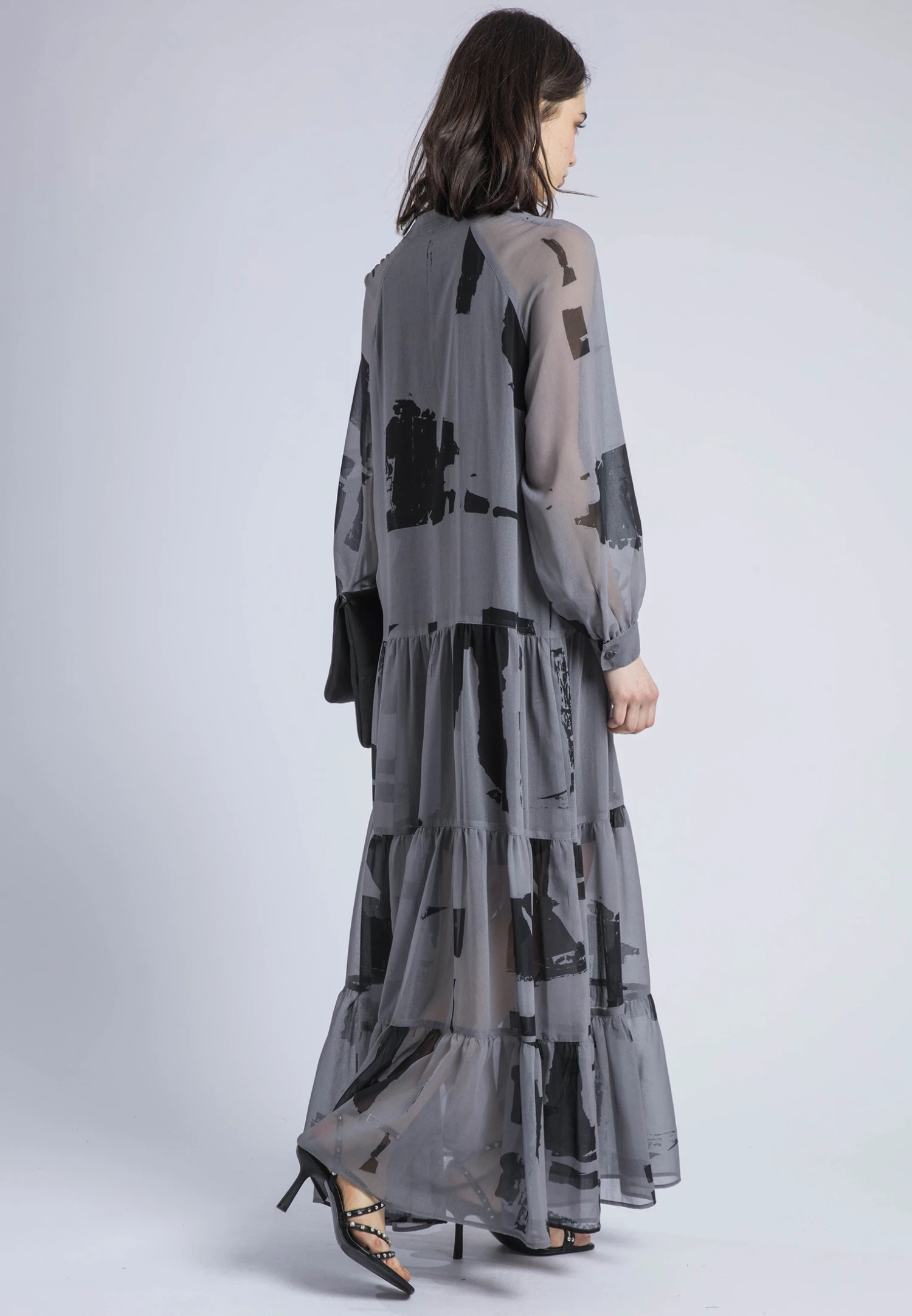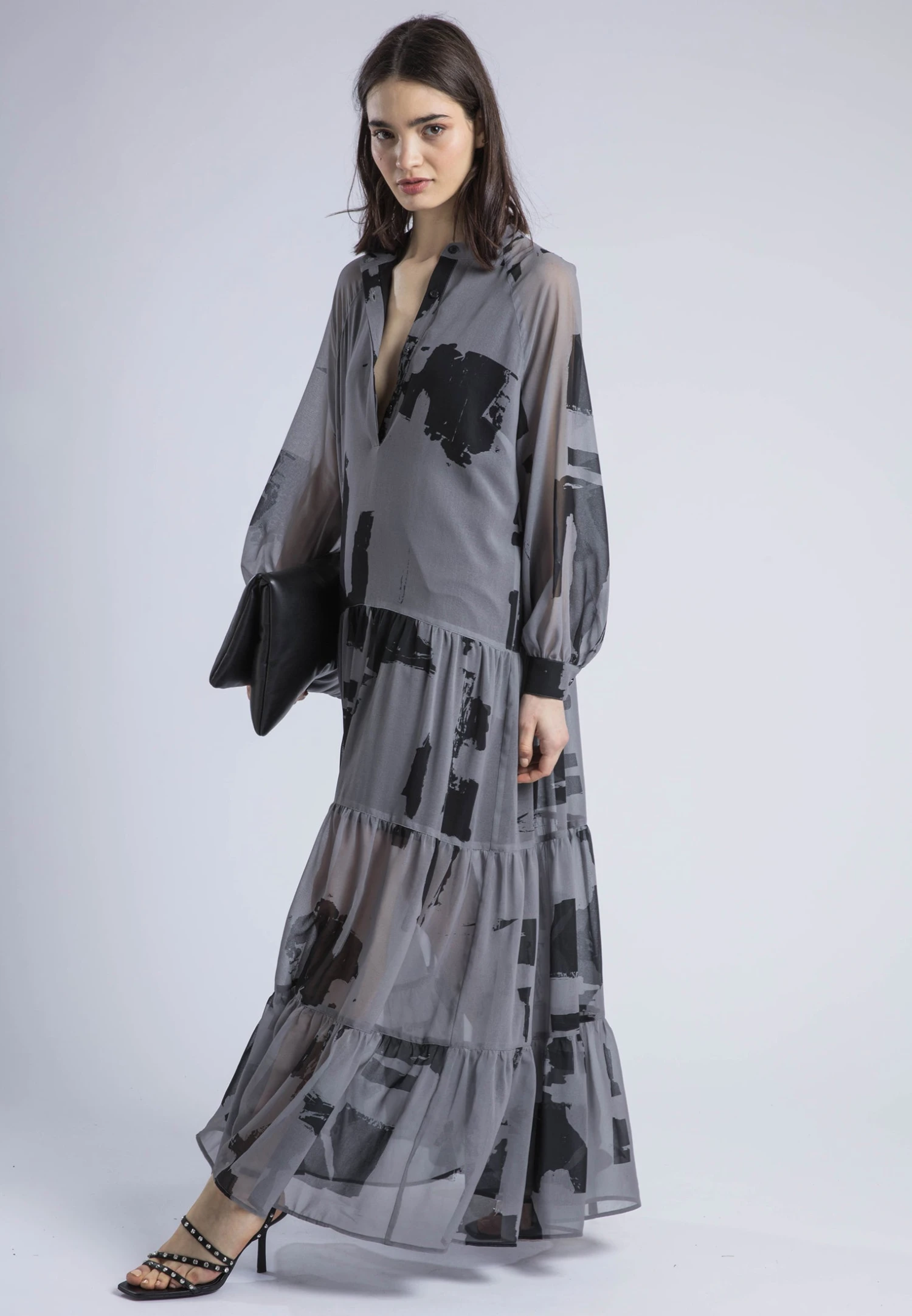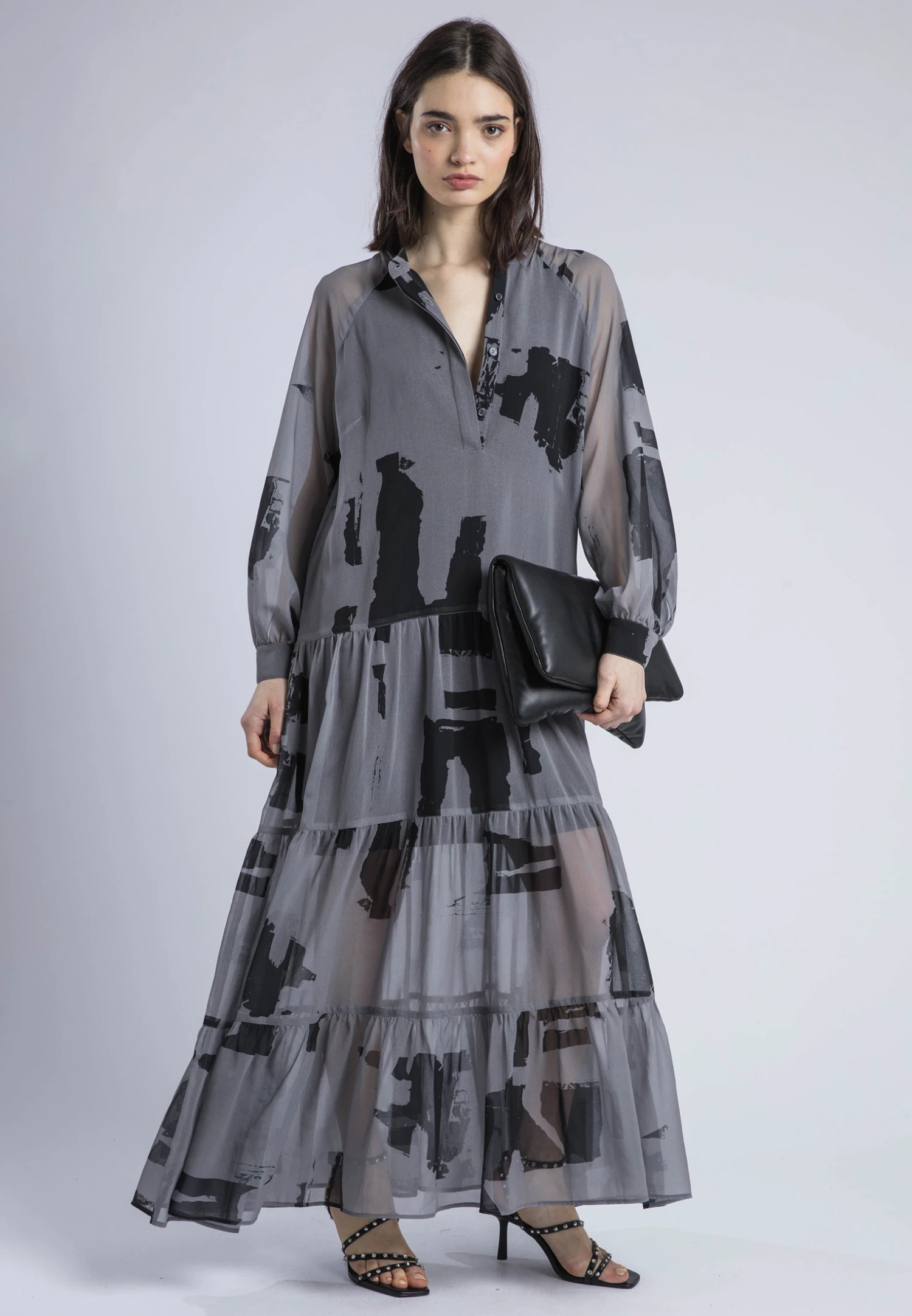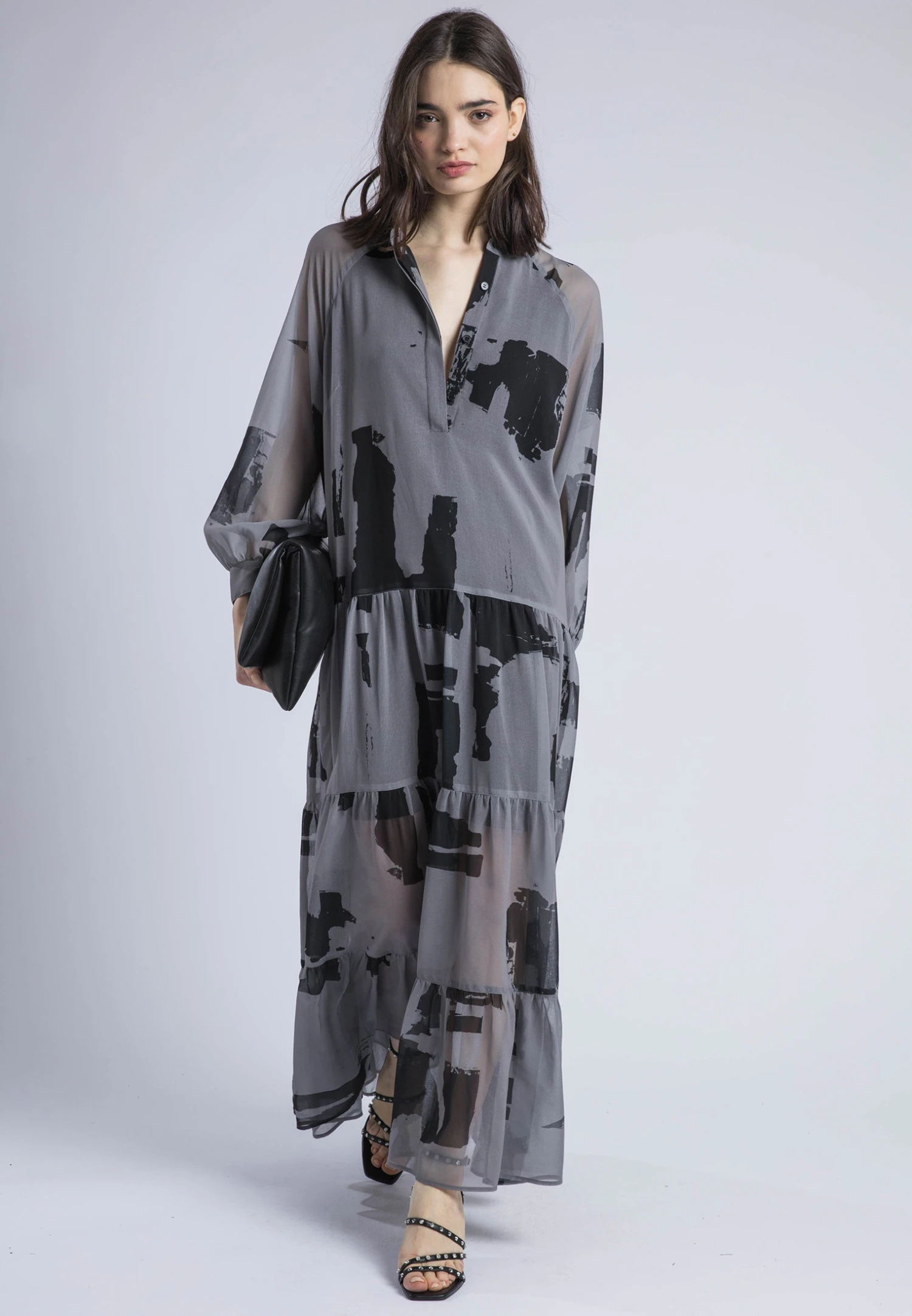 The Cala Maxi Dress is a voluminous, relaxed-fit dress with a tiered, long-length design. Featuring a grandad collar, button placket, and a drawstring waist, it also has long sleeves. Crafted from georgette with our abstract Facade print in grey and black, it has a short lining. Perfect for a chic, effortless look for any occasion. Wear with heels or ankle boots. The model wears a UK size 10. Length from the top: 141 cm. the fabric is made from 55% recycled bottles.