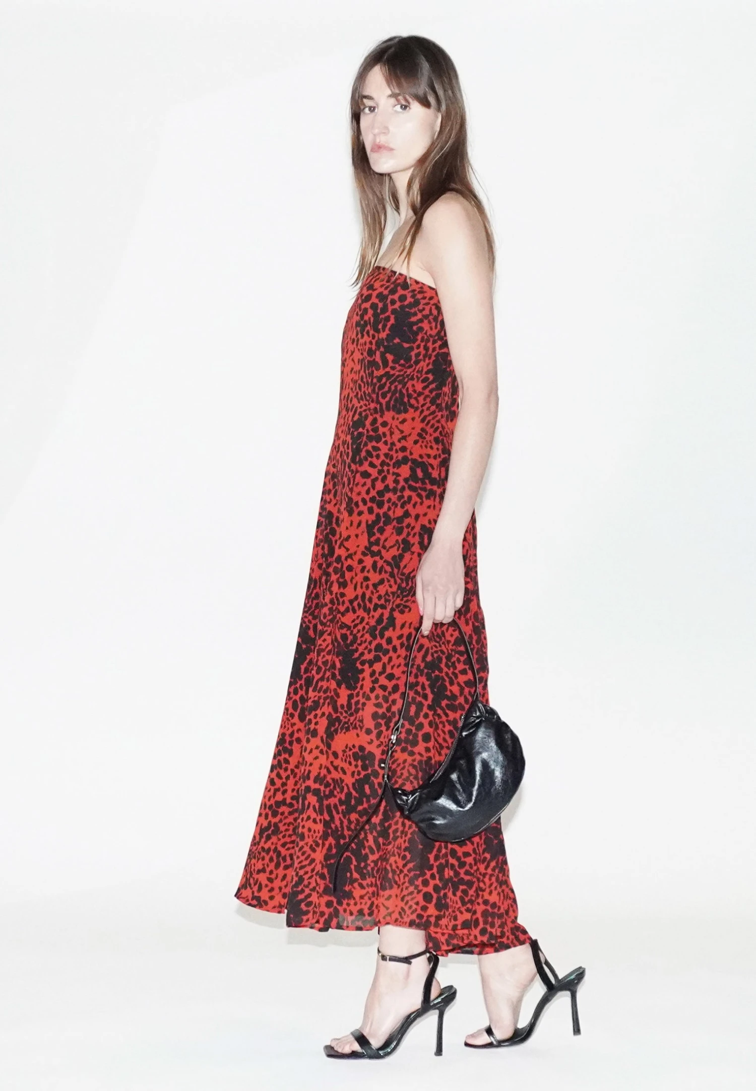 The Charm dress is a bandeau midi dress in our abstract animal Energy print in red and black, showcasing a fit-and-flare silhouette with a short lining and a full skirt. Stylish and chic, it offers a fashionable statement for any occasion. The Dress comes with an inner boob tube for extra support. Wear with sandels or dress up with heels and a blazer. The model wears a size S. Length from top: 111 cmÂ