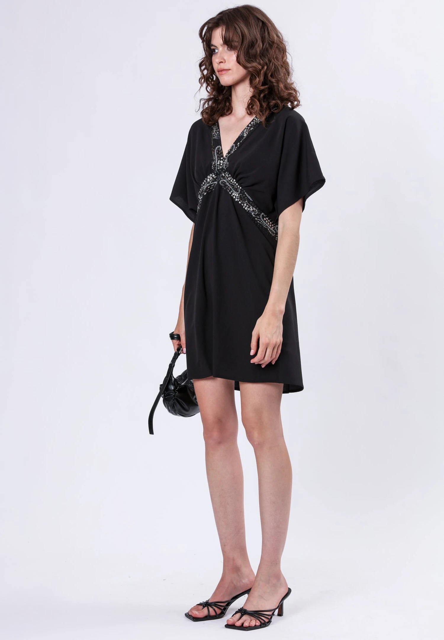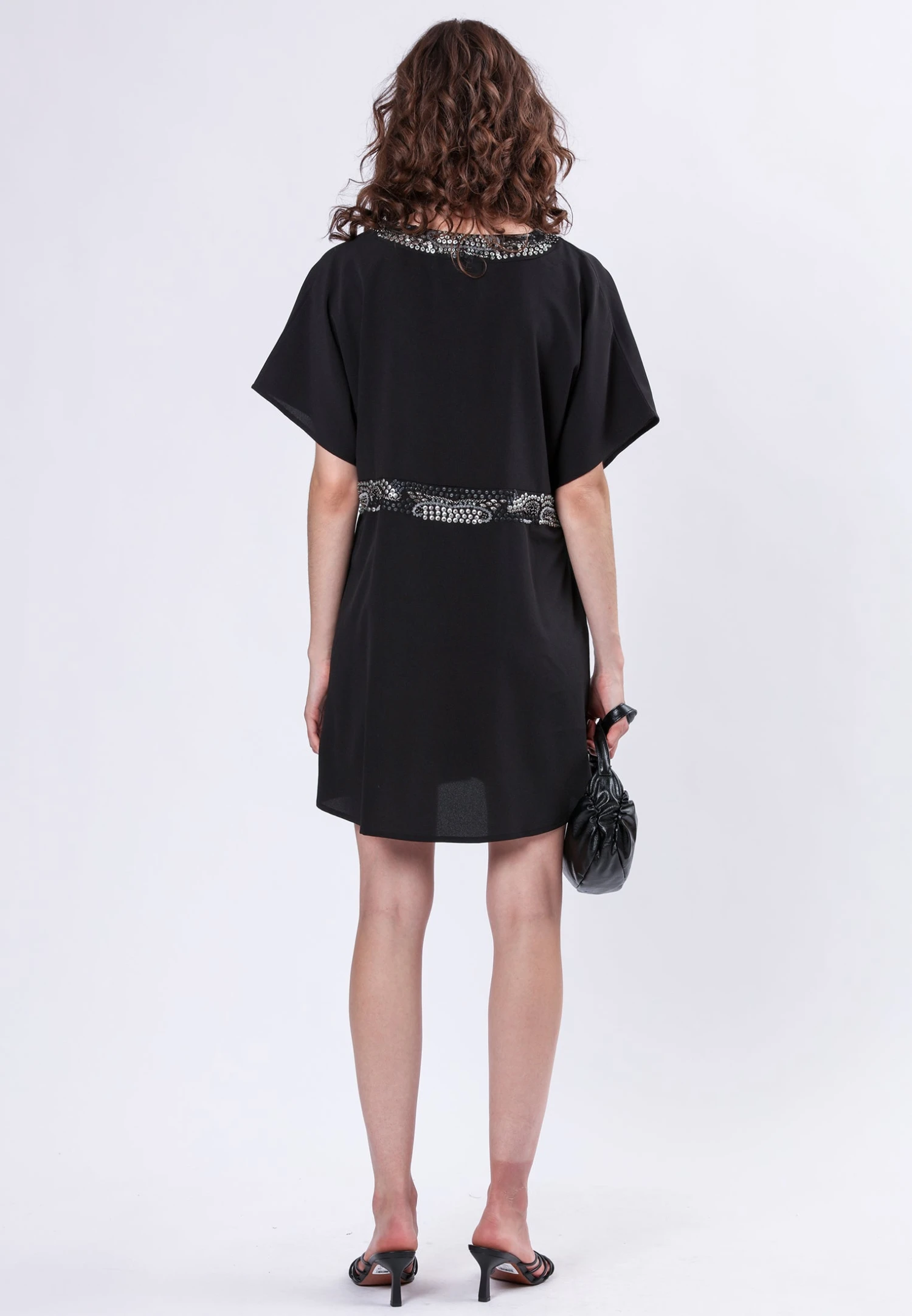 The Crystal dress is a short, loose-fit dress crafted from elegant black crepe. It features intricate beading detailing around the neckline and waist, adding a touch of sophistication. With its short sleeves, this versatile dress is perfect for various occasions. Effortlessly dress it up with heels and accessories or down with flats for a chic, adaptable style. The model wears a size S. Length from the top: 88 cm