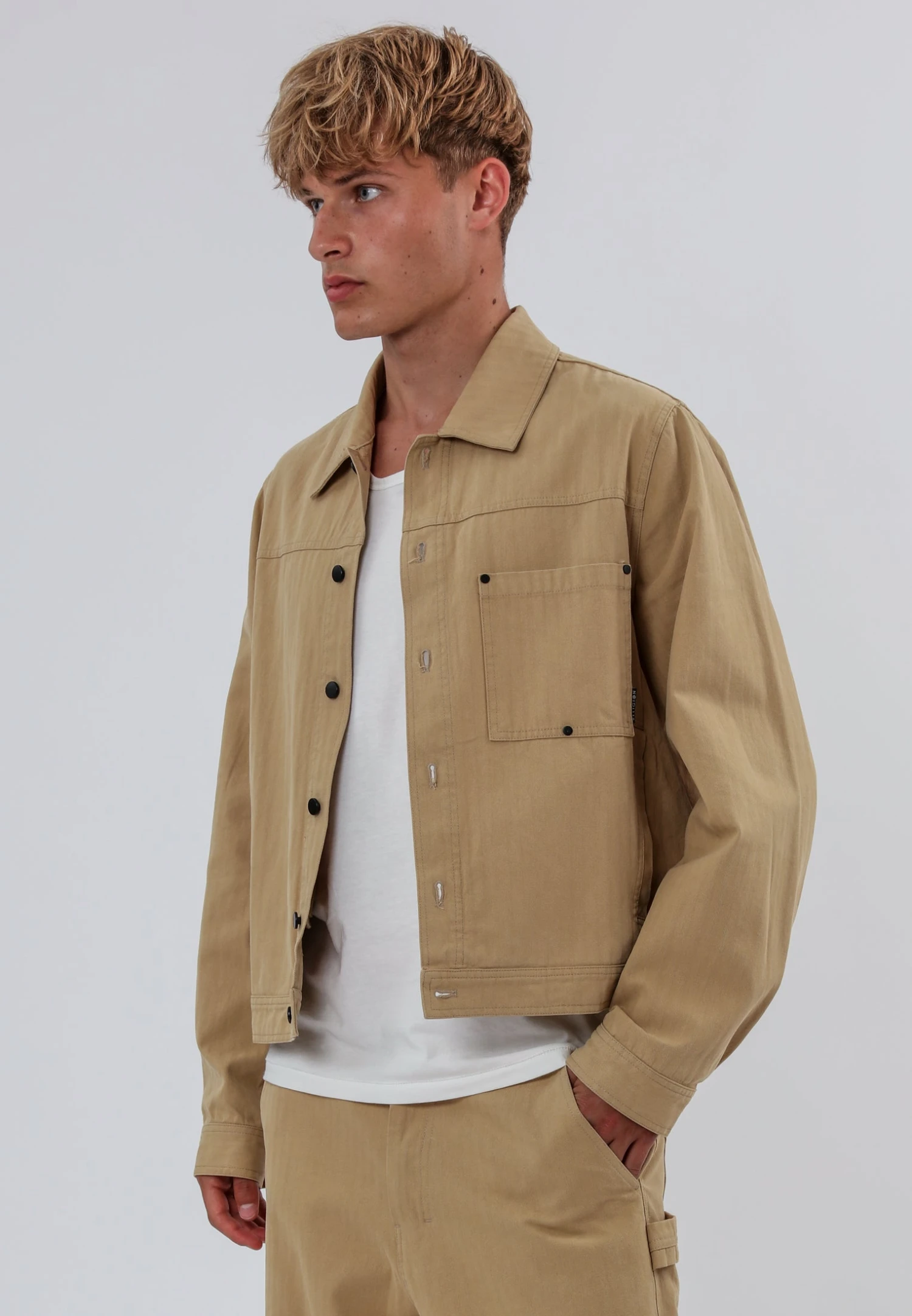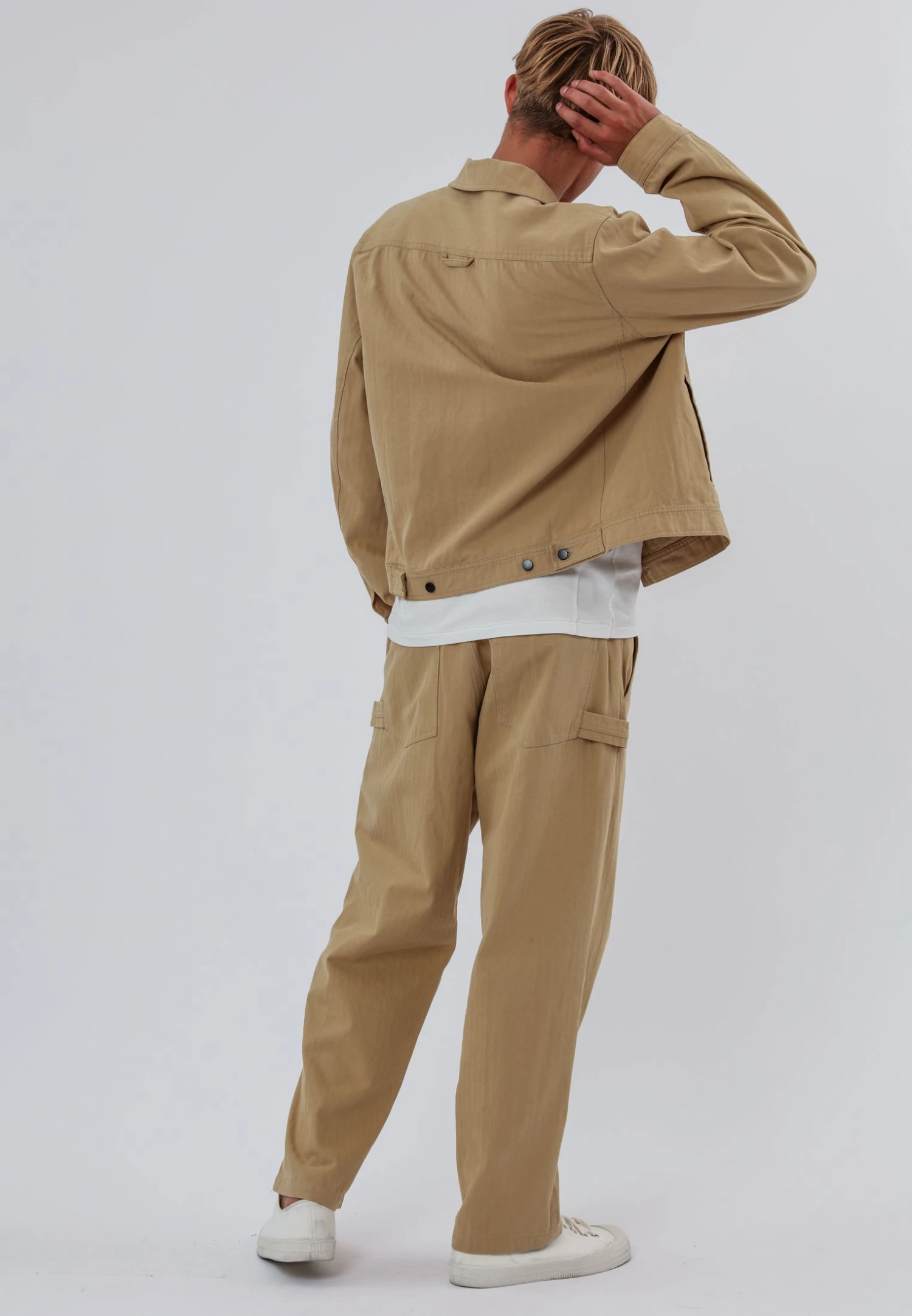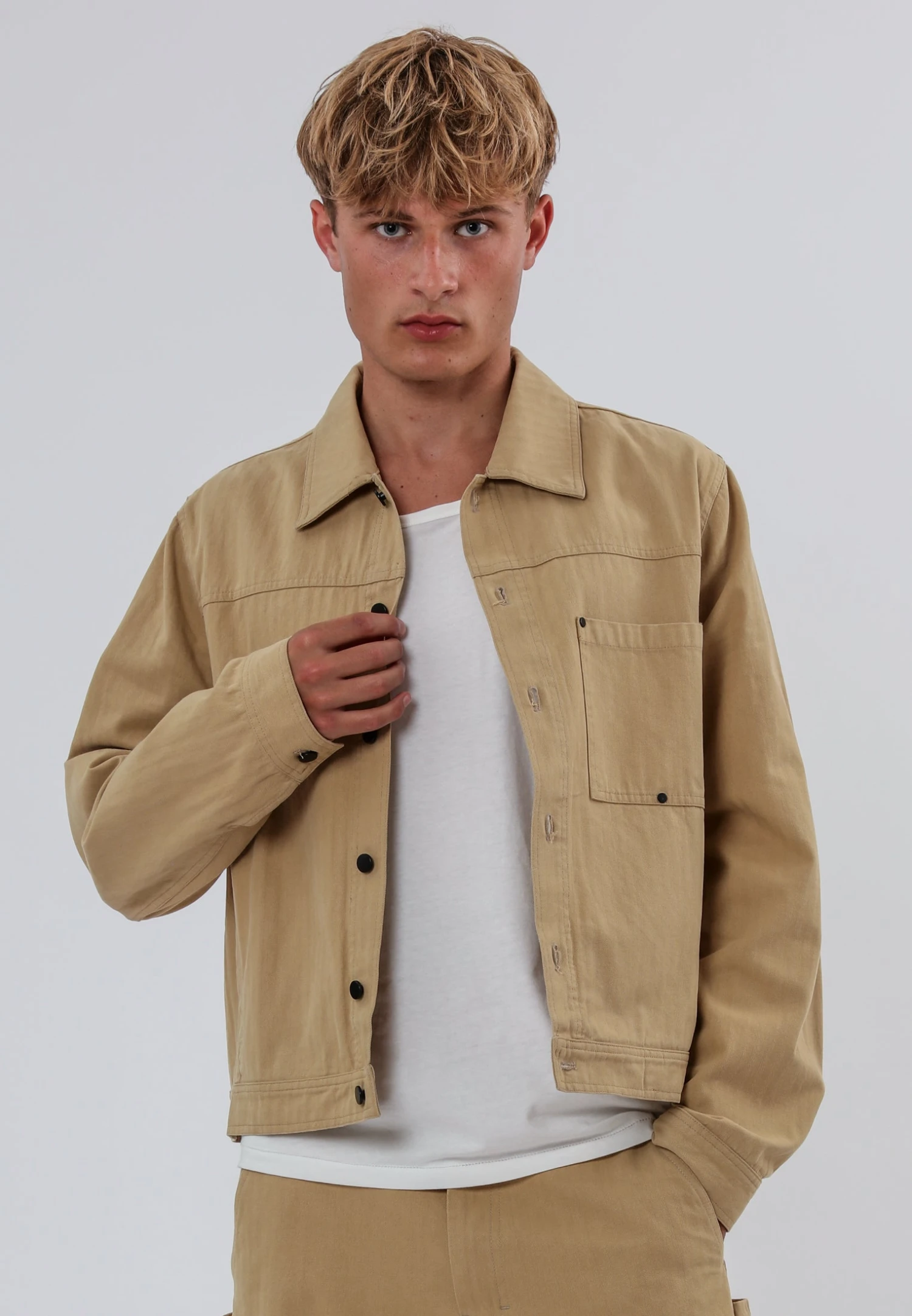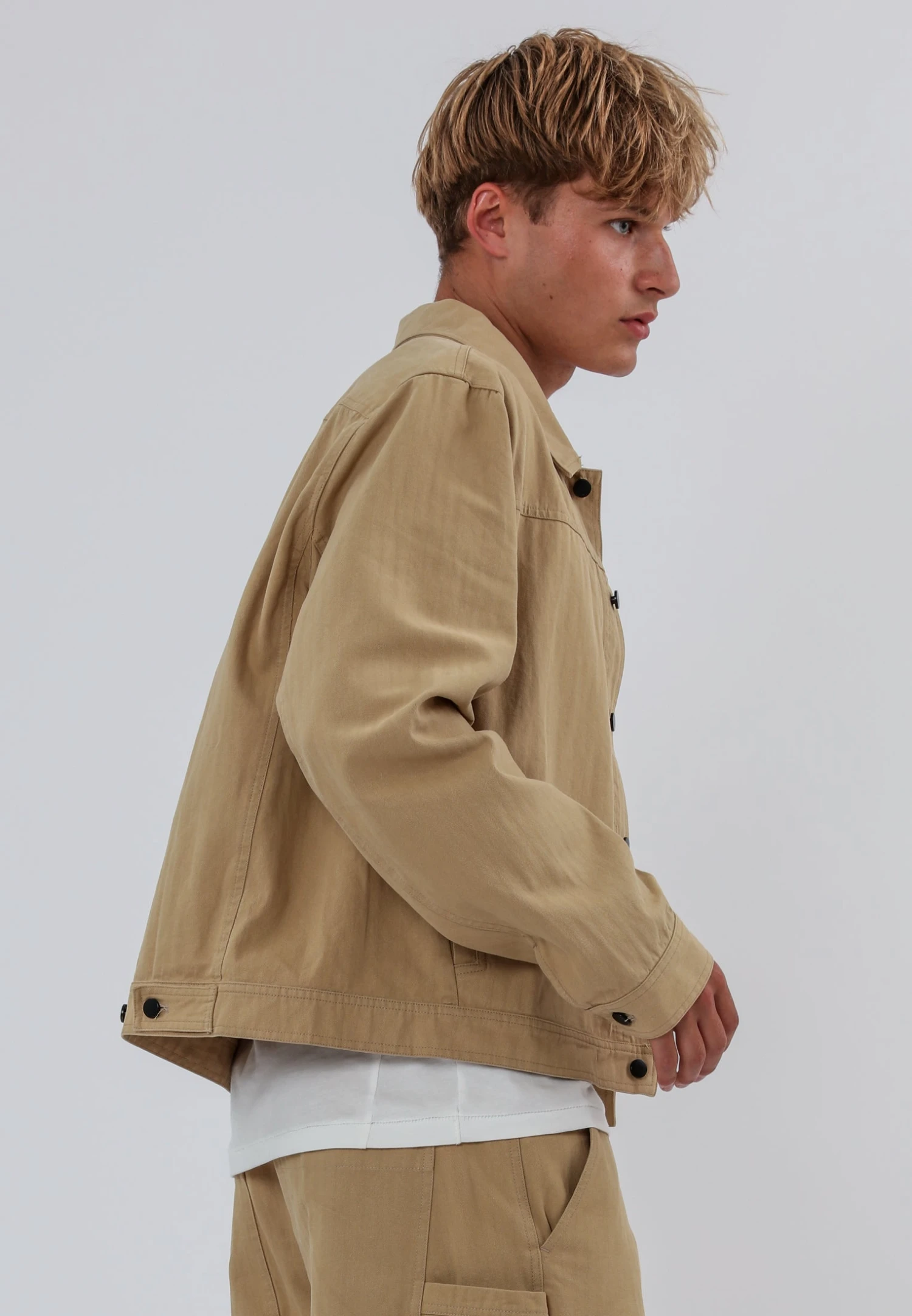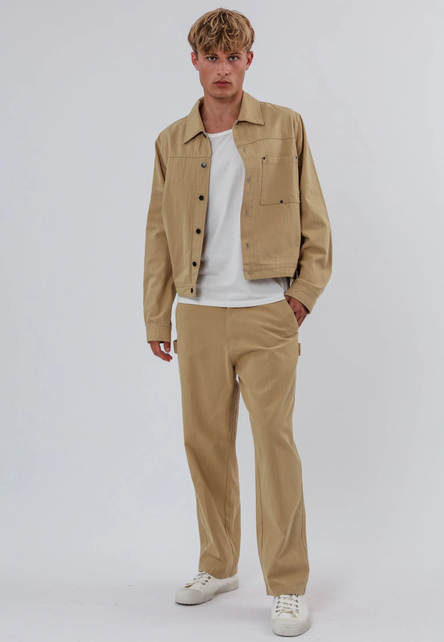 Complete your look with the Denim Jacket in sand. Designed in a stylish boxy fit, it features riveted chest pockets and adjustable waistband tabs, letting you customise the fit for effortless comfort. With the addition of convenient side jet pockets, it’s a timeless piece that works for any occasion.