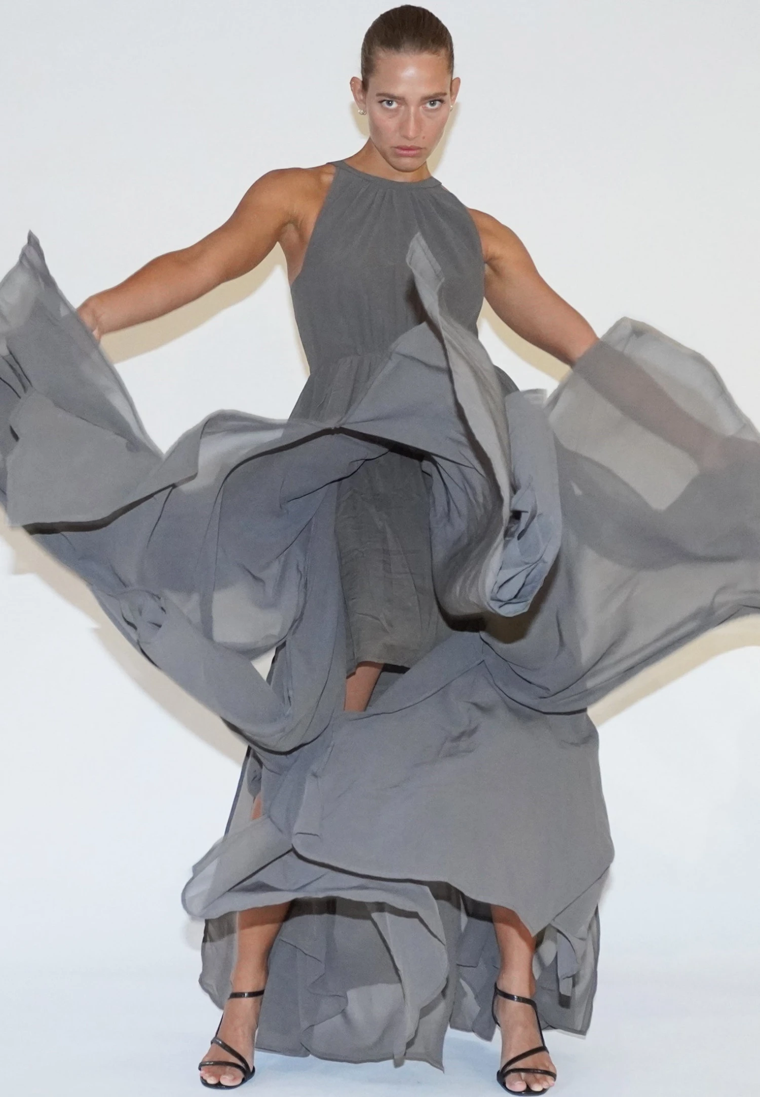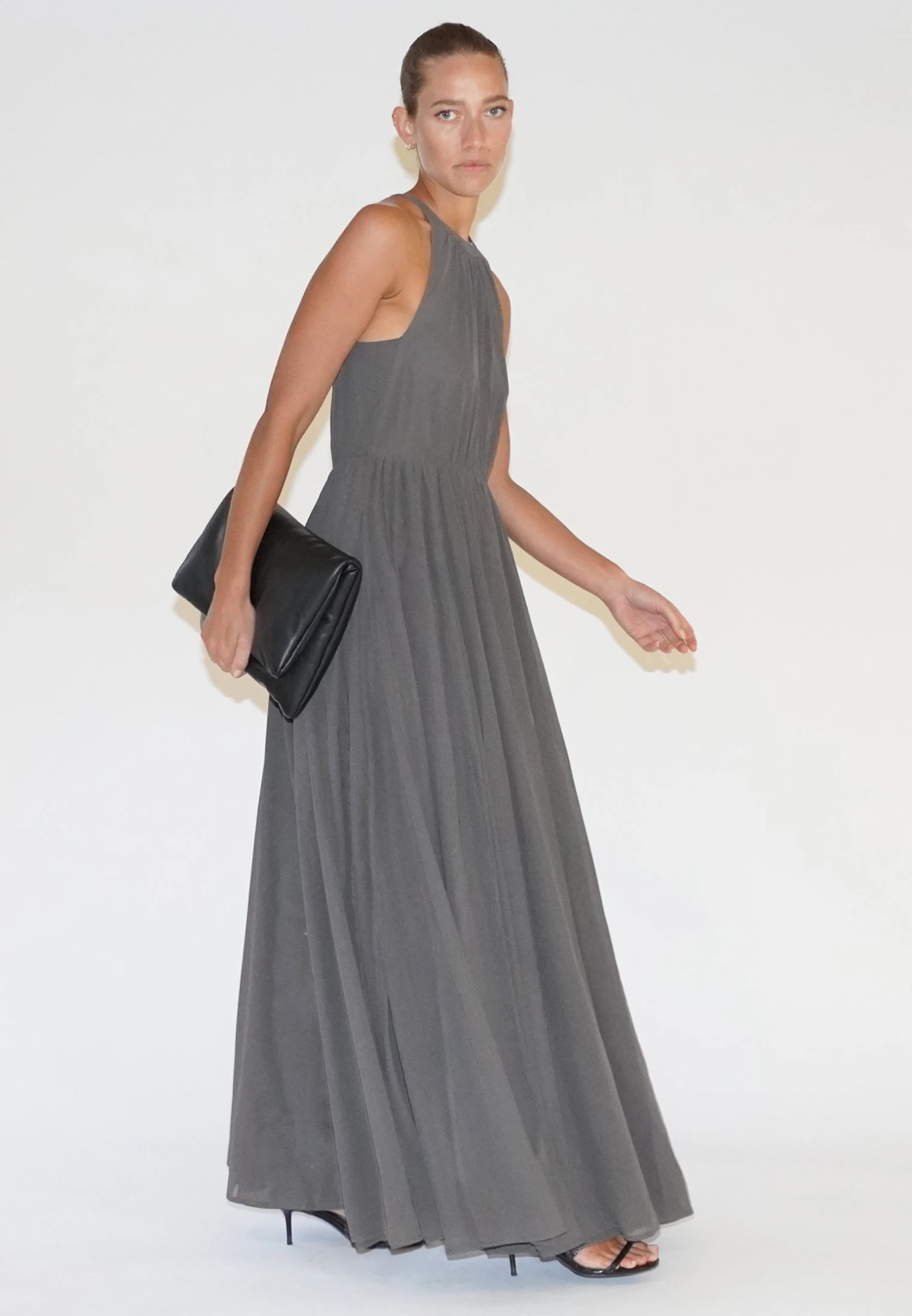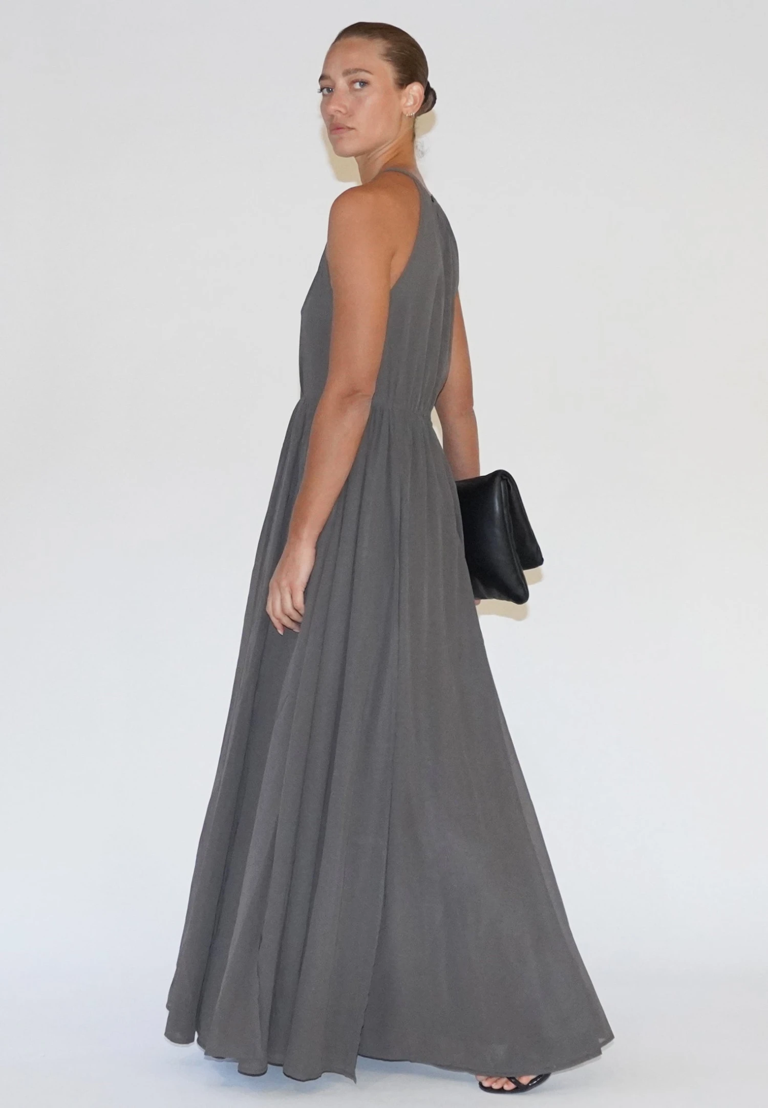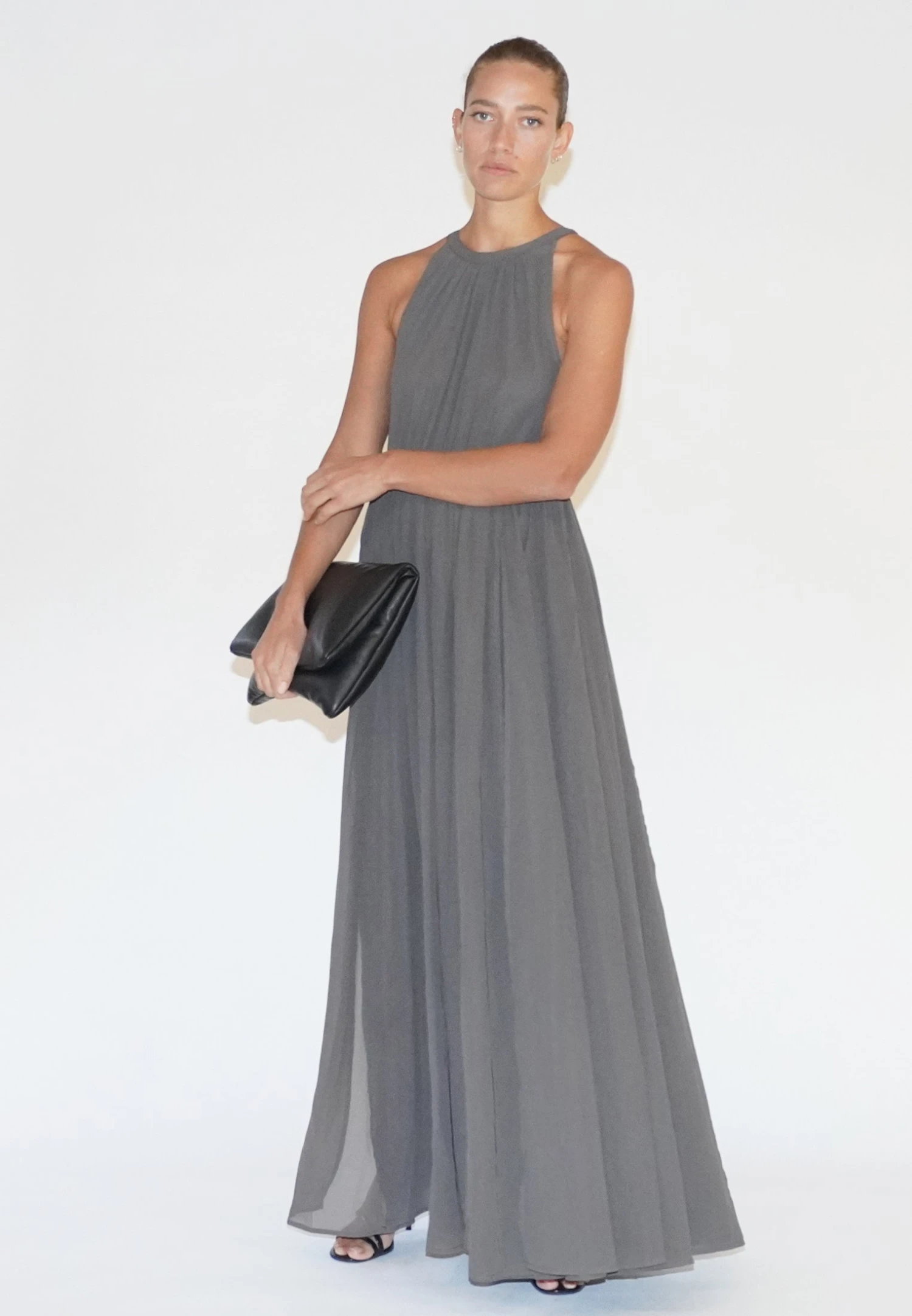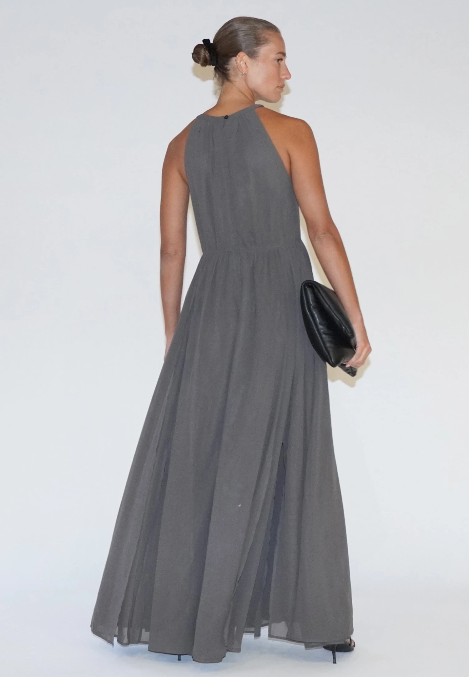 The Dusk dress in brown the ideal occasion dress for this season. The halterneck dress features a high waist, fitted bust and flowing skirt made from 2 layers of fabric with high slits for a dramatic effect. An effortless style that looks great on its own or worn with a blazer. The dress is a maxi length which might need to be altered if its too long for you. The model is wearing a size S.Â