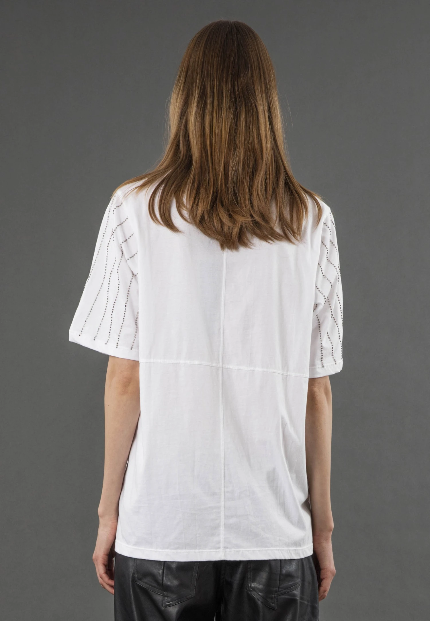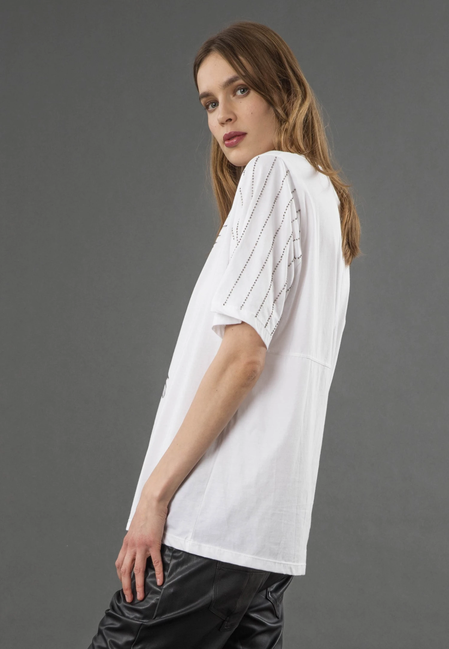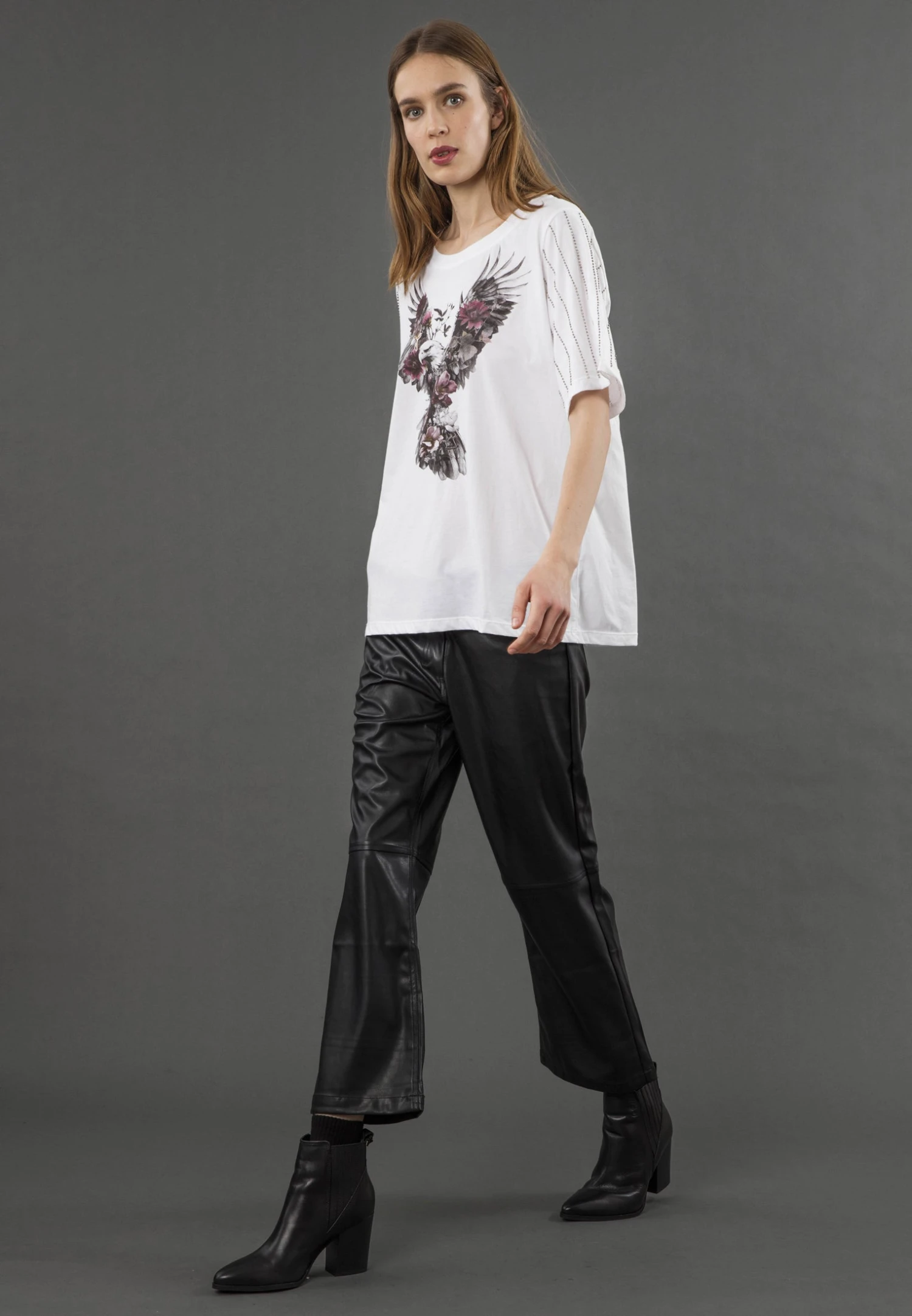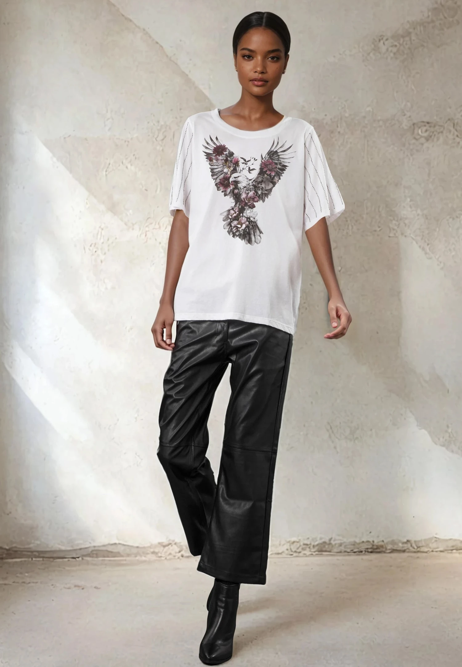 The Eagle tee updates our boyfriend style with beaded sleeves and in this seasons Eagle graphic on a white base. With a round neckline, relaxed fit, and hip length, it’s crafted from soft cotton jersey. Perfect with jeans or a maxi skirt for everyday effortless style with a hint of sparkle. The model wears a size UK 10. Length from the top: 67 cm