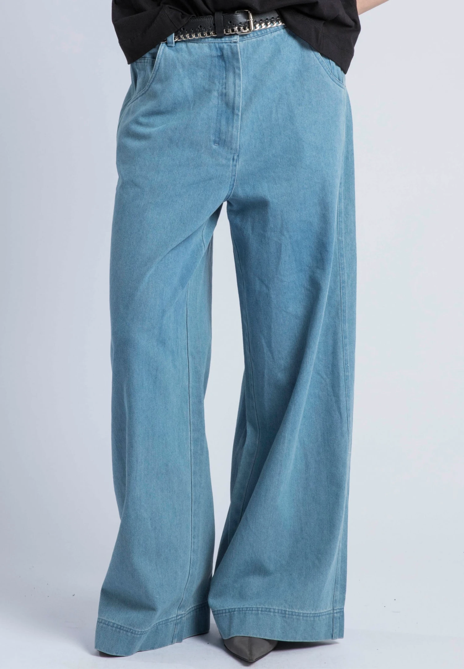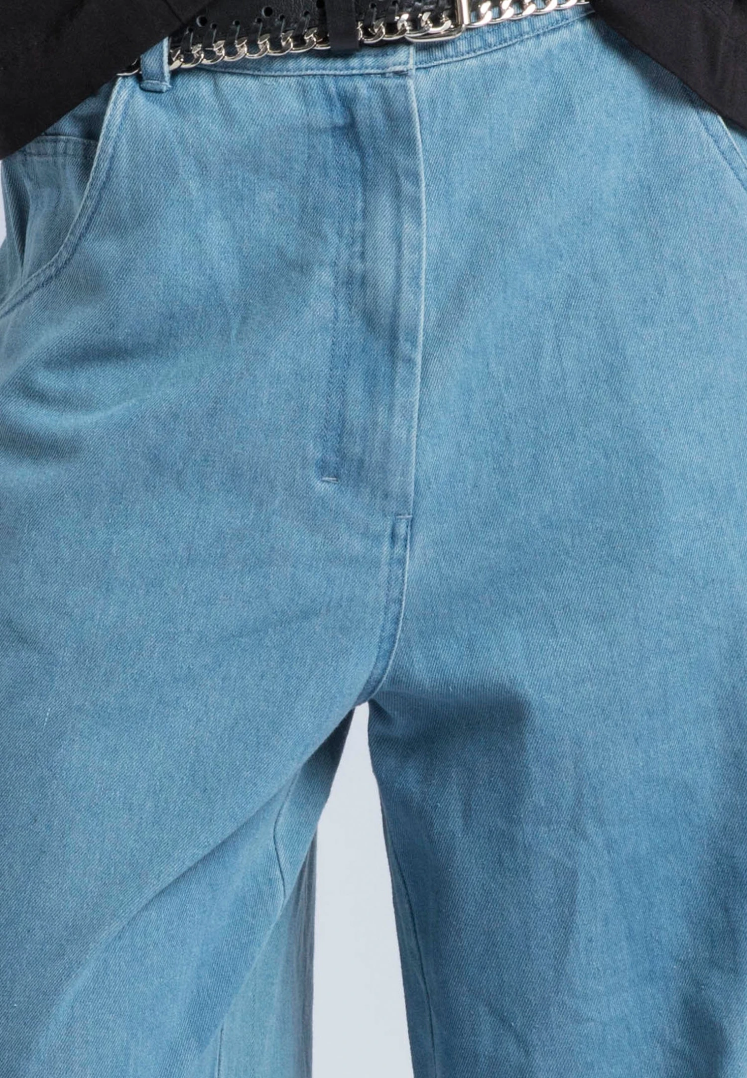 The Eccentric trousers are wide-leg jeans in washed blue, featuring a classic 5-pocket style with button fastening and belt loops. With a mid-rise and a Religion tab at the back waistband, they offer versatile styling options. Dress them up or down with heels or trainers for effortless chic. The model wears a size S. Inseam length: 77.5 cm