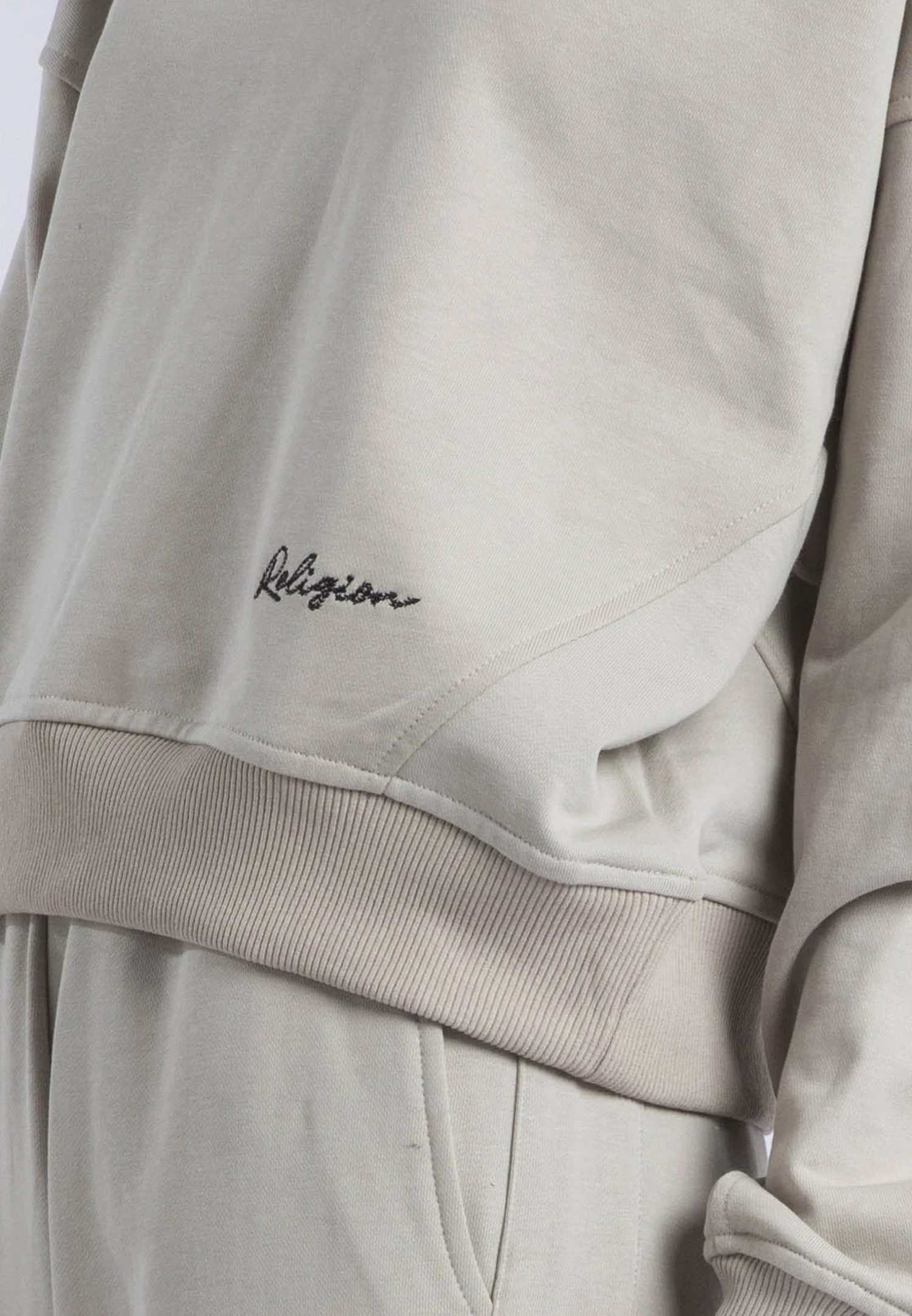 This hip-length, crew neck batwing sweatshirt in stone combines comfort and style with its relaxed fit and long sleeves. Made from soft cotton, it features our RELIGION signature embroidery on the front hem. Pair it effortlessly with jeans for a casual look or with matching trousers for a coordinated, trendy outfit. The model wears a size UK 10. Length from the top: 57 cm.