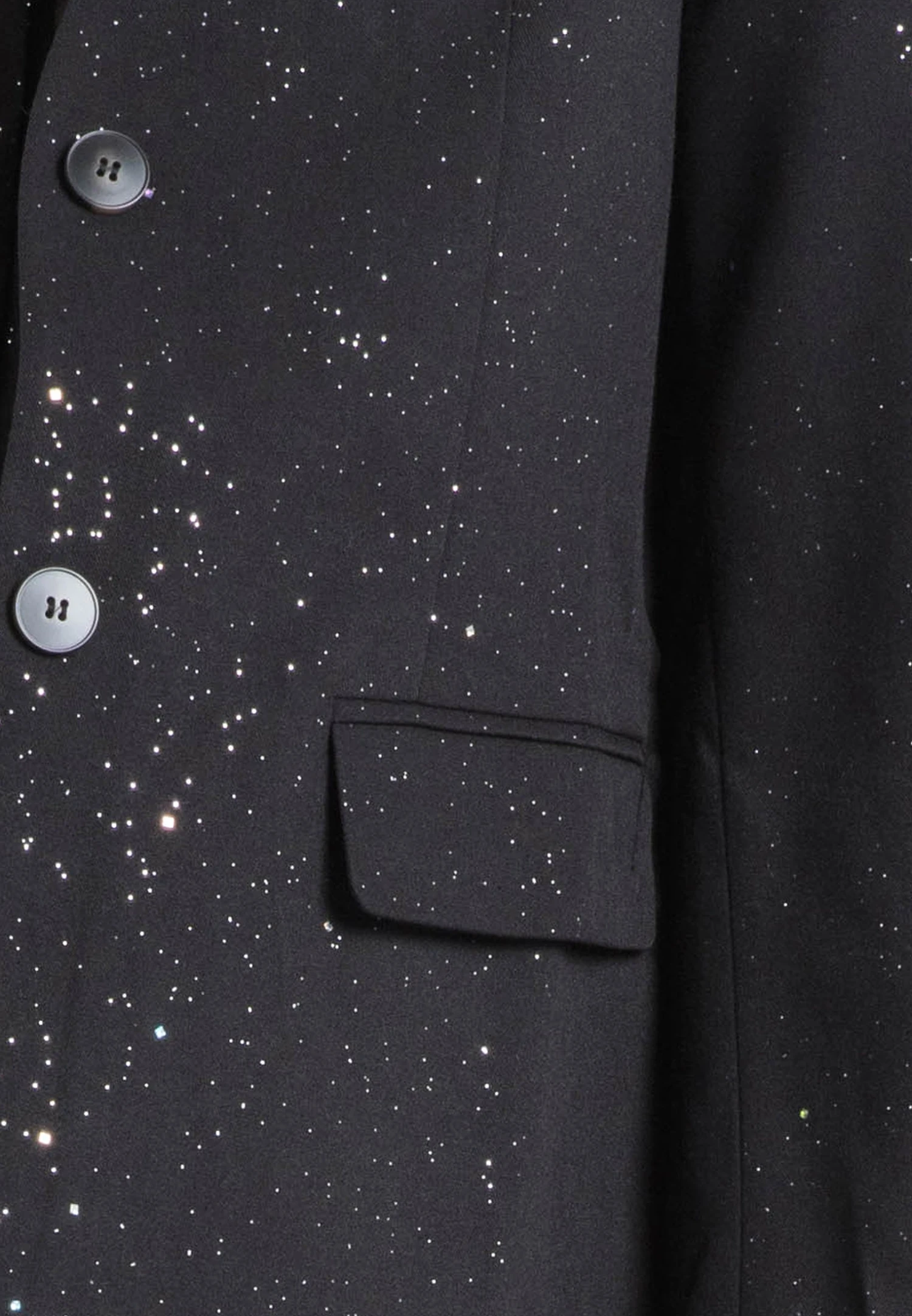 The Emily Jacket is a versatile and stylish addition to any wardrobe. This collarless blazer features a sleek button closure and a relaxed fit, offering both comfort and elegance. Designed with long sleeves and a hip-length cut, it strikes the perfect balance between casual and polished. Crafted in a black with a silver sparkle, it comes with a detachable loose tie that can be styled around the neck for a chic look or worn as a belt to cinch the waist. Perfect for dressing up or down, the Emily Jacket effortlessly transitions from daytime to evening occasions. The model wears a size UK 10. Length from the top: 74 cm