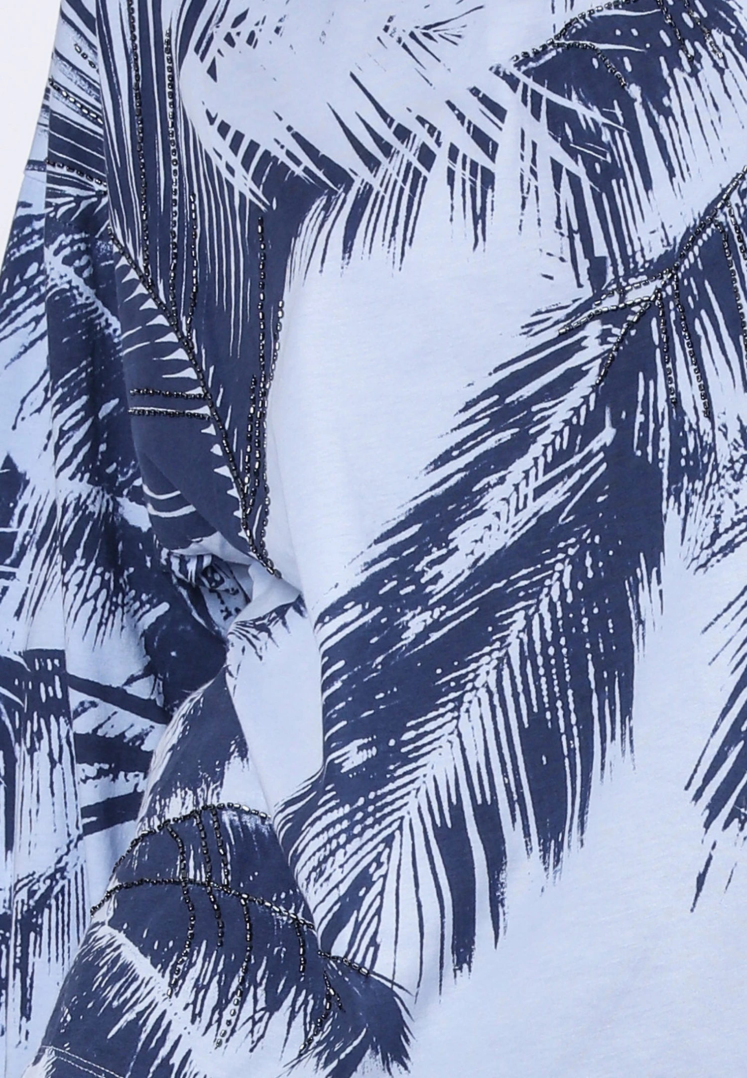 The Epidote top features a striking palm print in blue tones with beading detail. This hip-length, oversized top is perfect for year-round wear and has long sleeves and a versatile round neck that can be worn on or off the shoulder. For a less oversized fit, go down one size. Ideal for both work and evening outings worn with tailored trousers or jeans. The model wears a size S. the Length is 62 cm.
