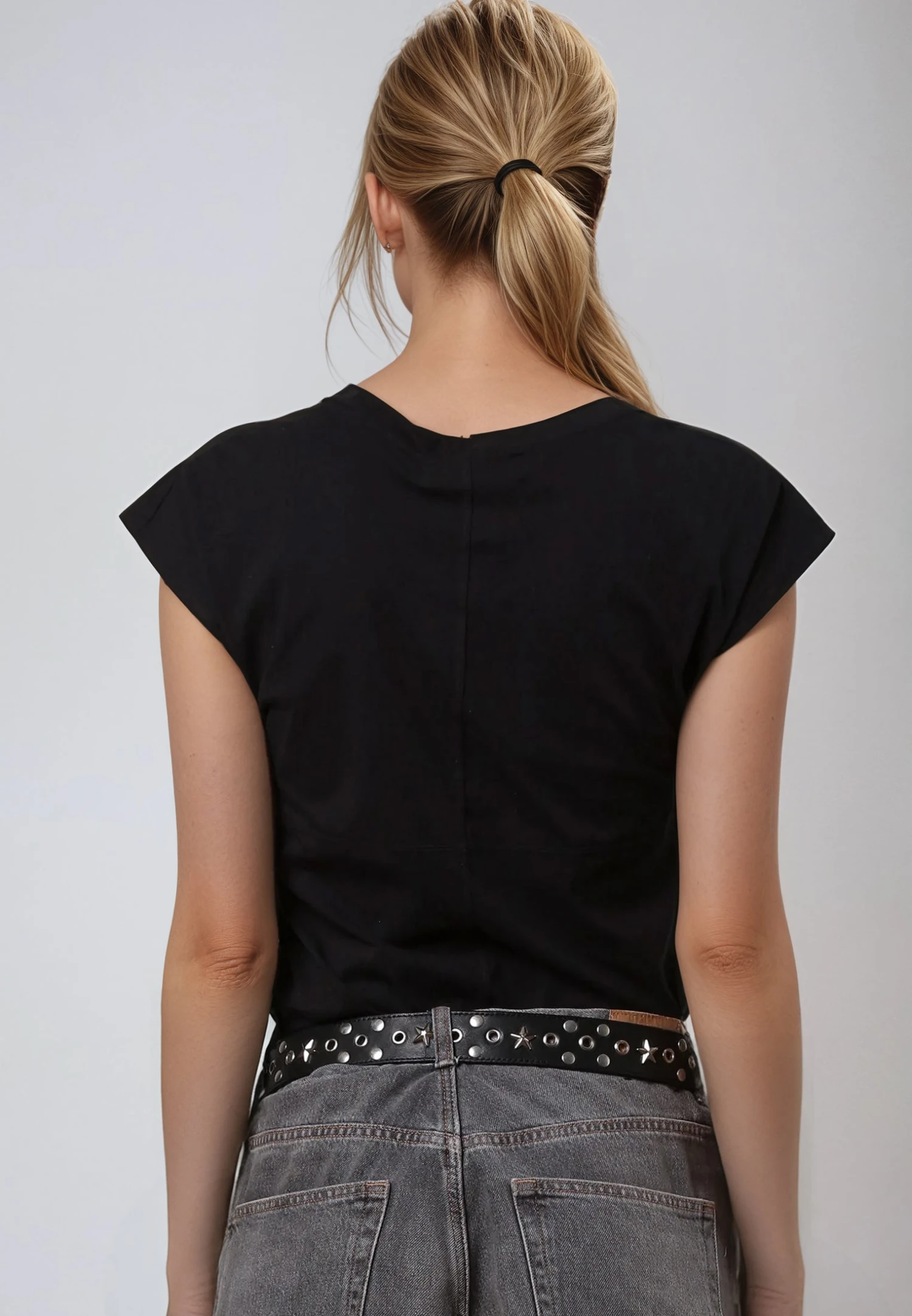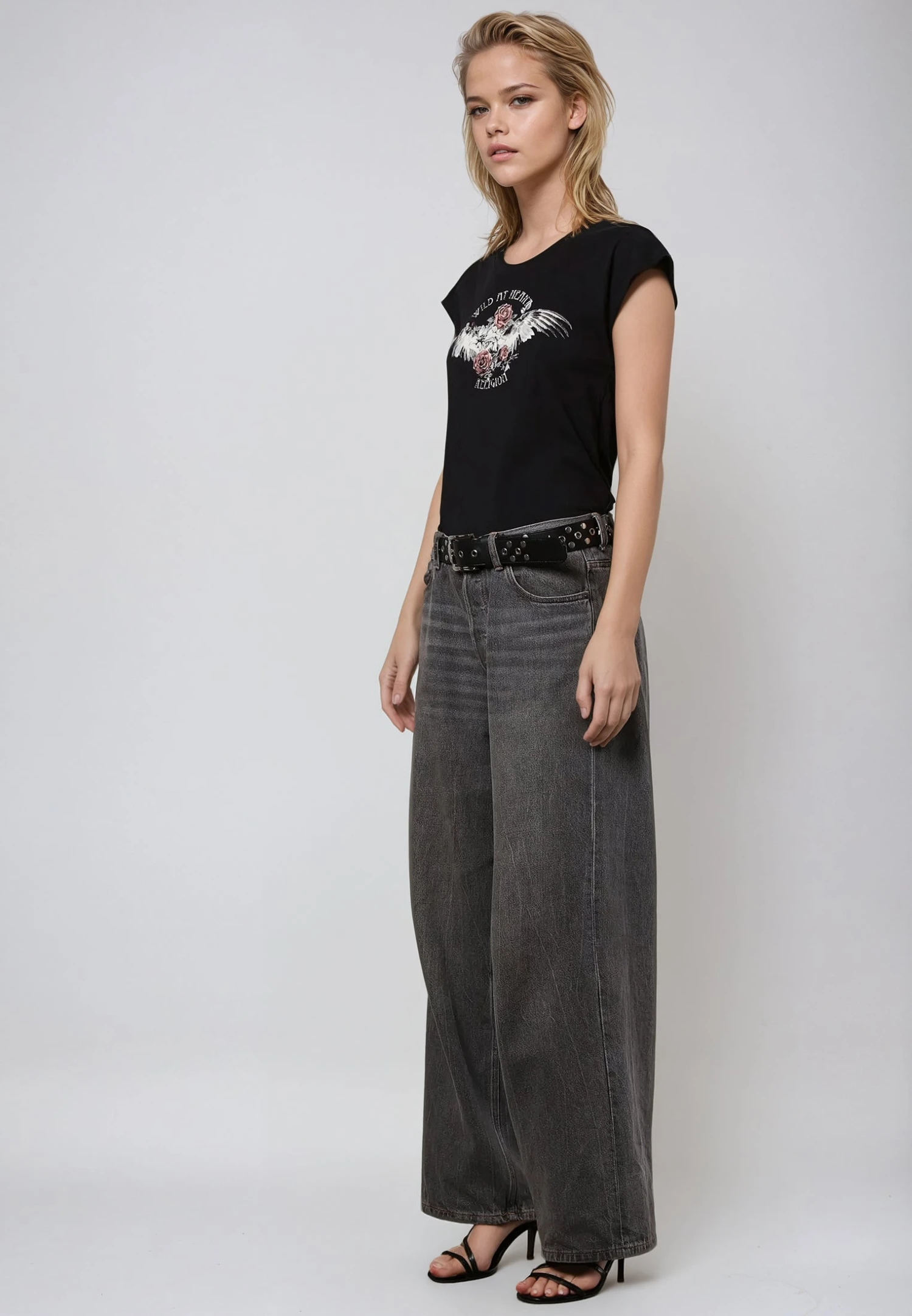 Elevate your style with the Fallen Tee. This cotton jersey t-shirt boasts a round neck, short sleeves, and our “Wild” graphic with beading on a black base. With a relaxed, easy-fit and a curved hem, it’s the ultimate graphic tee in soft, comfy jersey. Wear with jeans or wide leg trousers and a leather jacket. The model wears a size S. Length: 62 cm.