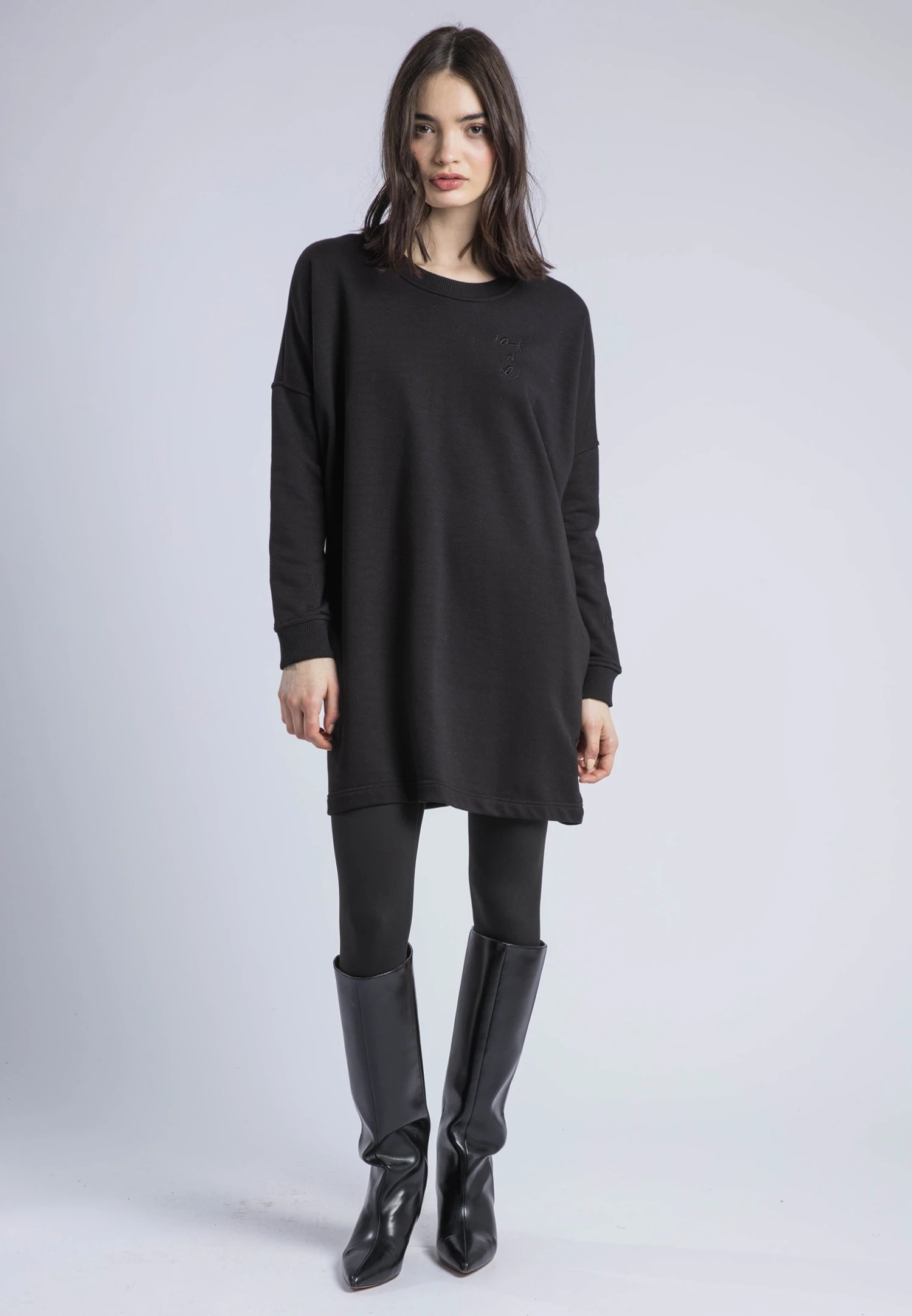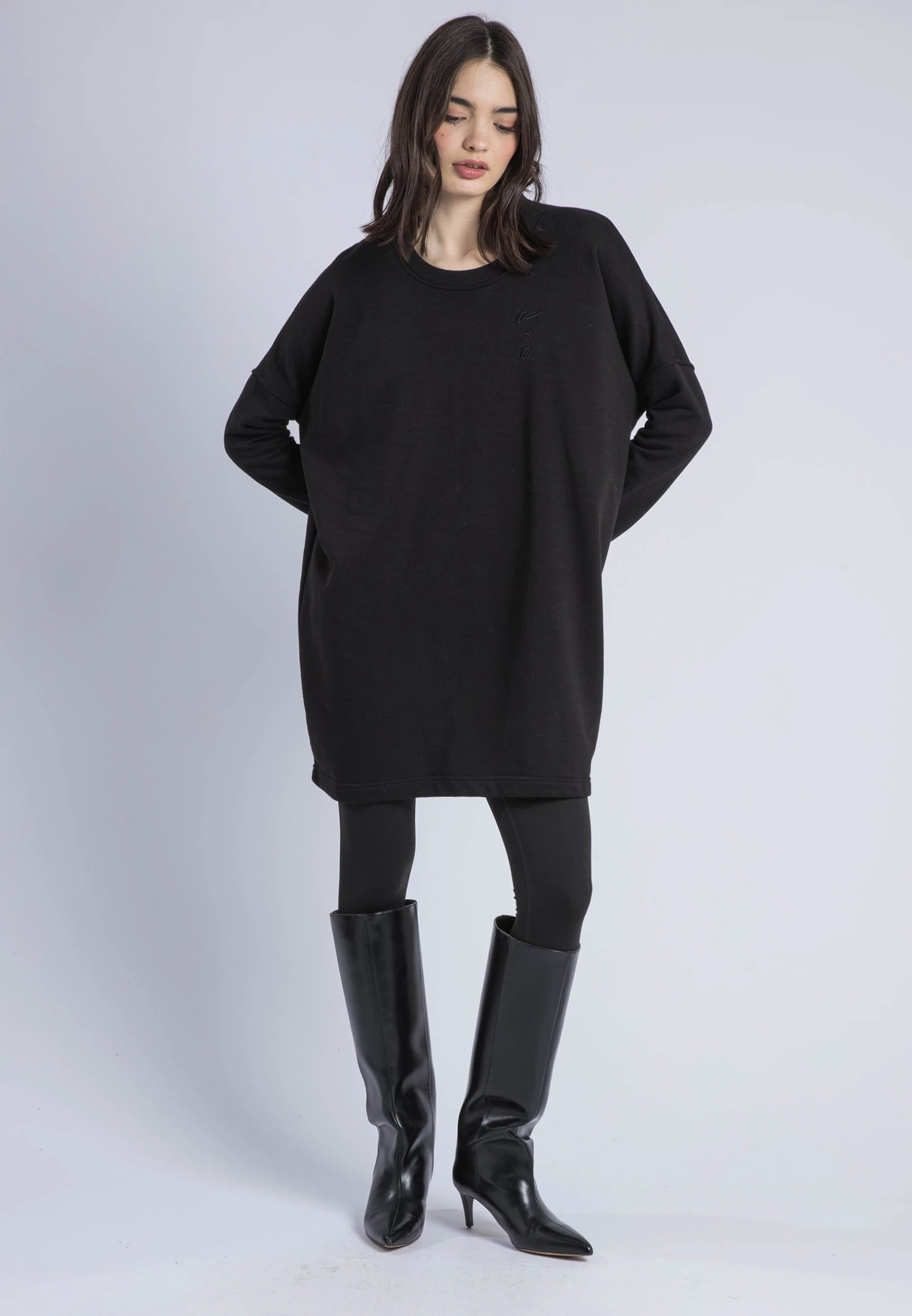 The Flora Sweat Dress in black combines comfort and style in a short, oversized design with long sleeves and a classic round neckline. Featuring our rock ‘n’ roll embroidery on the chest along with Religion’s signature embroidery at the side, this piece adds an edgy twist to casual wear. Its relaxed fit and unique details make it a perfect choice for laid-back yet stylish looks. Wear with ankle boots or high heels. The model wears a size UK 10. Length from the top: 87 cm.