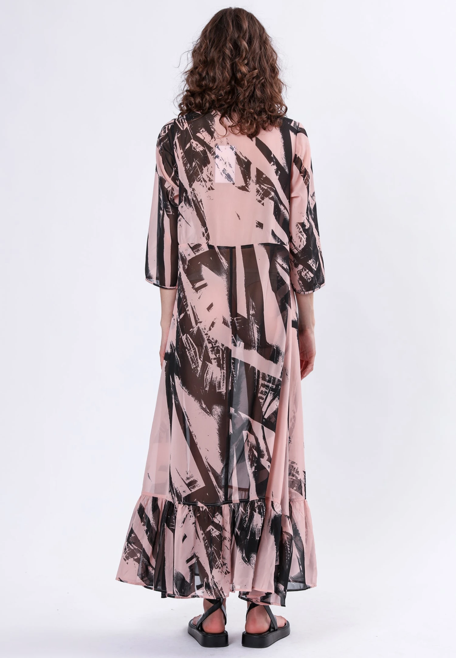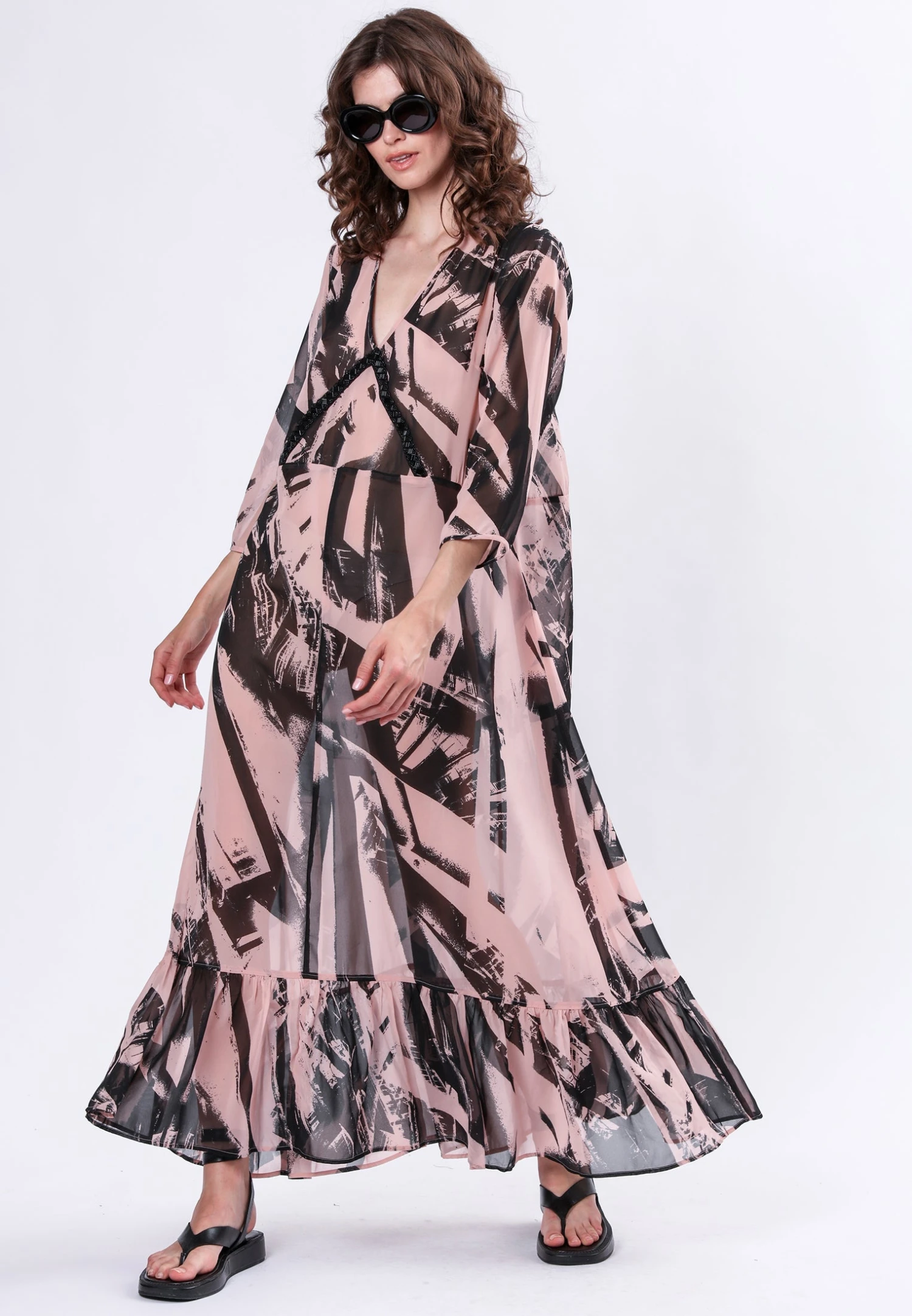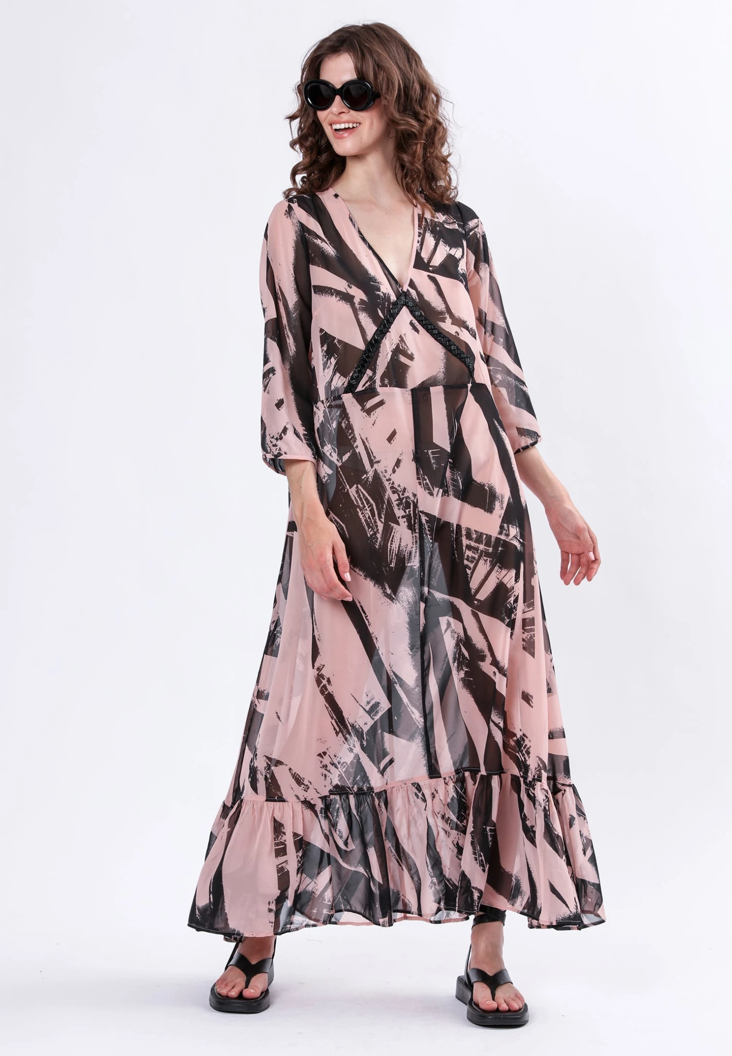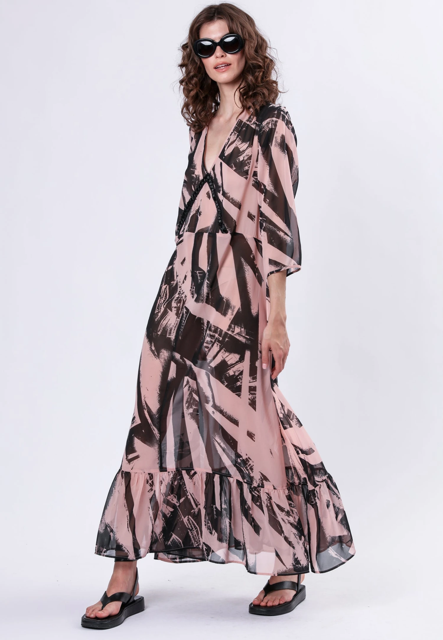 The Hematite maxi dress is a captivating blend of elegance and charm crafted in our abstract Parallel print in pink and black tones, evoking a sense of timeless sophistication. The V neckline, flowing silhouette and 3/4 sleeves add a touch of allure, while the loose camisole lining ensures comfort and ease of movement, with adjustable straps for a personalised fit. The front of the dress features a delicate beaded trim detail, adding a hint of sparkle and refinement. Perfect for special occasions or holiday gatherings, the Hematite dress exudes effortless style and versatility. Embrace the allure of summer nights or tropical escapes in this stunning piece that captures the essence of laid-back luxury. The model wears a size S. Length from the top: 142 cm