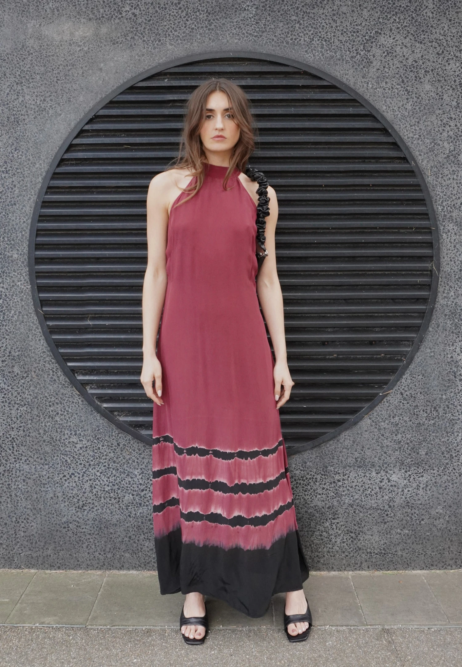 The Hidden dress is crafted in a viscose silk-feel fabric cut to an elegant midi length with tie dye in dark red and black. This flattering style features a halter neck with button fastening, has a regular fit and a cut out at the back. perfect for any occasion and great also worn with a blazer. The model wears a size S. The garments needs a gentle steam before trying on as the fabric might crease during shipping. The dress is dry clean only. The tie dye is made by hand, therefore every piece is unique.