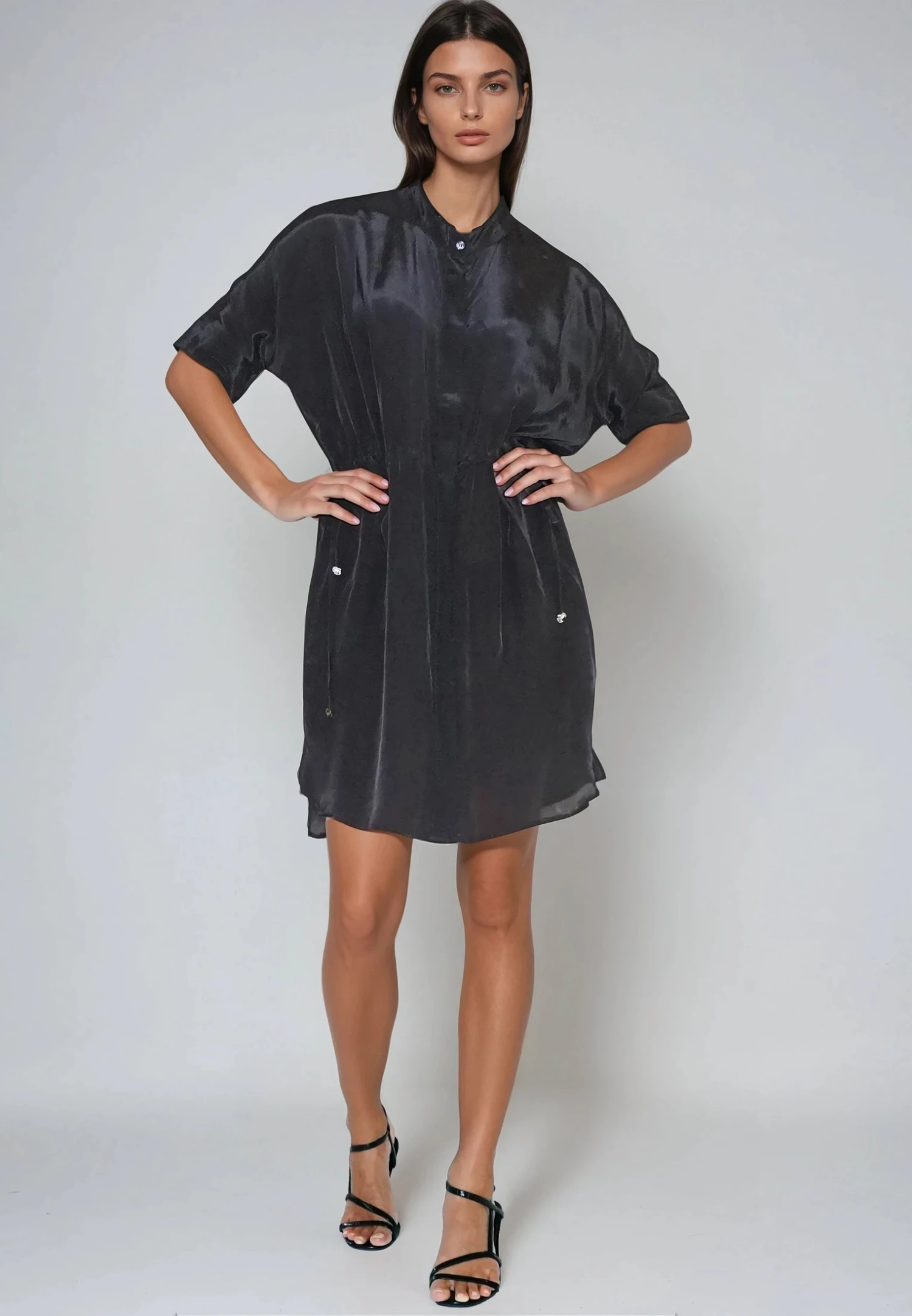 Introducing the Hidden Tunic Dress, an updated take on our best-selling silhouette. This short, oversized fit style features a grandad collar and an oversized fit. Crafted from vegan silk it offers a luxurious feel. With short sleeves, a stepped hem, and a tie waist adorned with skull cord ends, it exudes effortless style. The button-through placket allows for versatile wear, making it a must-have essential for your wardrobe. Model wears size S, length: 92 cm, chest circumference: 132