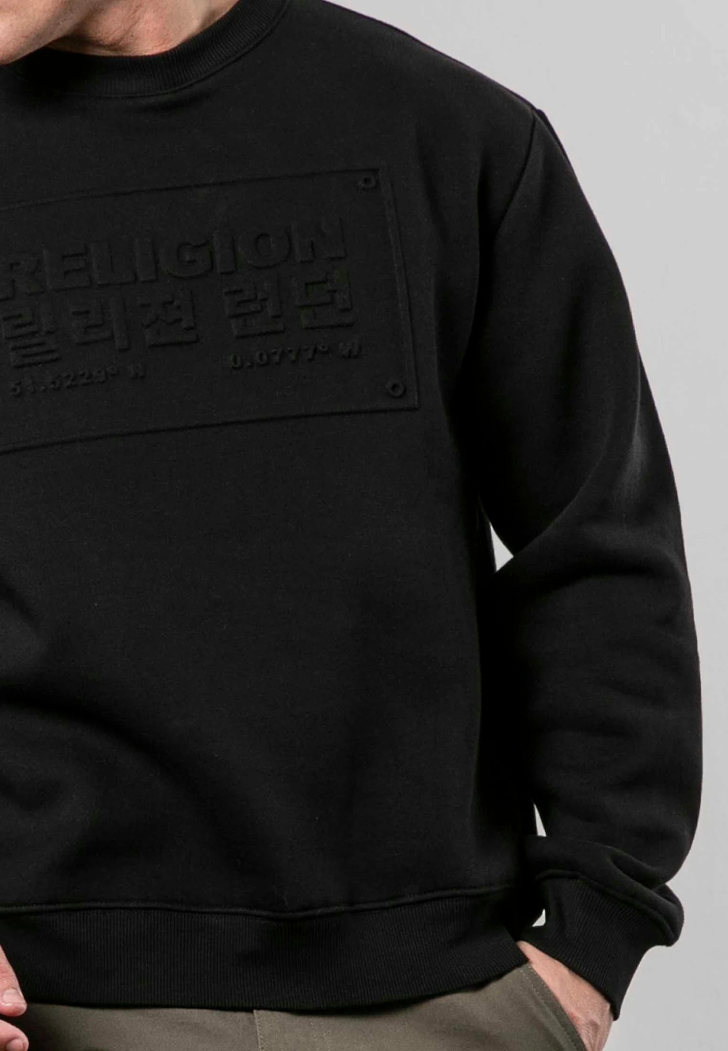 Look effortlessly cool in the Injection Sweatshirt. Featuring an embossed RELIGION Korean slogan, it is crafted from black brushed-back fabric for ultimate comfort and shaped to a regular fit with a crew neckline. Complete with ribbed collar, cuff and hem for added style and comfort.