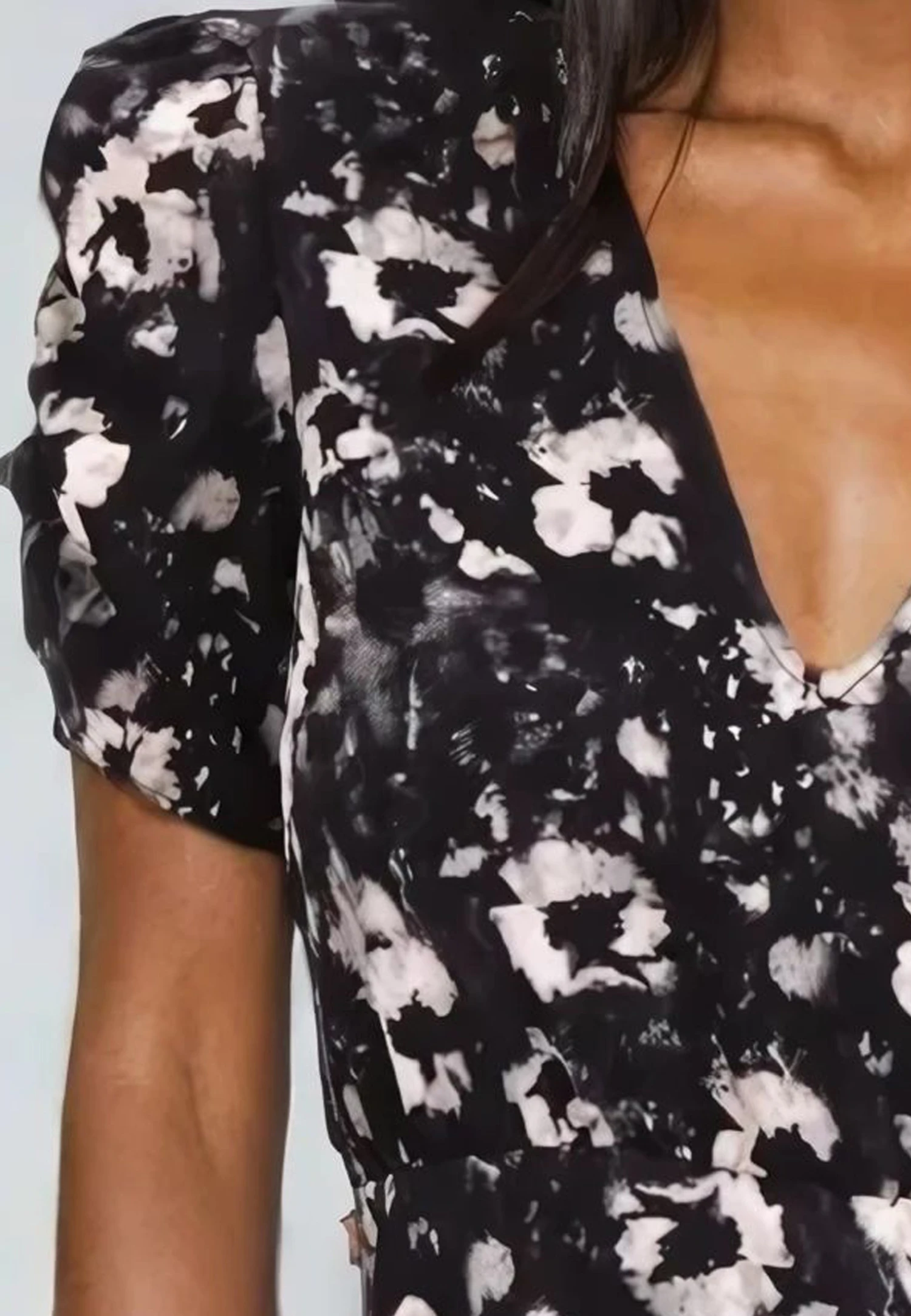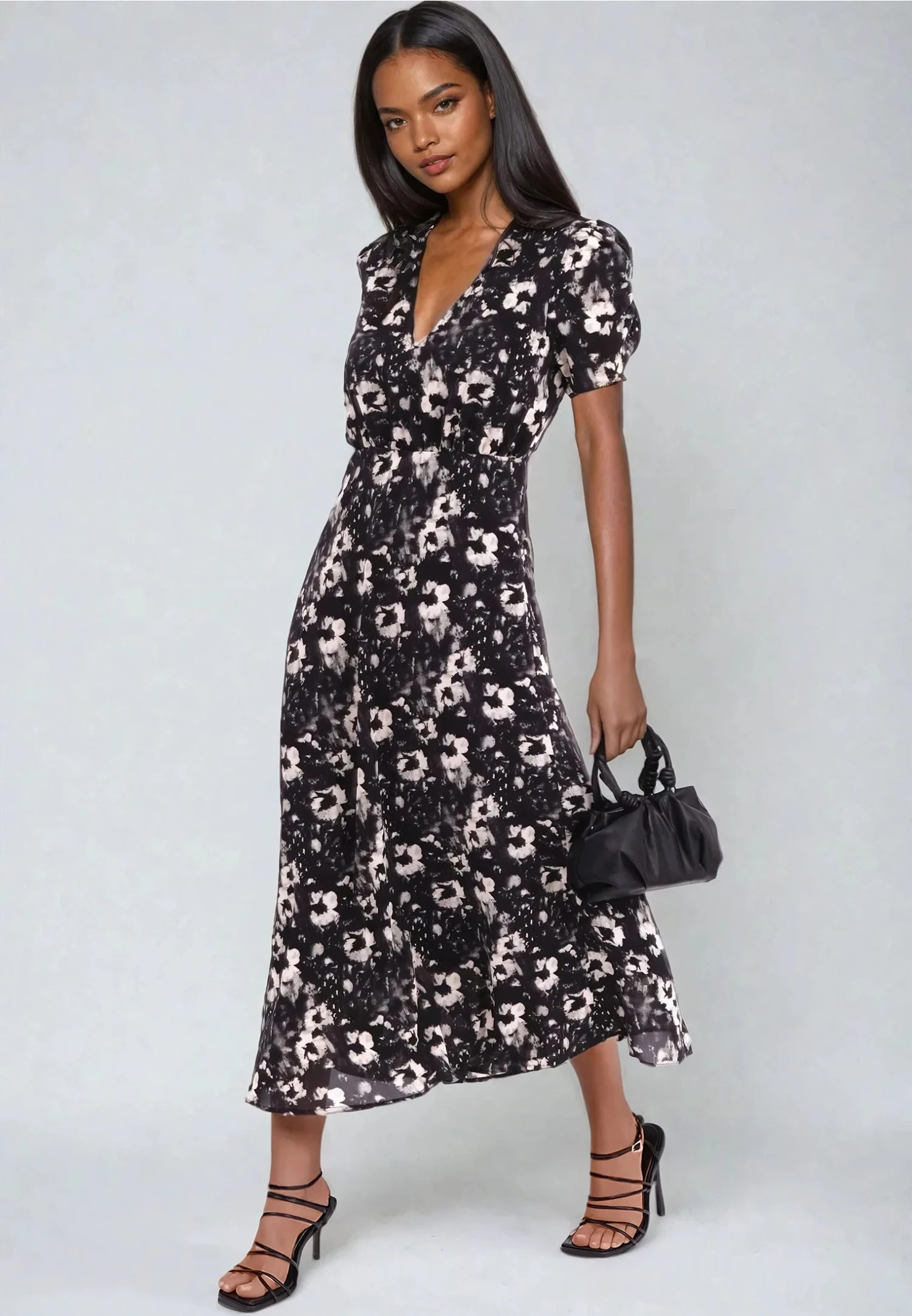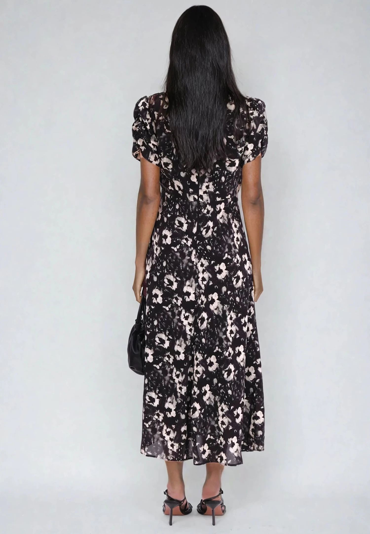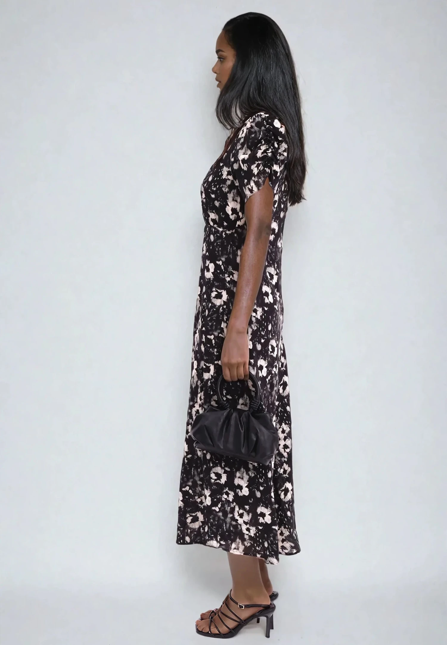 The Isabel Dress is a stunning maxi dress designed to flatter and enhance your silhouette. Featuring a V-neckline and ruched short sleeves, it adds a touch of elegance and texture to this classic style. The fitted bodice and bias cut create a graceful, flowing shape that beautifully highlights your figure. Adorned with an abstract floral print, this dress offers a modern yet timeless look, making it perfect for special occasions or evening events. The model wears a UK size 10. Length from the top: 130 cm