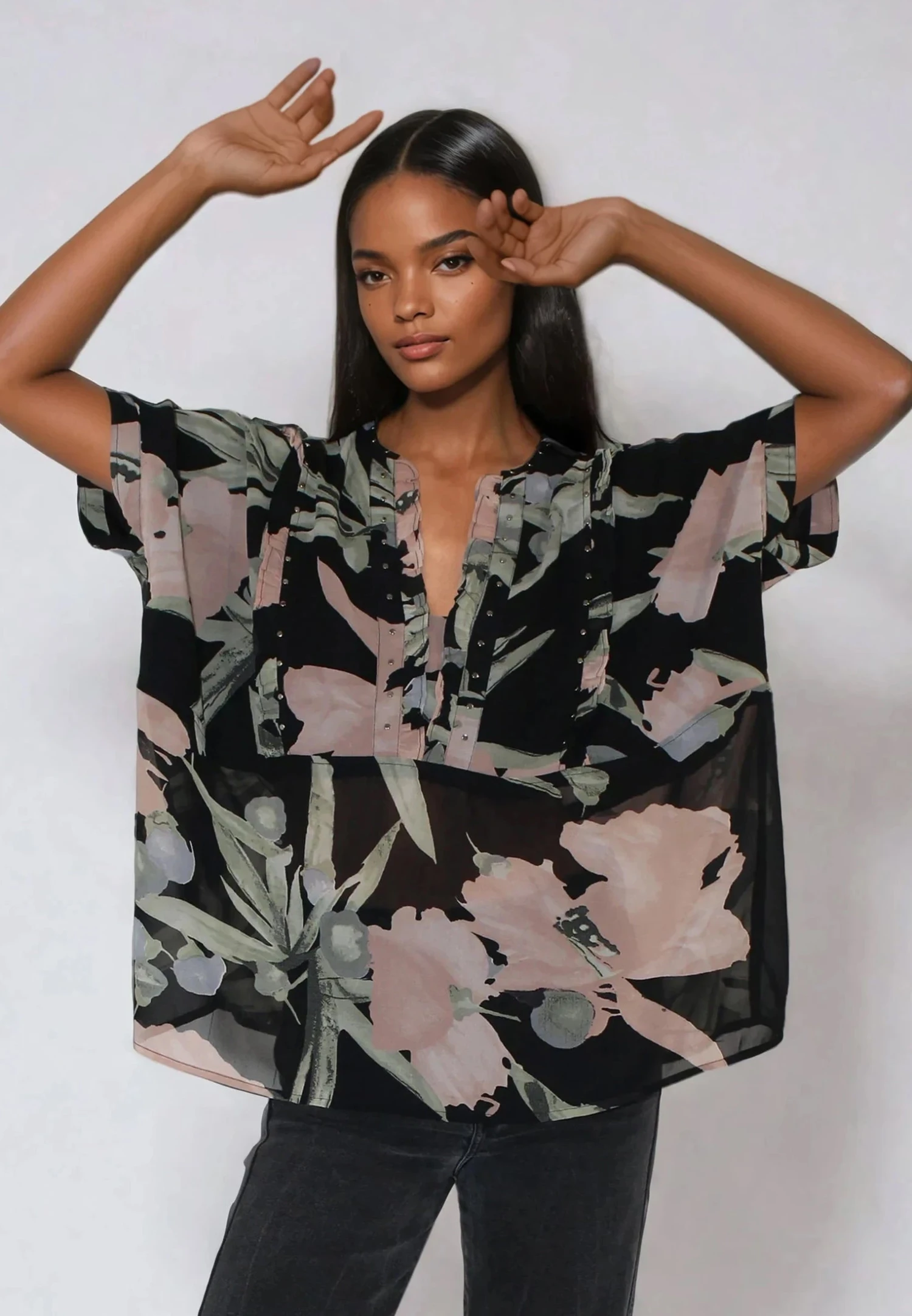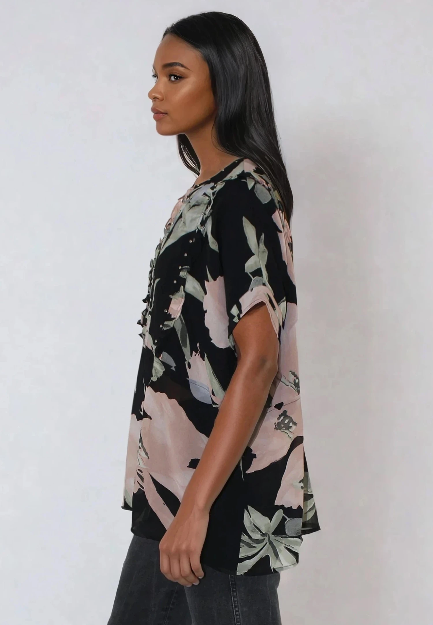 A reimagining of our bestselling shape, the Ivy Top offers effortless style with a romantic twist. Designed in an oversized silhouette, it features soft ruffle detailing along the front and neckline. With short sleeves and a relaxed, hip-length cut, it pairs perfectly with everything from tailored trousers to casual denim. Rendered in our tie dye print in pink and grey on a gold lurex, this top brings charm and ease to everyday dressing. For a neater fit, consider sizing down. Wear with the matching skirt for a matching outfit. The model wears a size UK 10. Length from the top: 62 cm