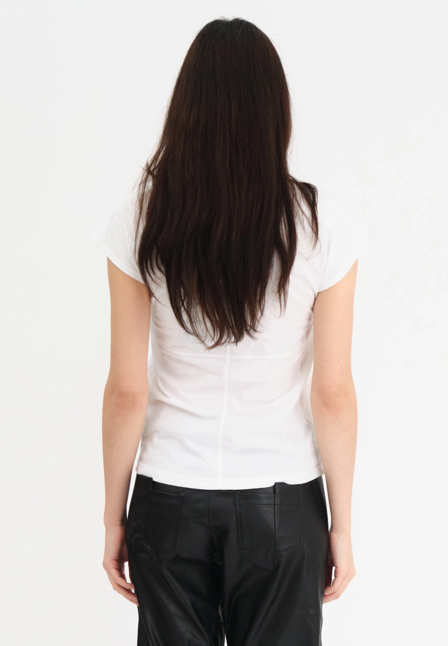 The Jilian tee is our best-selling fitted tee shape featuring our butterfly skull graphic with beading. With short sleeves, a hip-length, round hem, and scoop neckline, it’s fitted for a flattering silhouette. Wear it with jeans and a blazer for a stylish everyday look. Made in white soft cotton jersey. The model wears a size UK 10. Length from the top: 62 cm