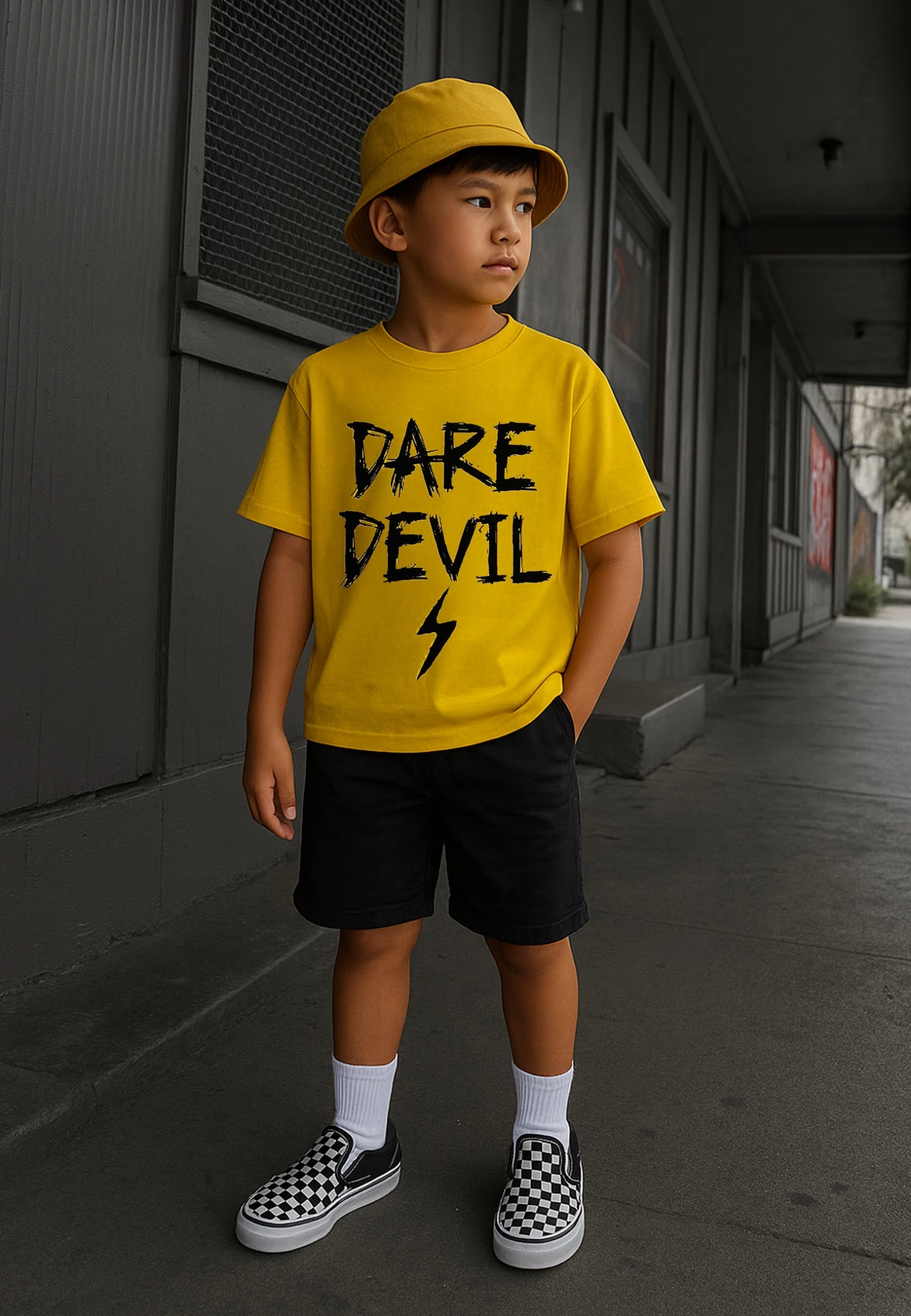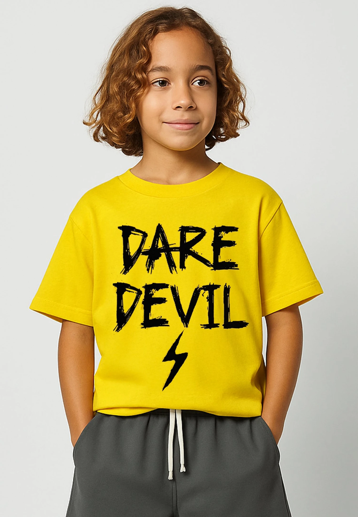 For the little thrill-seekers in your life, our Dare Devil T-shirt is the perfect pick. Made from soft, breathable cotton, this vibrant yellow tee features a bold ‘Dare Devil’ slogan on the front and a lightning bolt on the back – adding a spark of adventure to their everyday style. With a classic crew neckline and relaxed fit, it’s ideal for playtime, exploring or just embracing their fearless spirit. Ideal for both boys and girls.