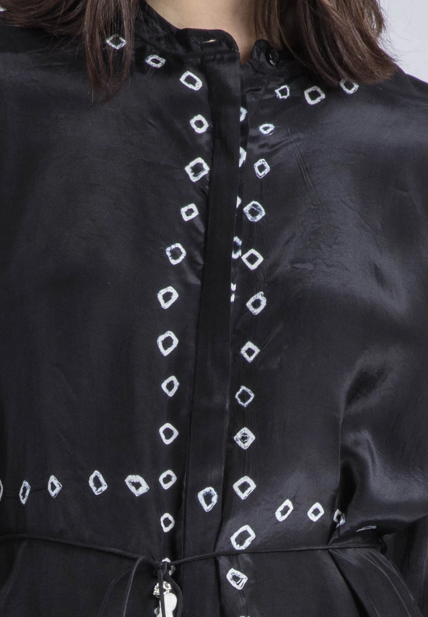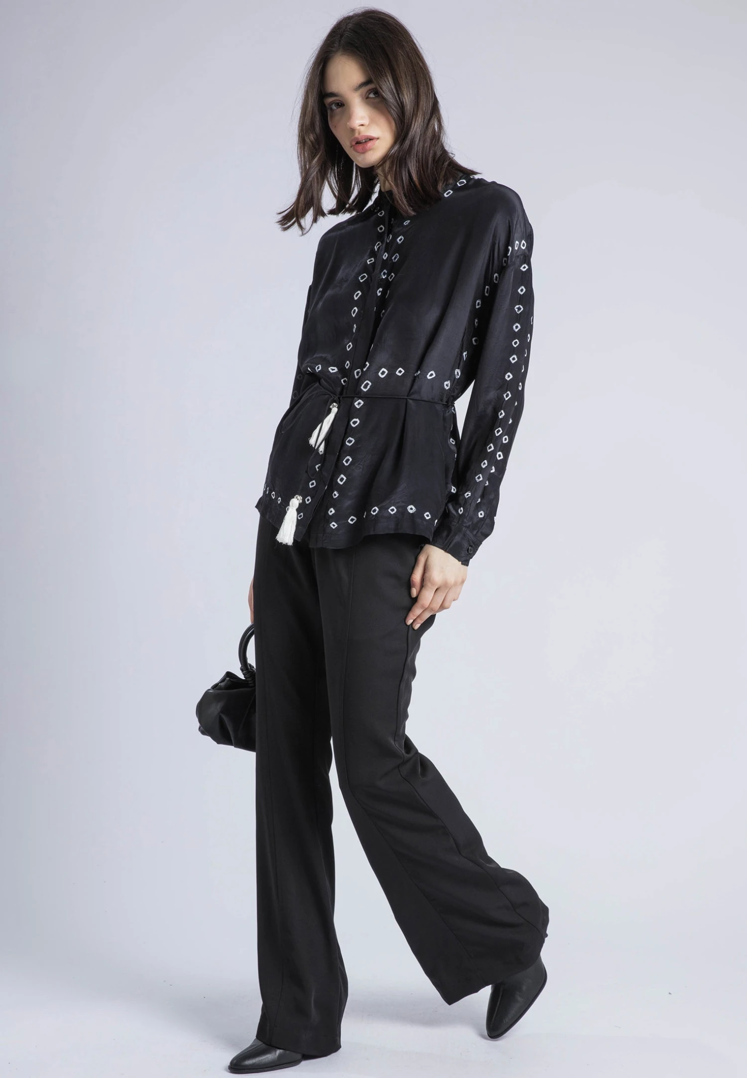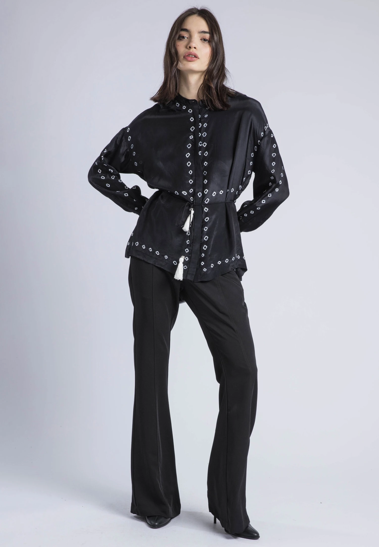 With its button-through design and a tie waist adorned with skull cord ends and playful tassels, the Lola shirt brings a unique twist to your outfit. It’s crafted from a faux silk fabric which combines the luxurious feel of touch of silk in our tie dye in black and white tones. Before trying it on, a quick steam is recommended as the shipment may have caused some creases in the fabric. So, get ready to enjoy the chic and comfortable style of the Lola shirt, perfect for various occasions and a fashionable addition to your collection. The model wears a size UK 10. Length from the top: 65 cm. The tie dye is made by hand, therefor every piece is unique. This is dry clean only.