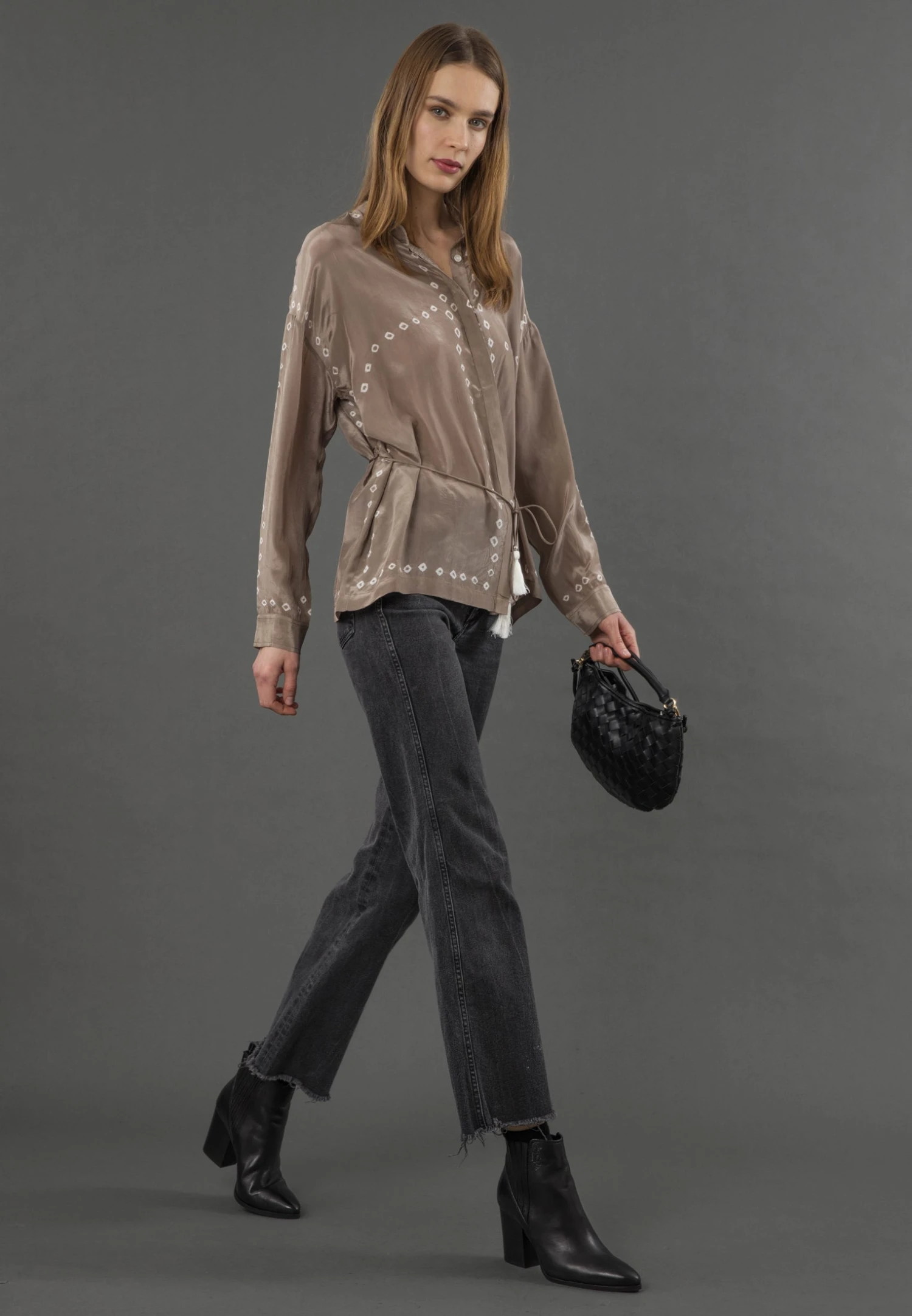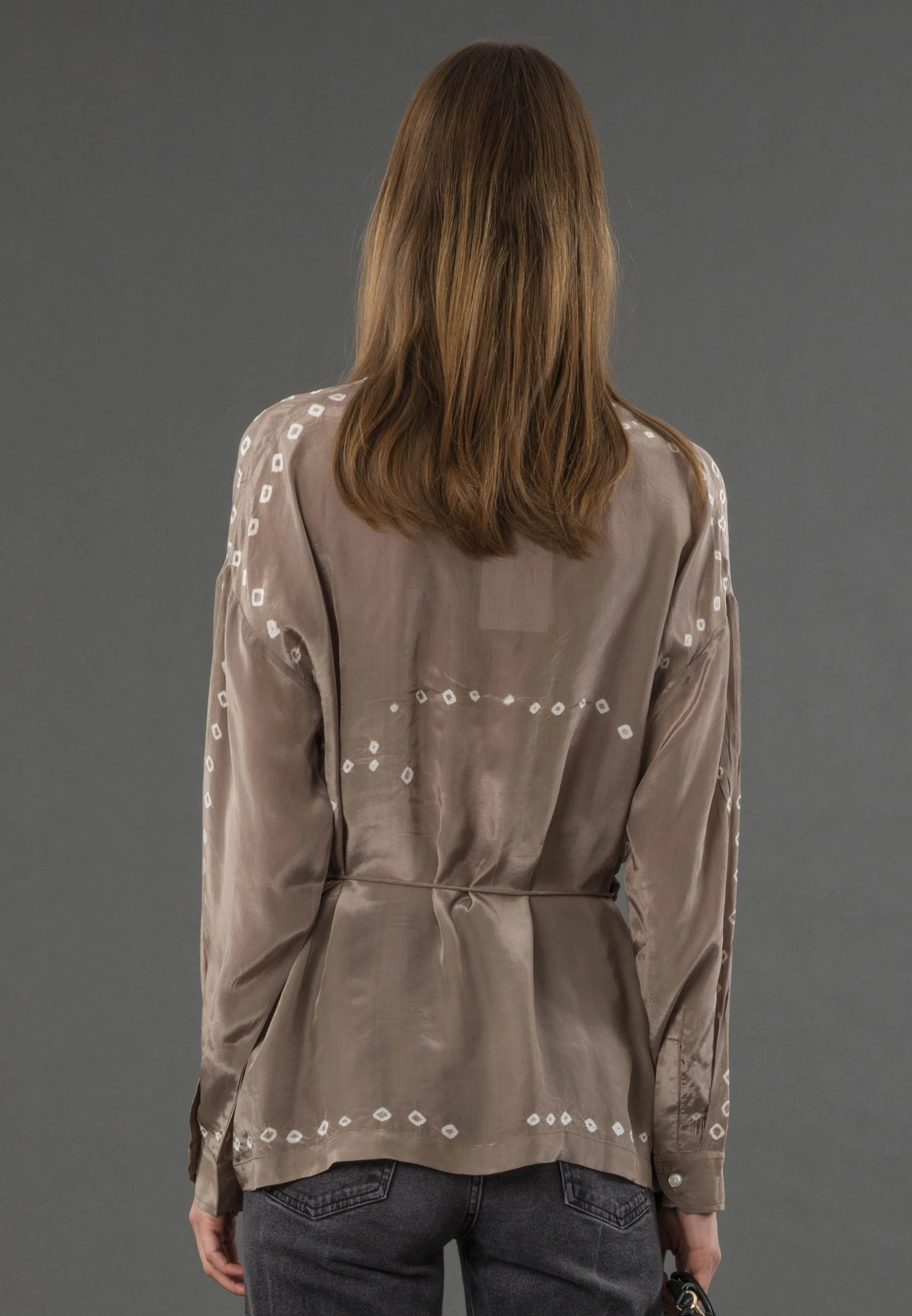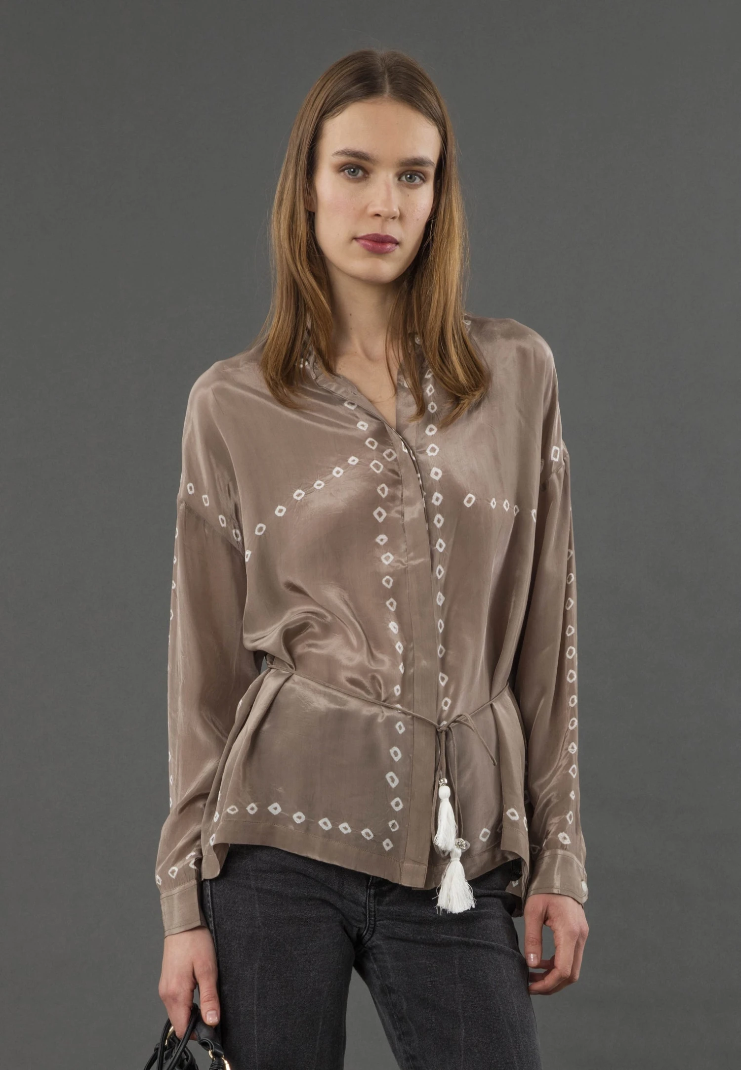 With its button-through design and a tie waist adorned with skull cord ends and playful tassels, the Lola shirt brings a unique twist to your outfit. It’s crafted from a faux silk fabric which combines the luxurious feel of touch of silk in our tie dye in brown and black tones. Before trying it on, a quick steam is recommended as the shipment may have caused some creases in the fabric. So, get ready to enjoy the chic and comfortable style of the Lola shirt, perfect for various occasions and a fashionable addition to your collection. The model wears a size UK 10. Length from the top: 65 cm. The tie dye is made by hand, therefor every piece is unique. This is dry clean only.