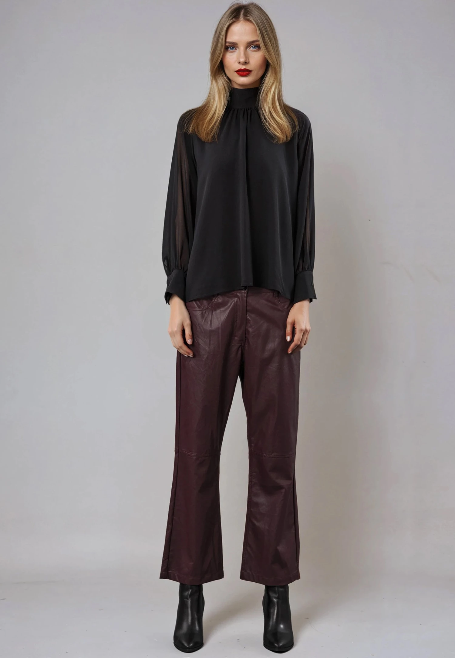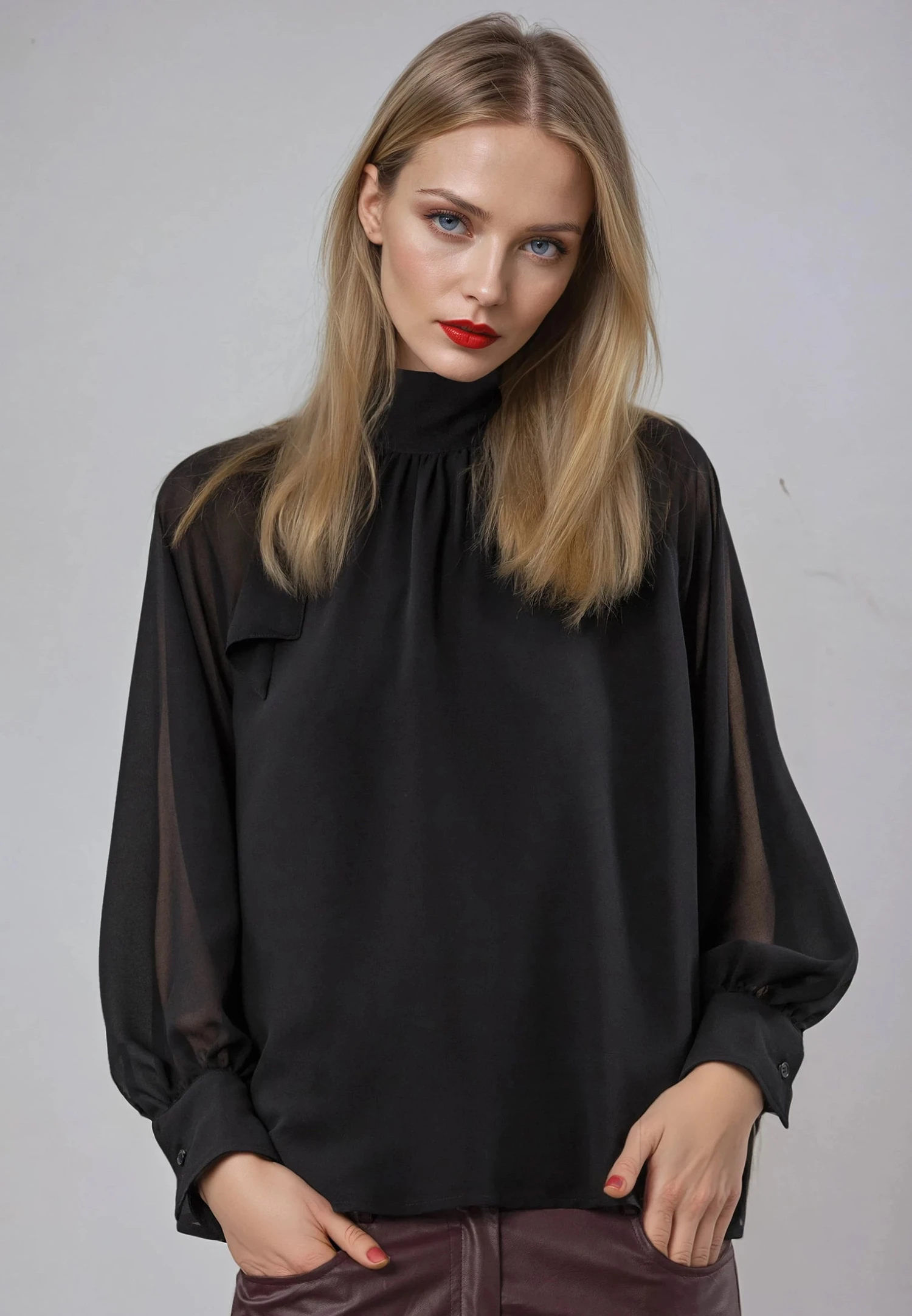 The Mia Top in black features an oversized fit with a high neck and tie neckline, adding a touch of elegance to your wardrobe. Its long bell sleeves and lined front enhance the chic silhouette, while the fabric, made from 55% recycled polyester, offers both style and sustainability. Versatile and comfortable, this top is perfect for any occasion. The model wears a UK size 10. Length from the top: 63 cm