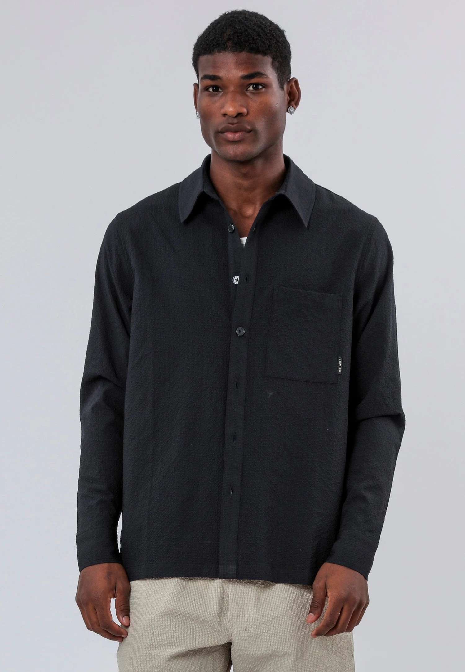 The Long Sleeve Shirt in Midnight. Designed in a regular fit and crafted from textured cotton fabric for a refined look. This stylish button-up features a convenient chest patch pocket, blending functionality with timeless style.