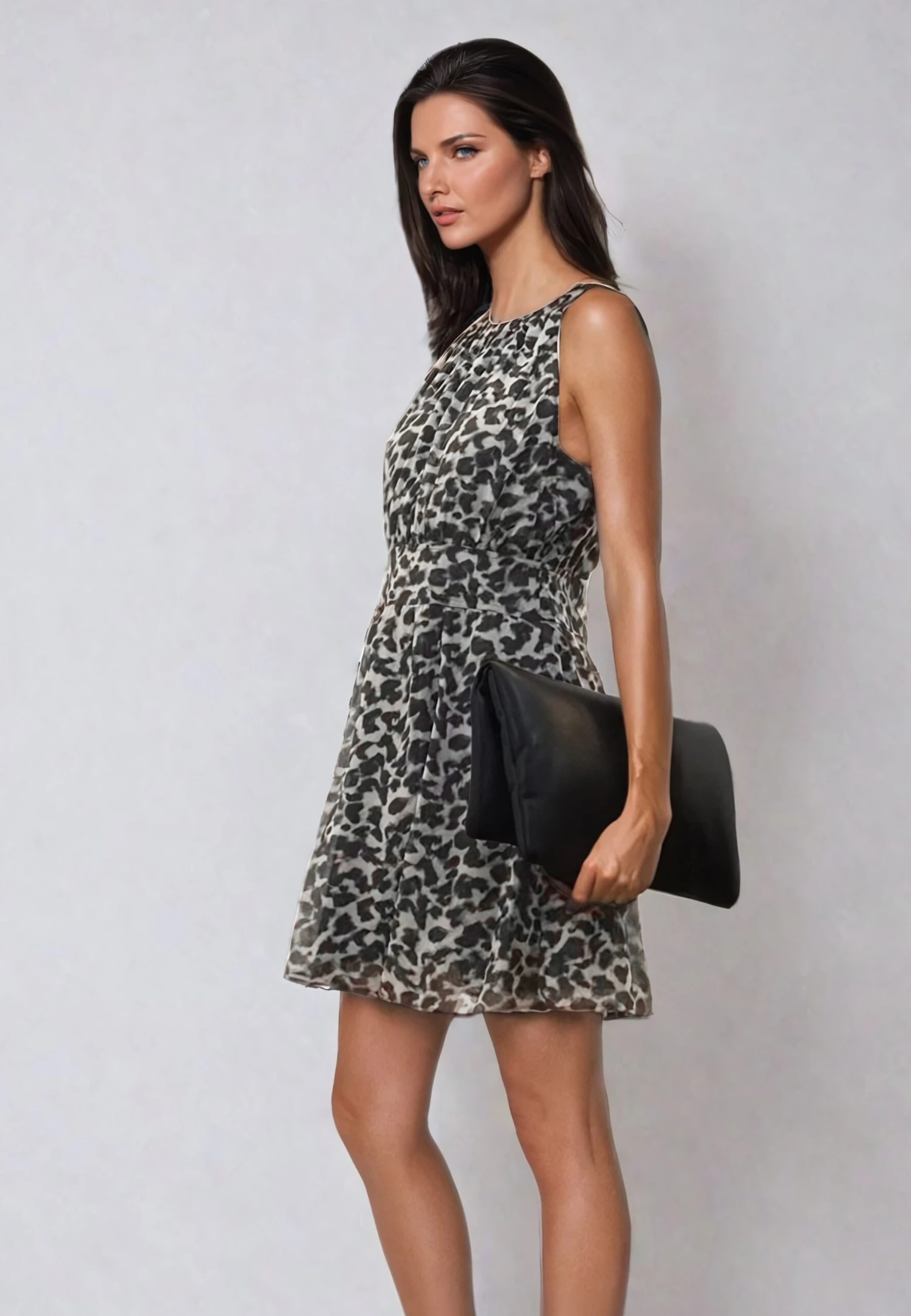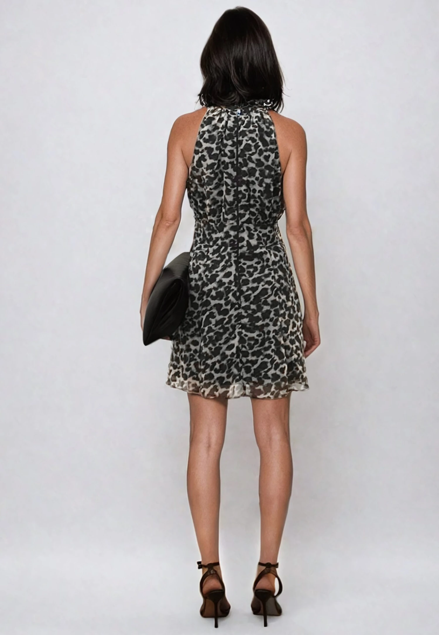 The Noir mini dress is a captivating piece in our animal Primtive print in neutral tones. Sleeveless with a halterneck, it boasts a fitted waist and regular fit, making it easy to dress up or down for versatile style. Wear with ankle boots and a leather jacket, or heeled sandals and a blazer. The model wears a size 10. Length from the top: 88 cm.