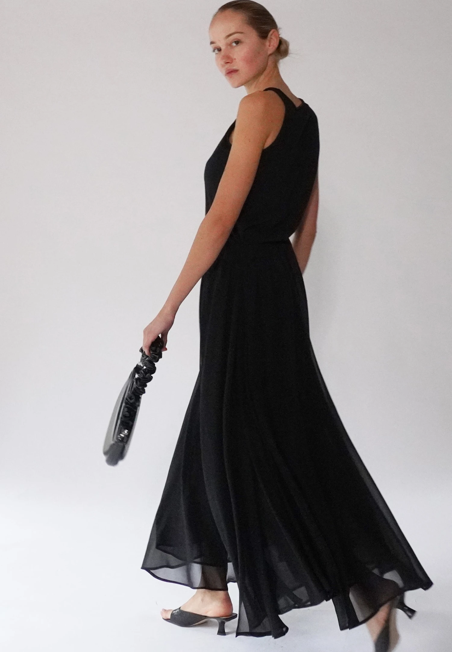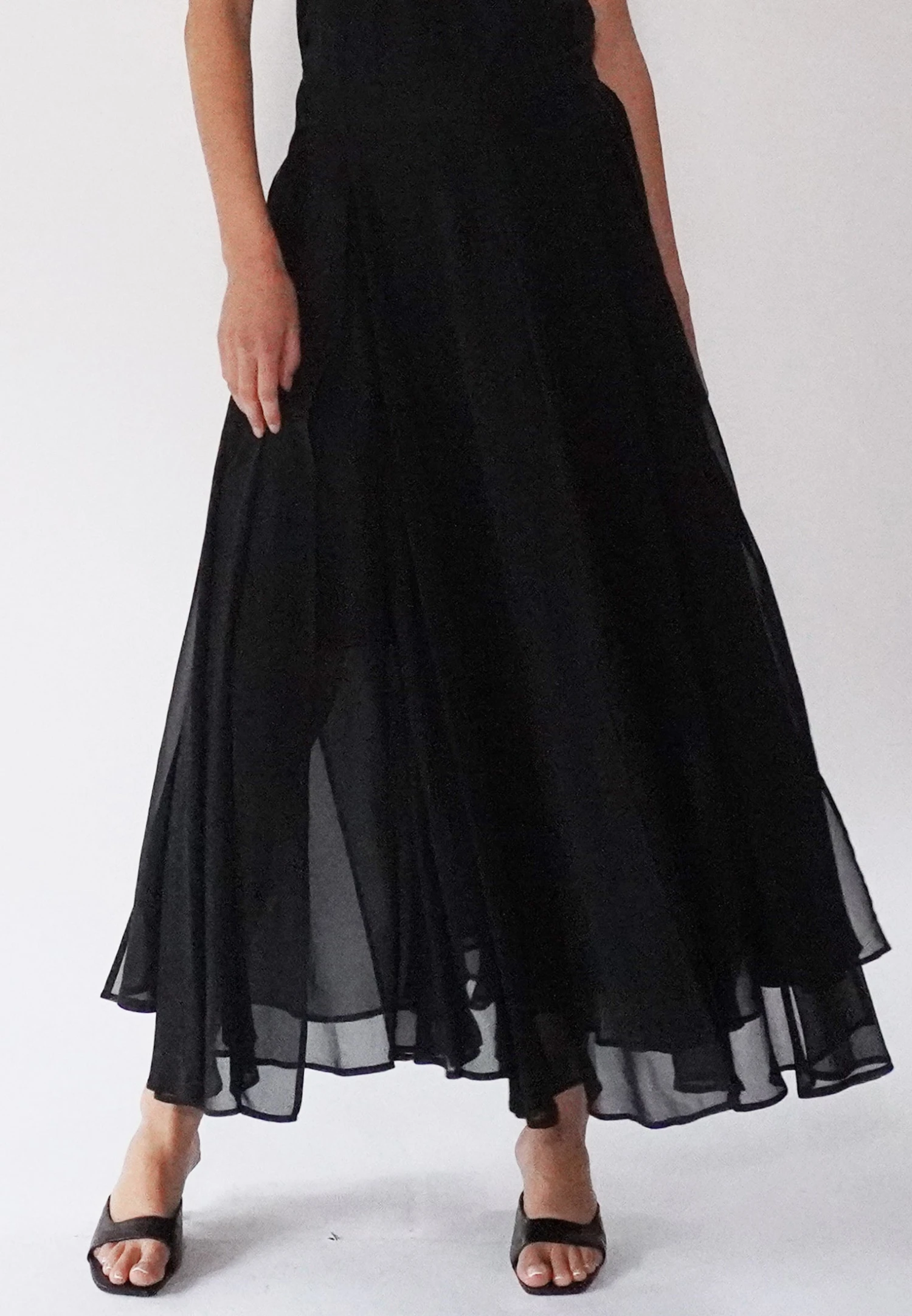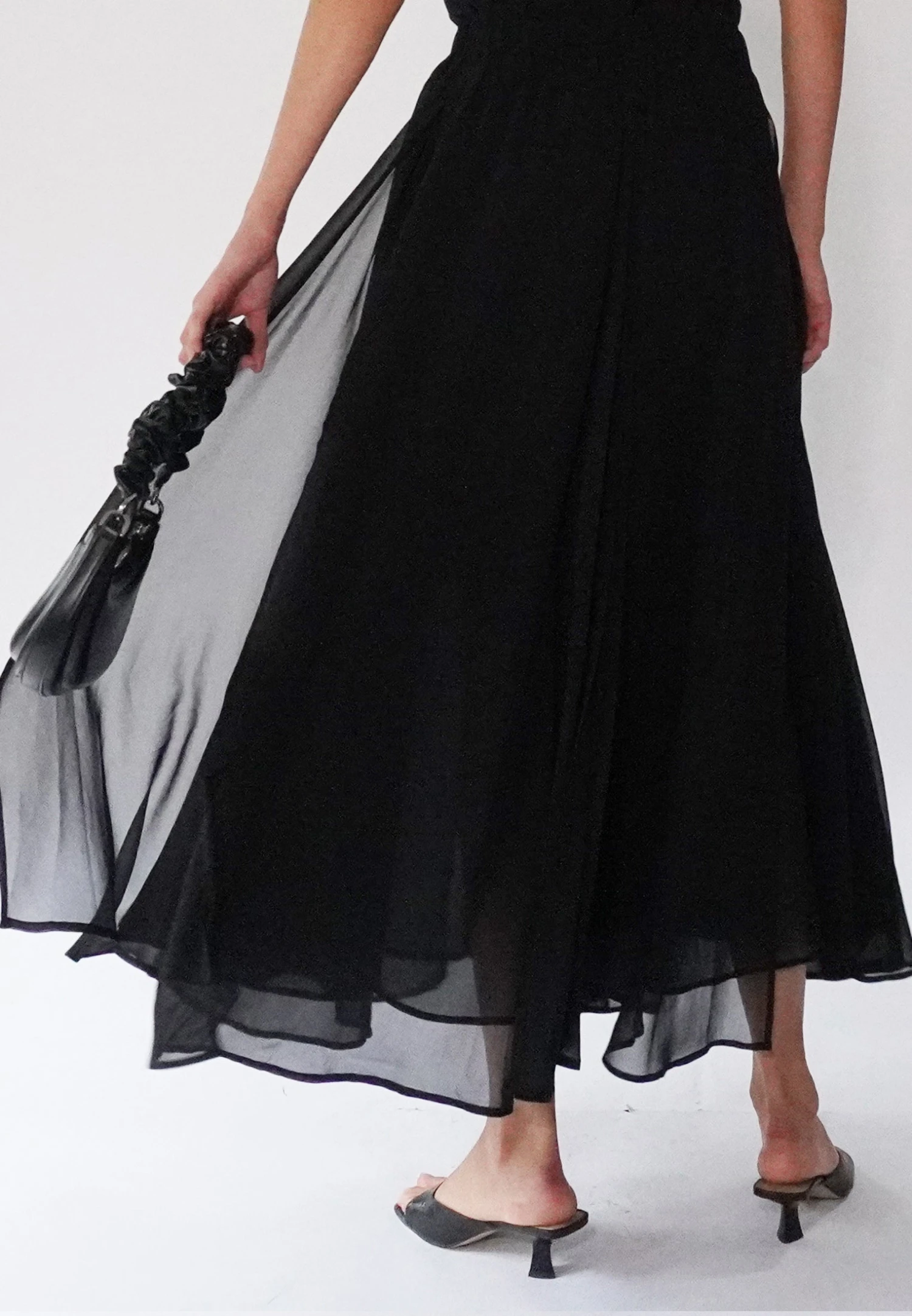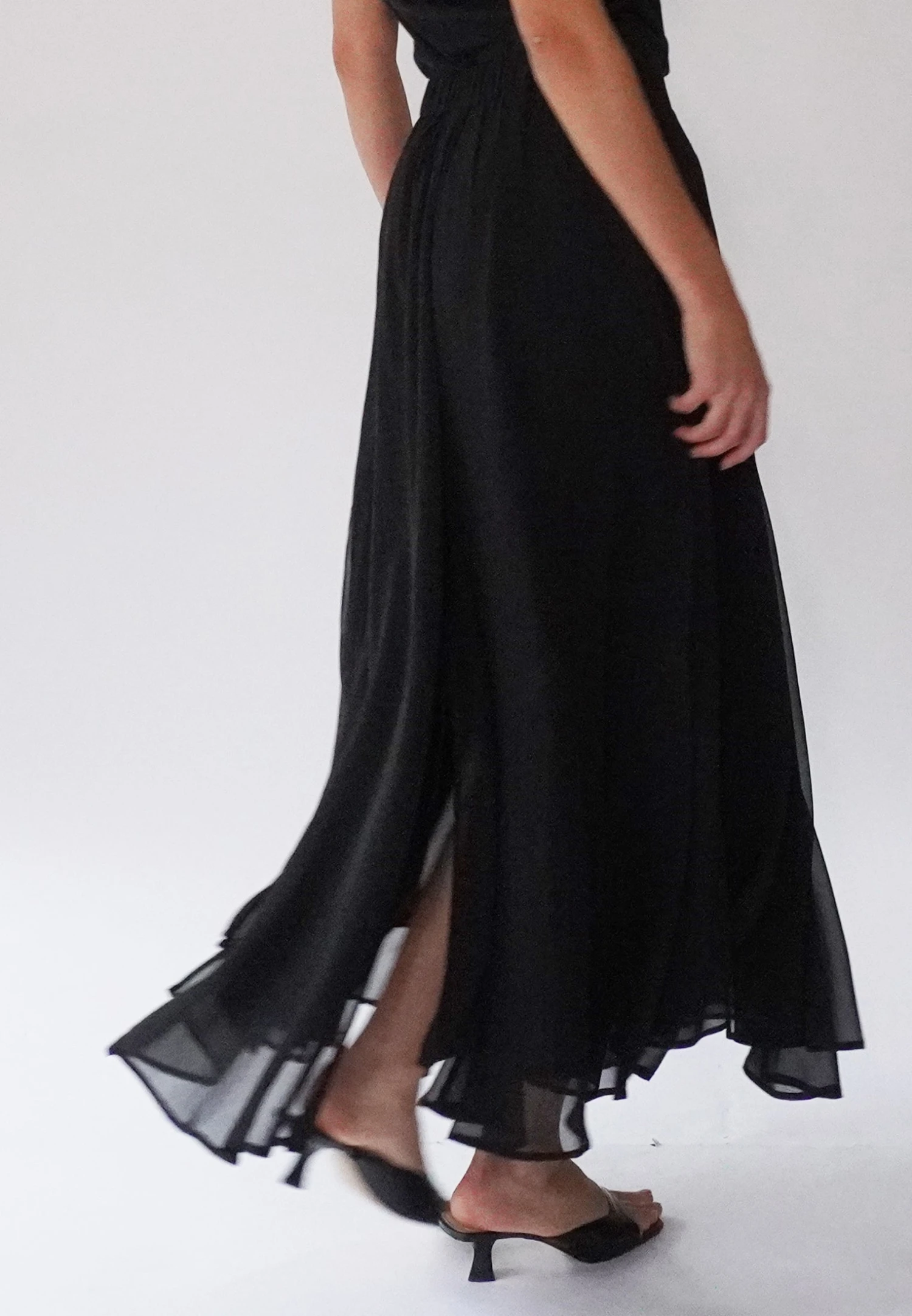 Taken from our best-selling maxi dress, the Olsen skirt will give you the same dramatic style but now you can style it with your favourite top. This style features 2 layers of floating fabric with high slits adding to the dramatic effect. The skirt has a maxi length and an elasticated back waist for ease and comfort. The model wears a size S.