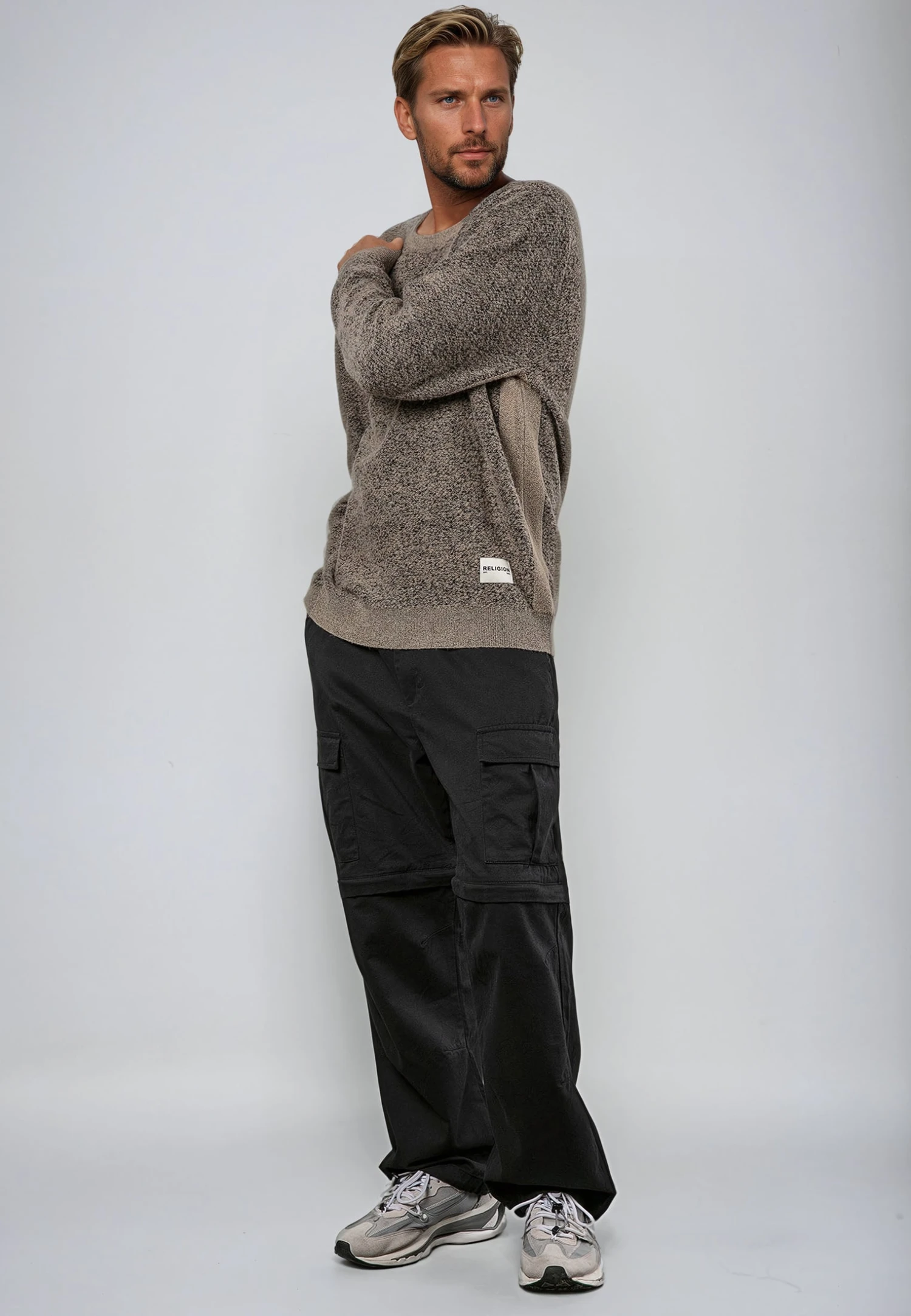 Cozy up in our Panel Knit in the sand. Shaped to a regular fit with a classic crew neckline and contrasted stripe detailing. Crafted with a unique speckled knit pattern and finished with knitted ribbed hem, cuff and neck. Complete with a cream RELIGION external label.