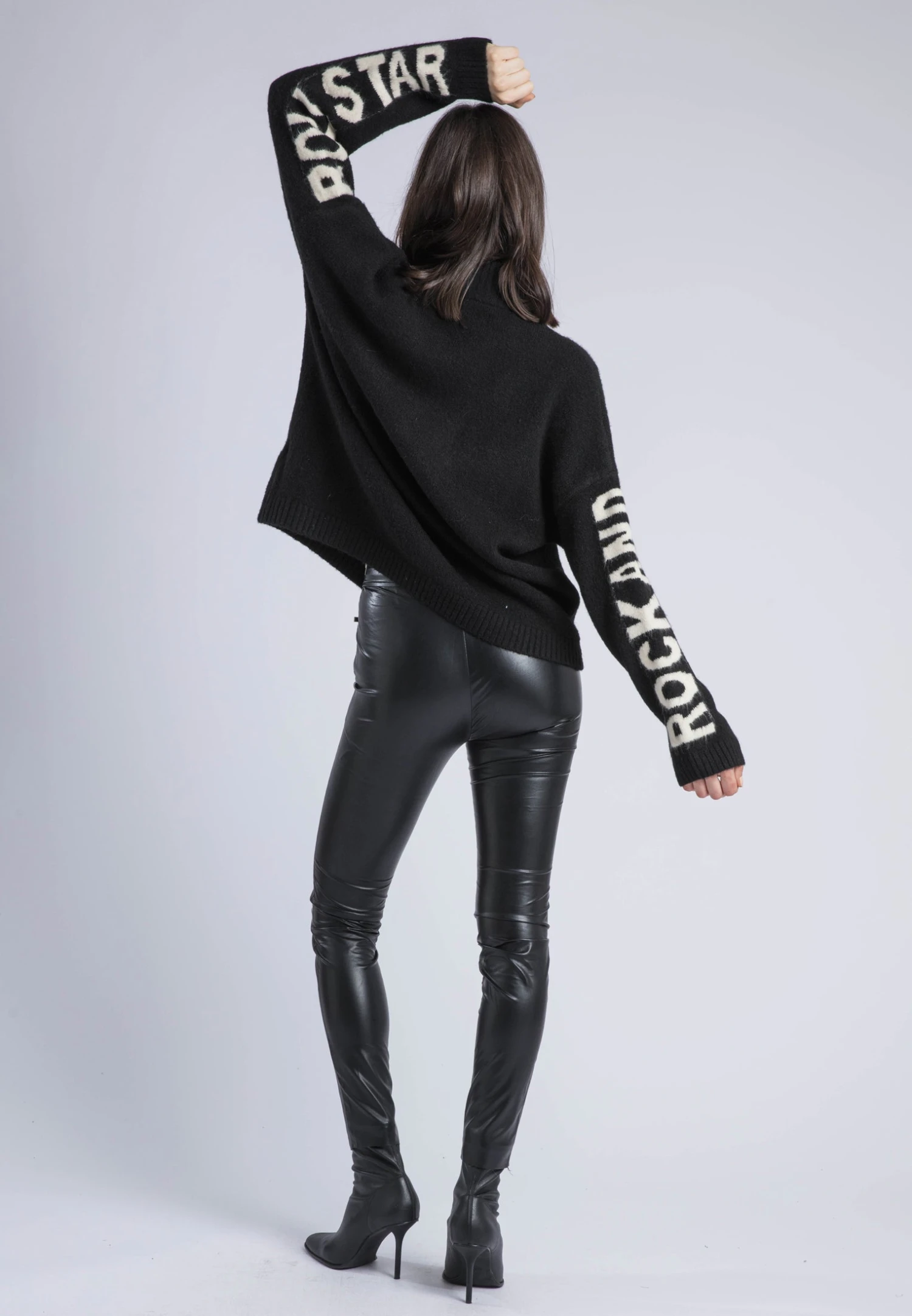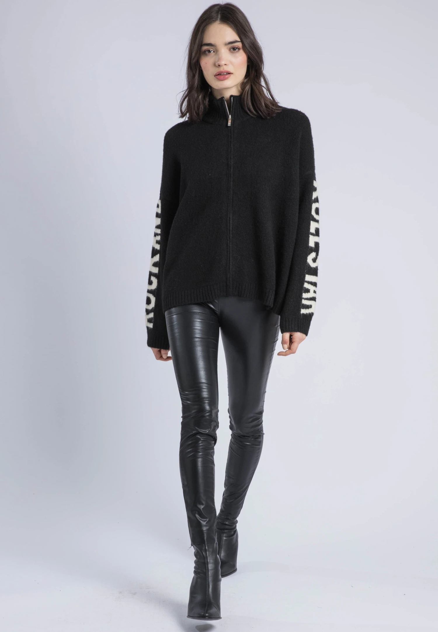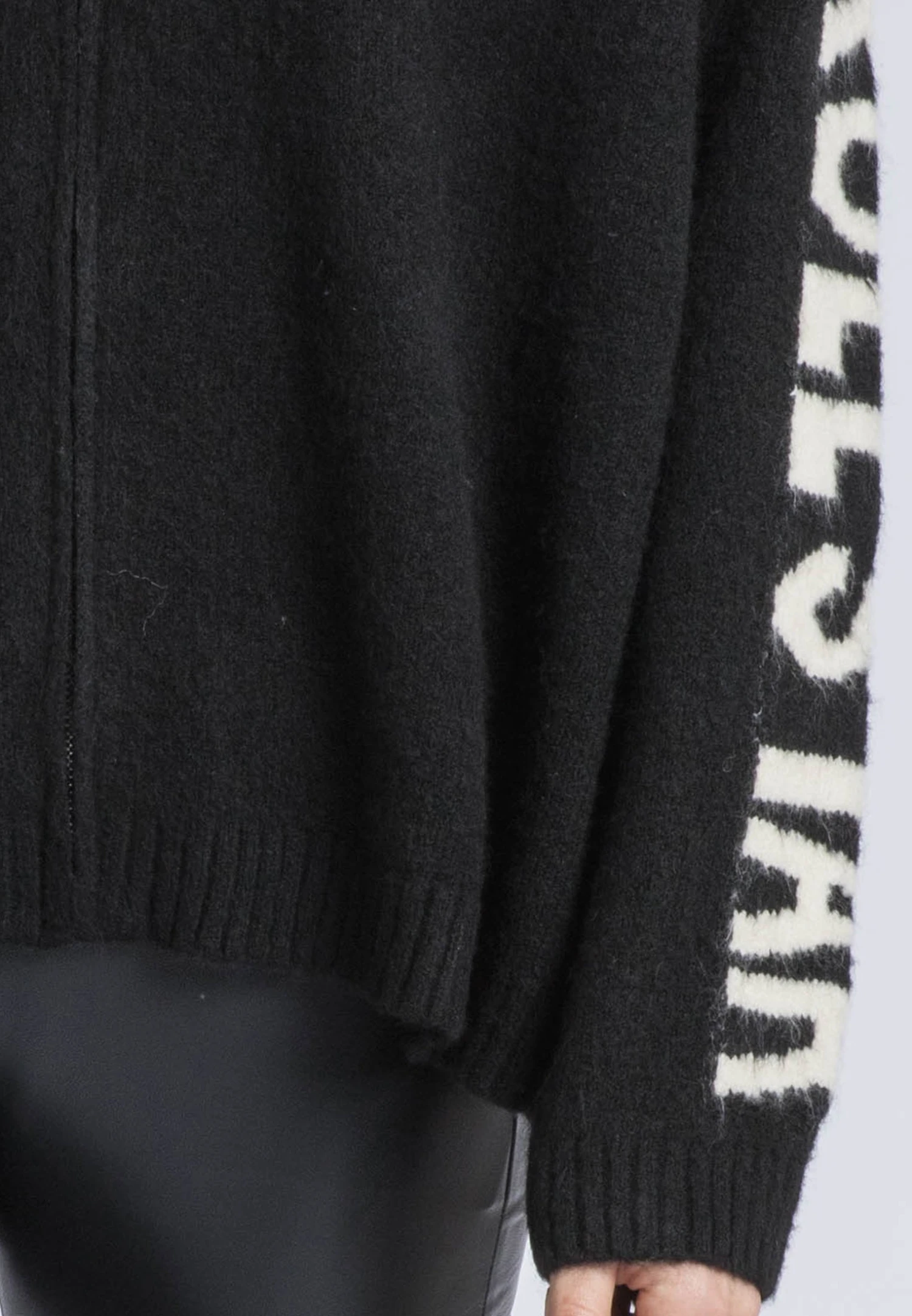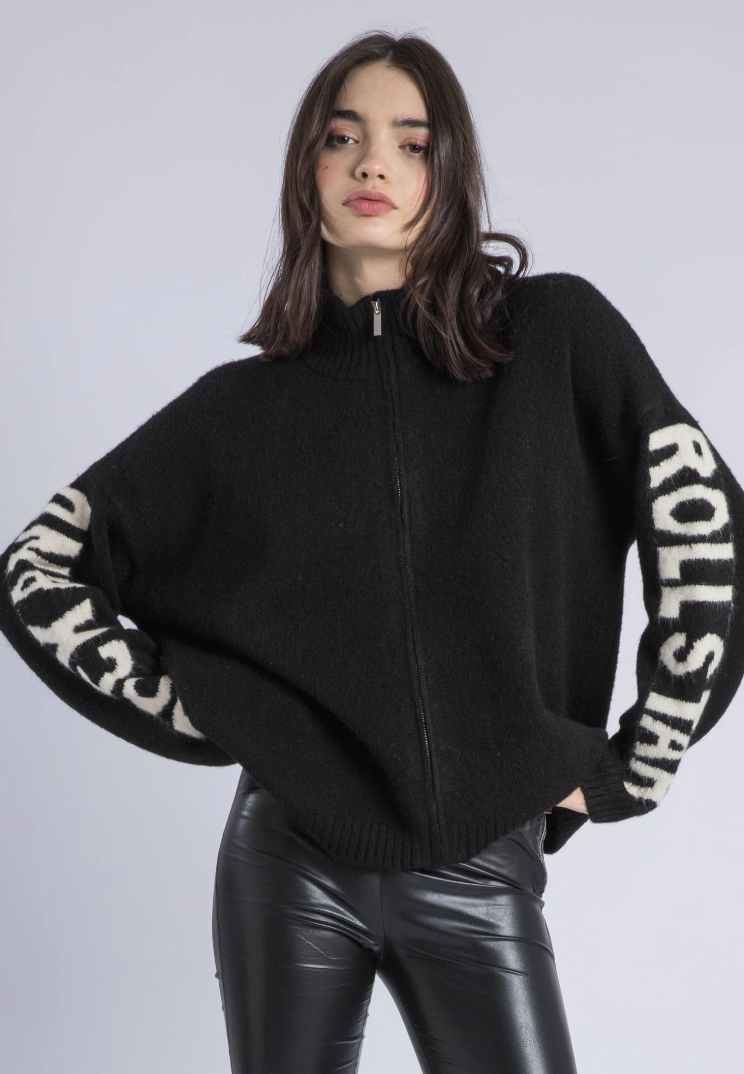 The Phoebe Cardigan is an essential layering piece that combines comfort and style. This oversized cardigan features a high neck and zip closure, providing both warmth and a sleek silhouette. The long sleeves feature our rock n roll star slogan, made in a warm mool mix yarn. Perfect for layering over your favorite outfits, this cardigan is a versatile addition to your wardrobe, effortlessly blending practicality with contemporary fashion. . The model wears a size UK 10. Length from the top: 59 cm