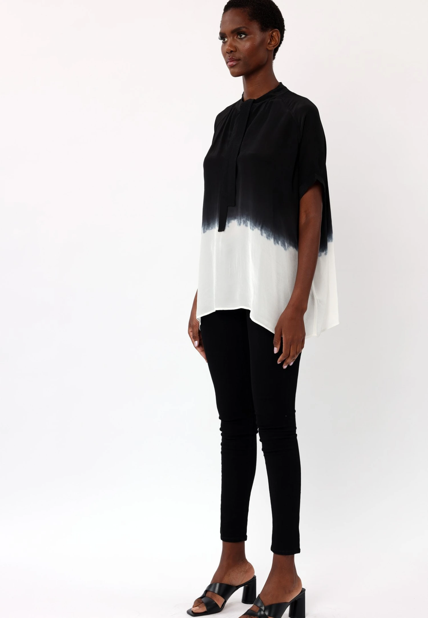 Channel relaxed femininity with the Power top in black and white dip dye. Made in vegan silk, this top features a Tie neckline, short sleeves and an oversized fit. Please go down 1 size if you like it better less oversized. The model wears a size S. This fabric needs gentle steam before trying it on as shipping might have caused creasing. The dip dye is made by hand, there for every piece is unique.