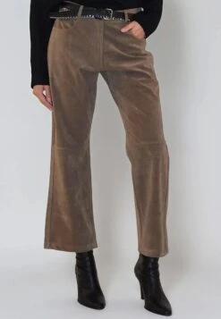 The taupe ‘Publicised Jacket’ is made from soft leather and features a stylish drape at the front. The jacket has silver zip closure, two zipped pockets at the side, and features a rough cut edge finish.