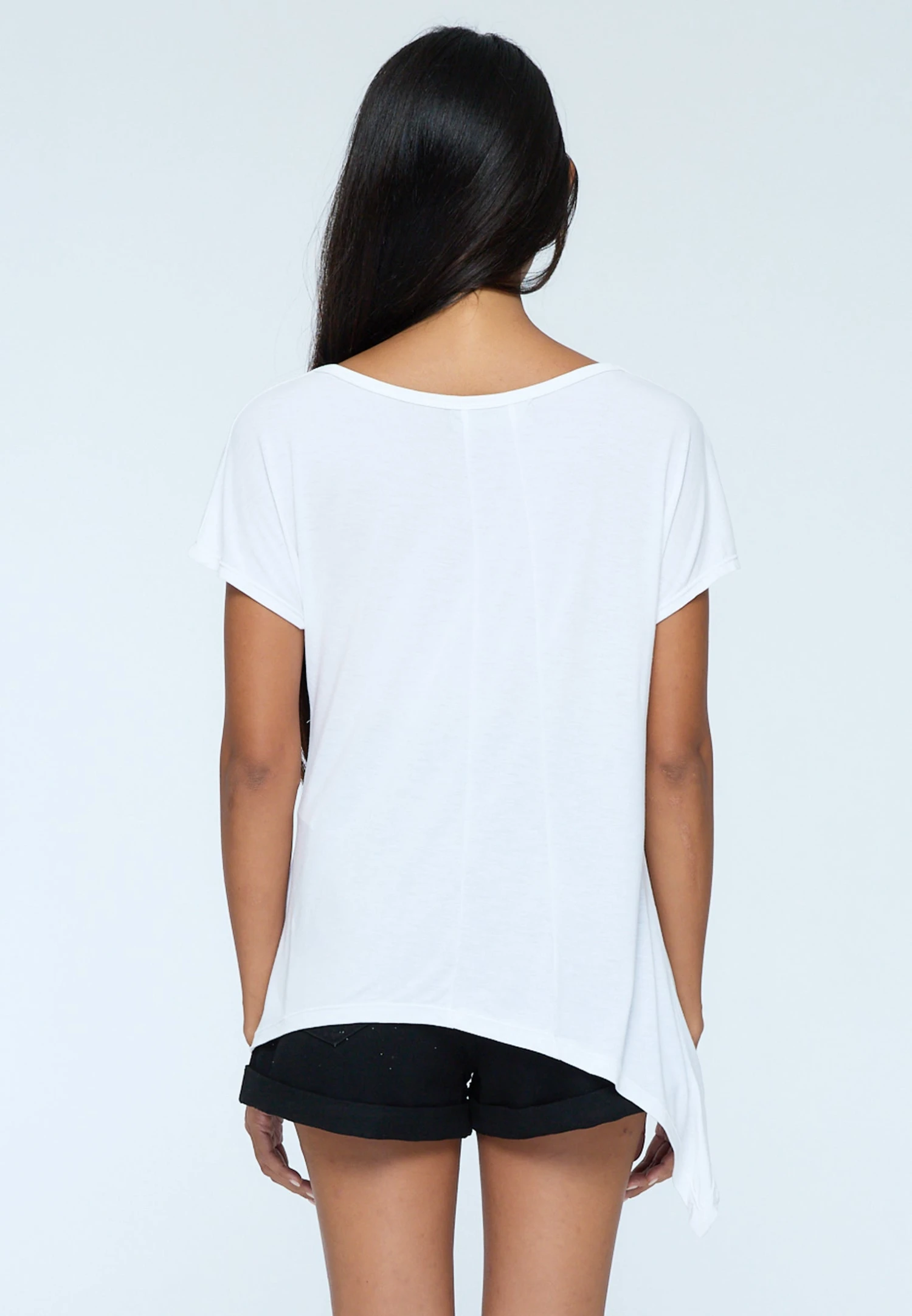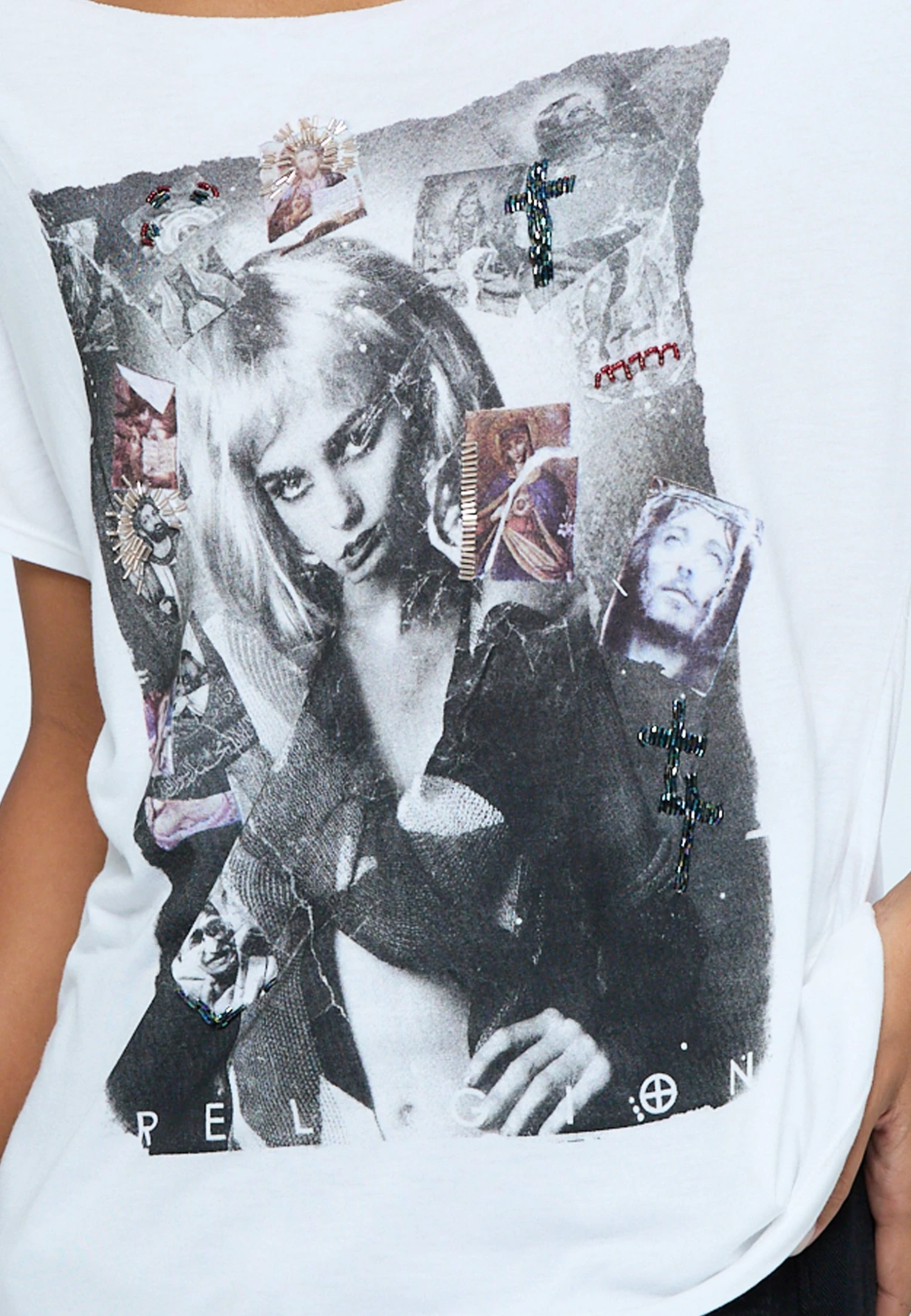 The RELIGION Isn’t Dead Top in white is a bold yet effortless staple. Designed in soft cotton jersey, this hip-length graphic top features a round neckline, short sleeves, and a loose fit for all-day comfort. The asymmetric hem adds a unique touch, while delicate beading on the graphic elevates the look. An easy, statement piece with an edge. The model wears a size UK 10.