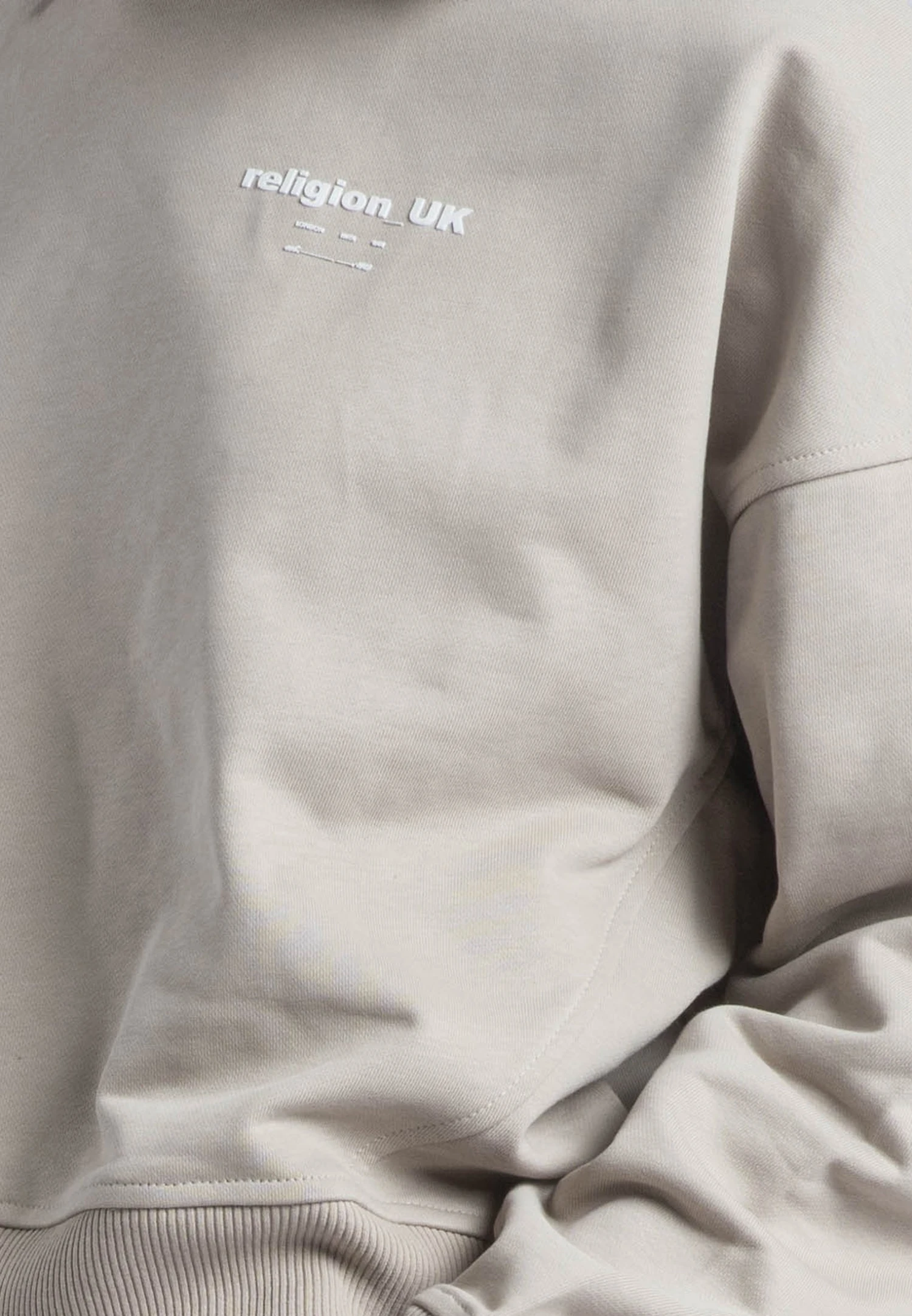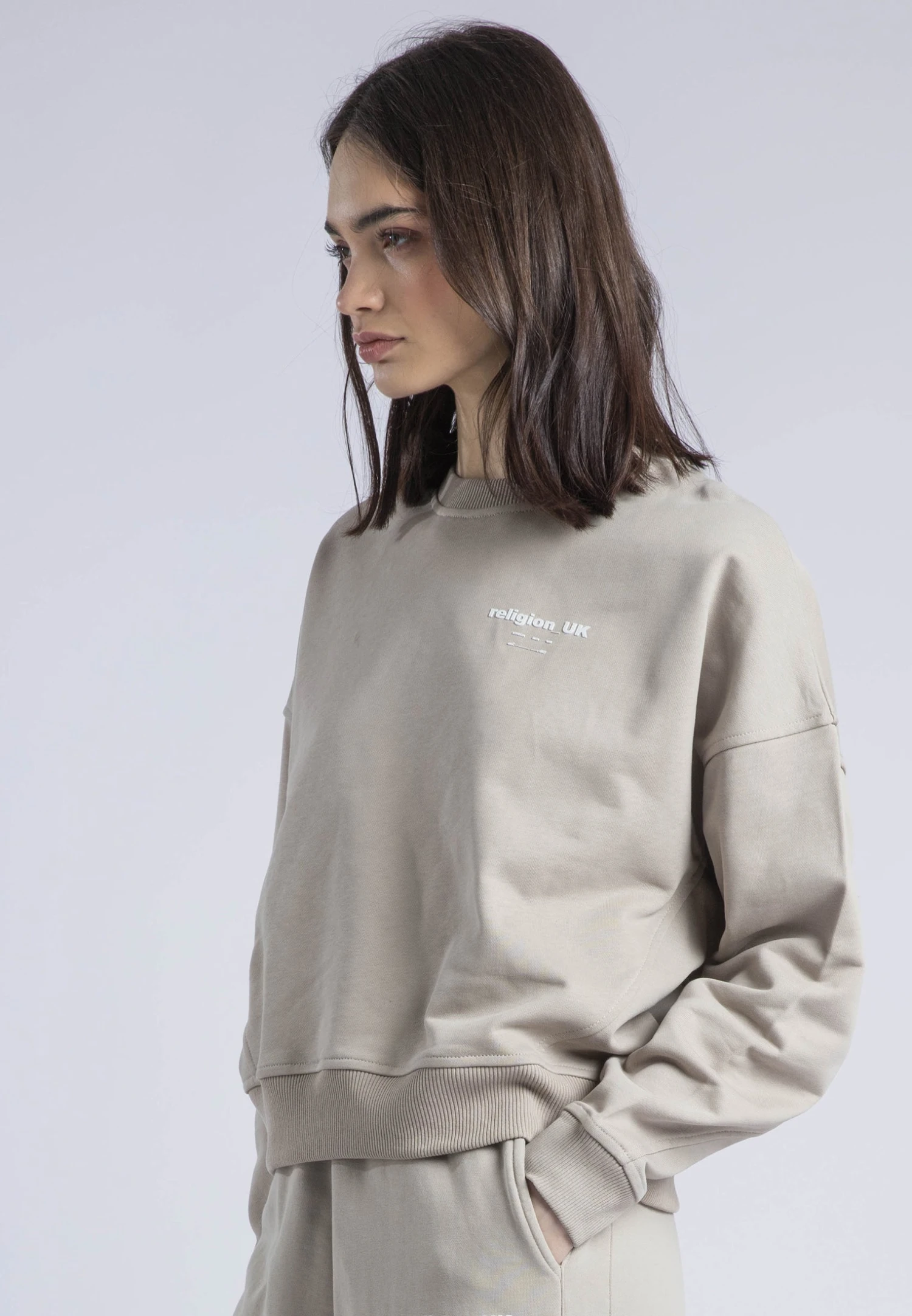 This hip-length, crew neck batwing sweatshirt in stone combines comfort and style with its relaxed fit and long sleeves. Made from soft cotton, it features a unique RELIGION print on the front and a large print on the back for a bold touch. Pair it effortlessly with jeans for a casual look or with matching trousers for a coordinated, trendy outfit. The model wears a size UK 10. Length from the top: 57 cm.
