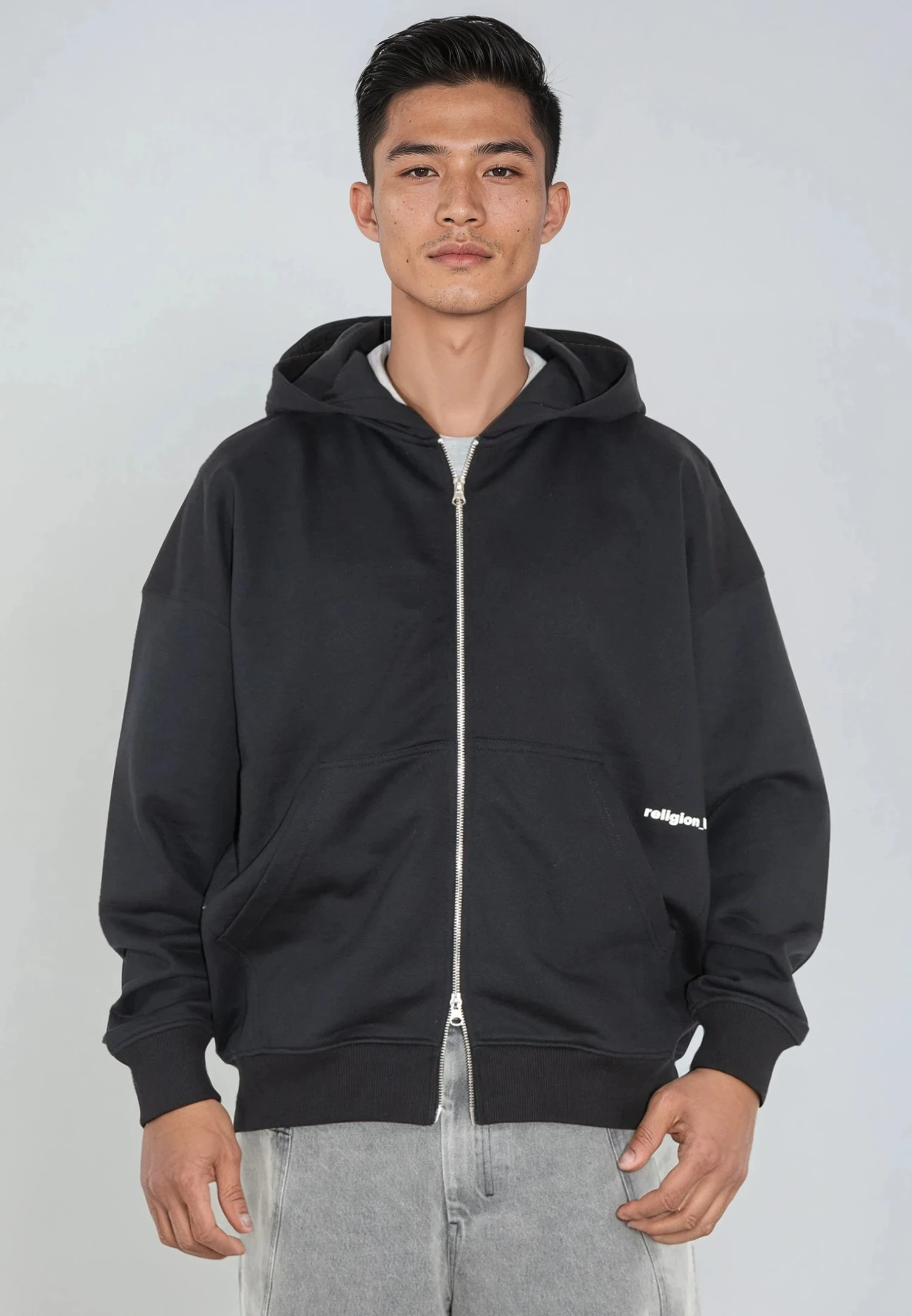 Elevate your everyday style with the RELIGION UK Zip-Up Hoodie. Designed with comfort and style in mind, this black hoodie features our signature RELIGION tour injection print displayed on the front and back. Made from 100% cotton, it offers a soft, breathable feel and includes a zip-up closure, ribbed cuffs and hem and a classic kangaroo pouch pocket for added practicality.