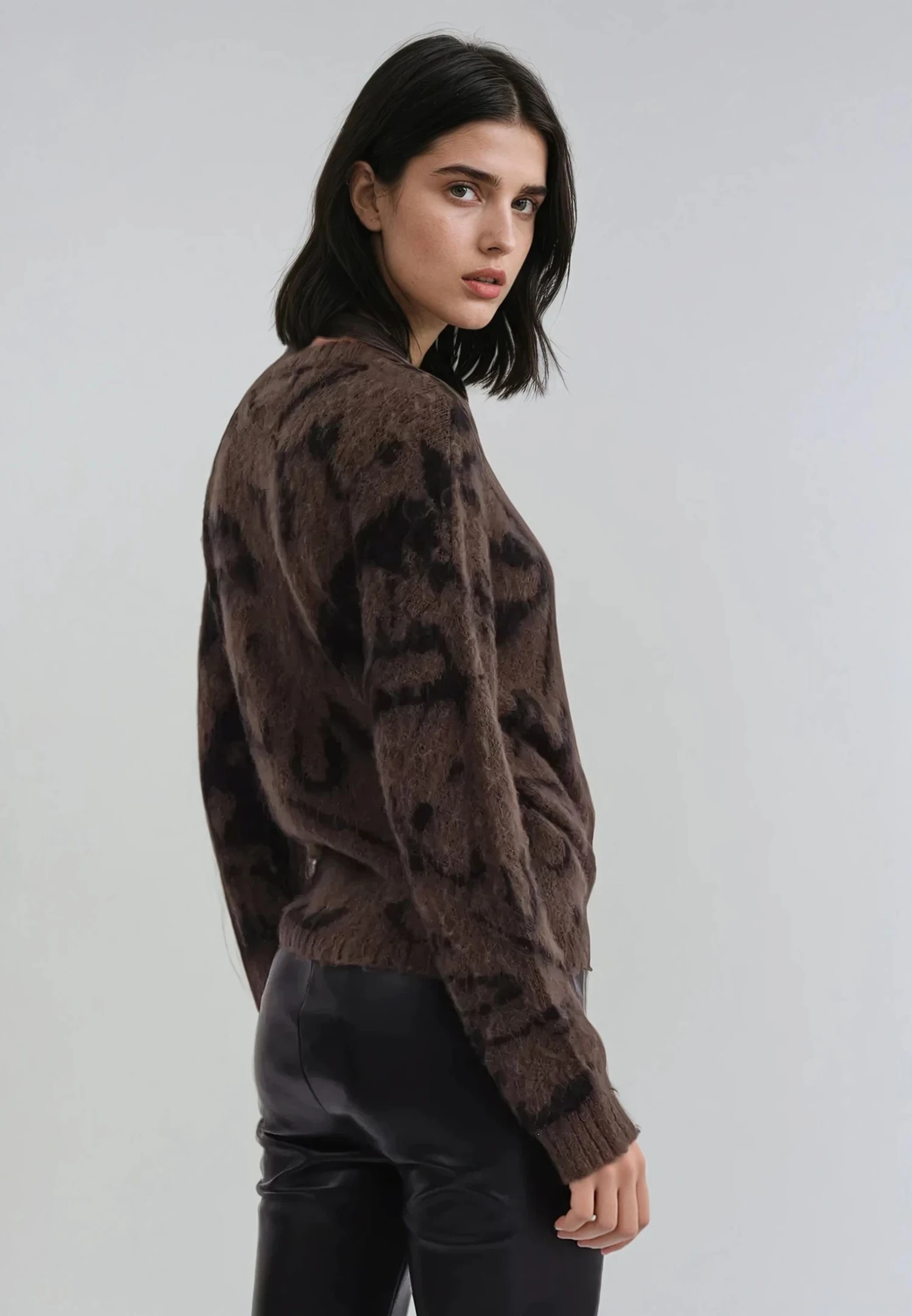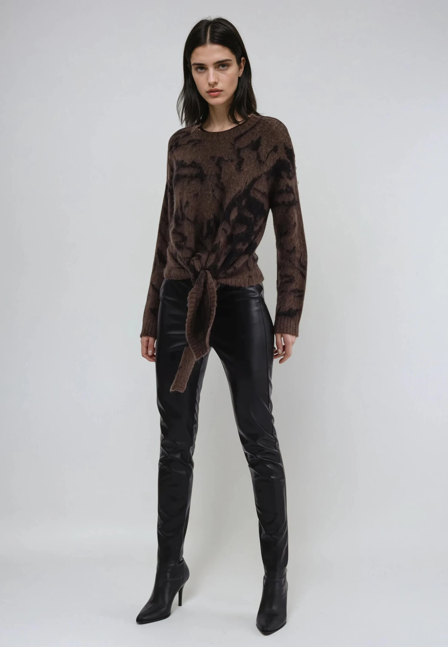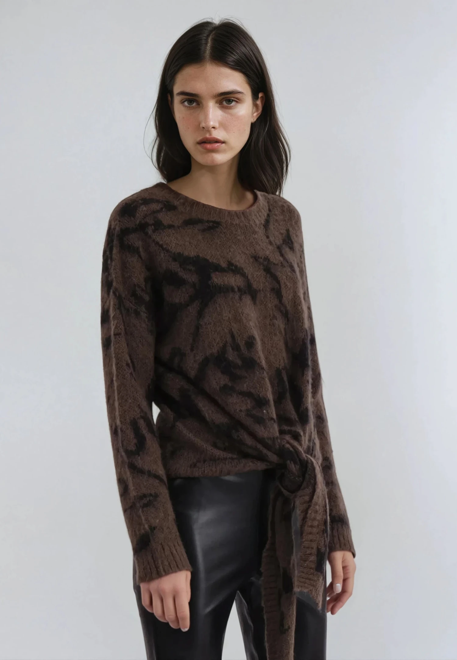 Elevate your winter wardrobe with the Reverse Jumper, a cozy and warm hip-length jumper crafted from a brushed wool mix featuring our chic Camo jacquard pattern in khaki and black. This fashionable piece is designed with long sleeves and a unique knot front detail, which adds a stylish twist to your look. The classic crew neck ensures comfort and versatility. Whether you’re pairing it with jeans for a casual day out or dressing it up for a special occasion, the Reverse Jumper is a soft and warm addition to your winter ensemble that’s sure to make a statement. The model wears a size S. Length: 58 cm