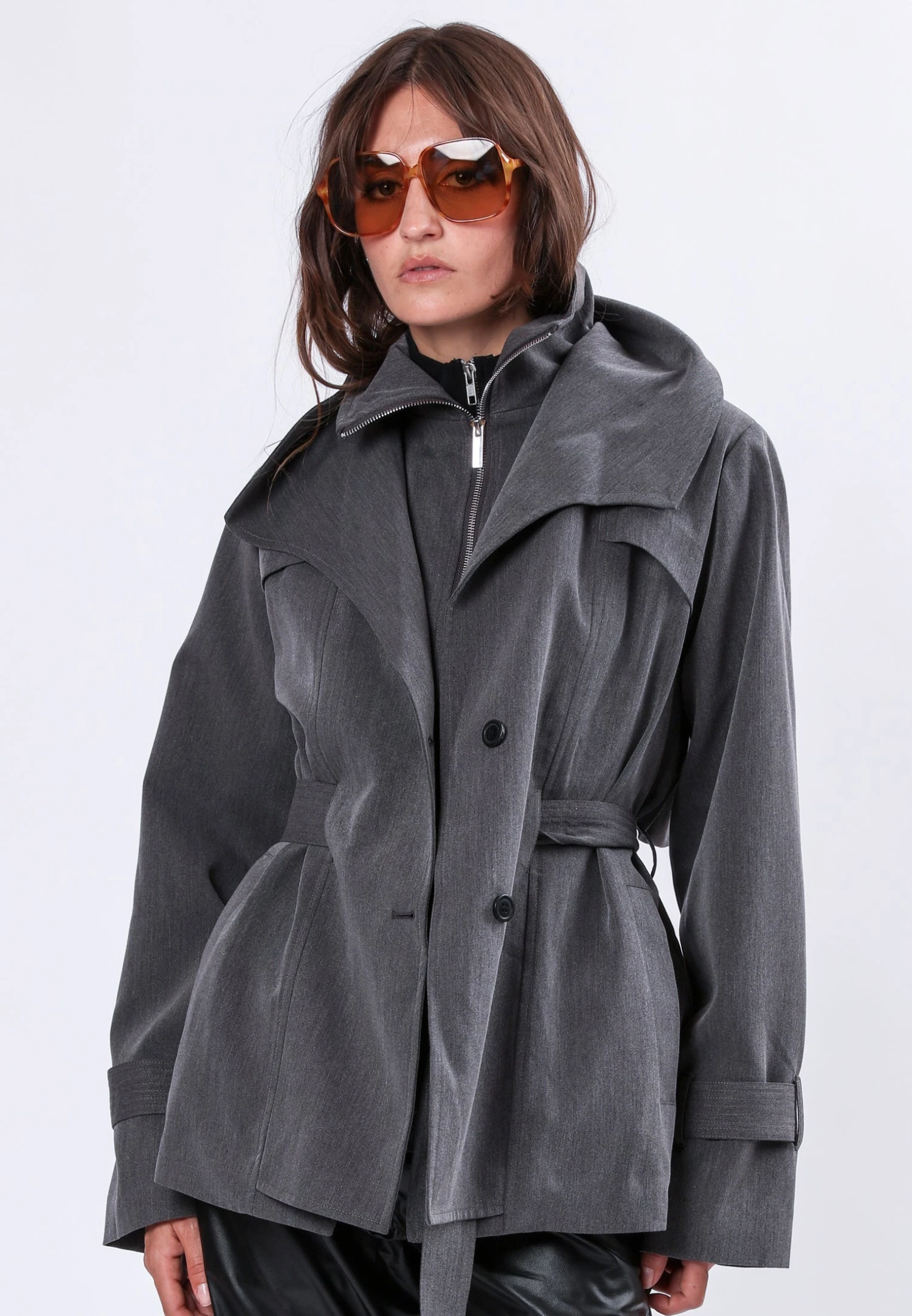 The Rhodium trenchcoat is a short coat in crepe, featuring a double collar, zip and button fastening, patch pockets, and a belted waist which can be worn 2 ways. With long sleeves with adjustable belt details, plus an inside pocket, it offers ultimate effortless style for transitional weather, seamlessly blending function and fashion for those in-between seasons. The model wears a size 10. Length from the top: 77 cm