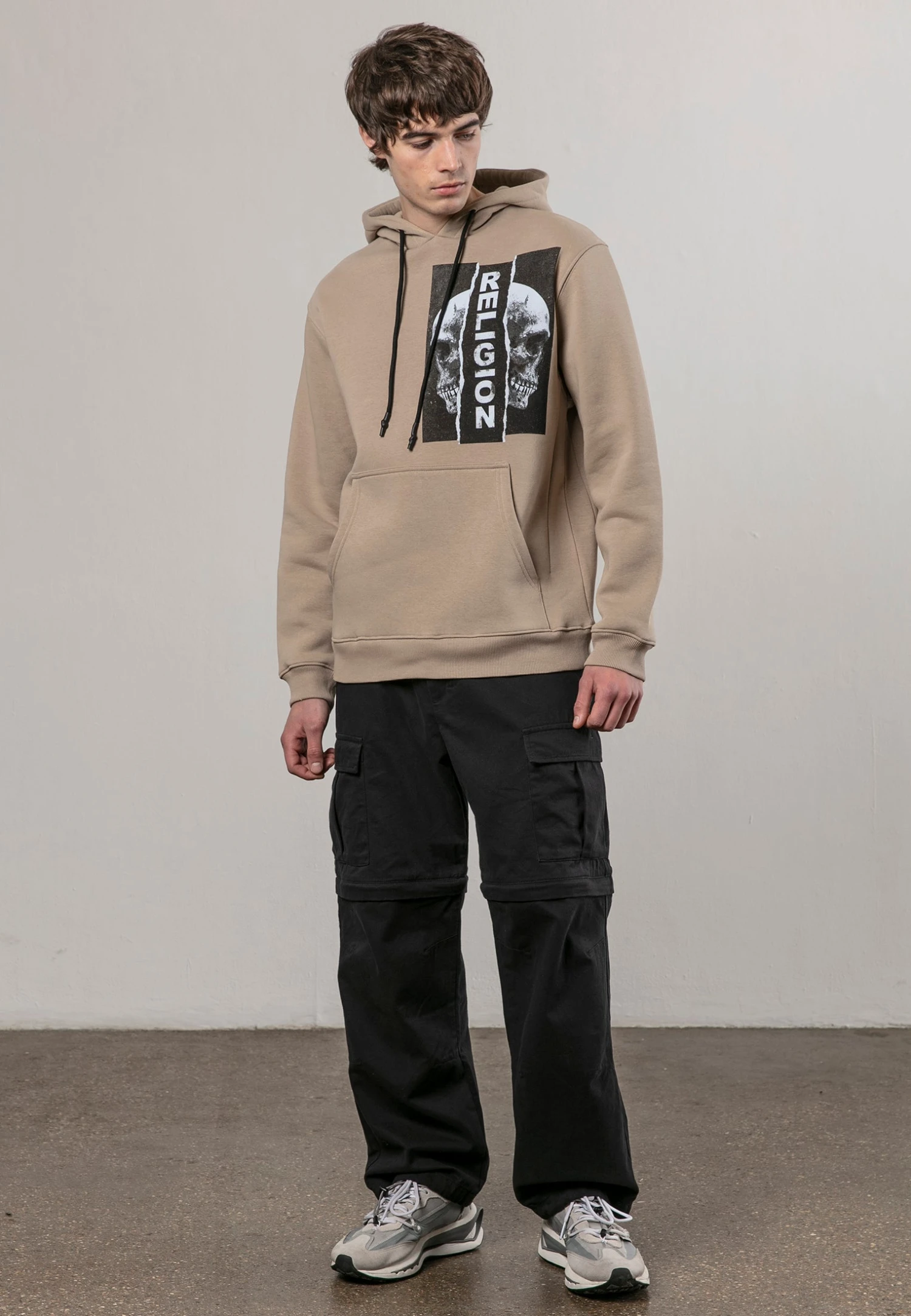 The Ripped hoodie in fawn, shaped to a regular fit. Featuring our ripped Religion double skull print on the chest. Designed with comfort in mind, it includes front and back darts, a kangaroo pocket and a drawstring hood, along with ribbed cuffs and hem. Completed with chain stitch cross detailing on the back.