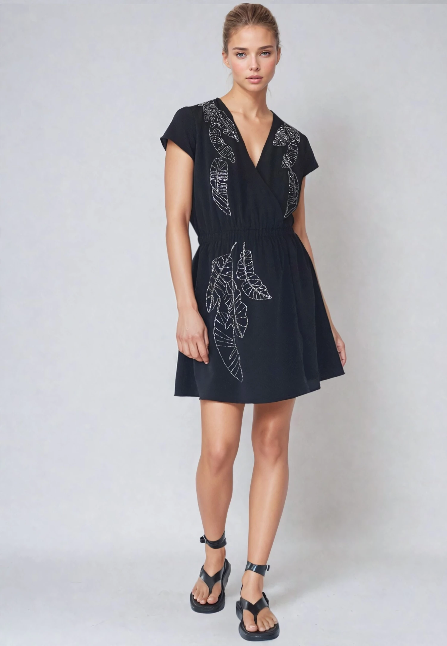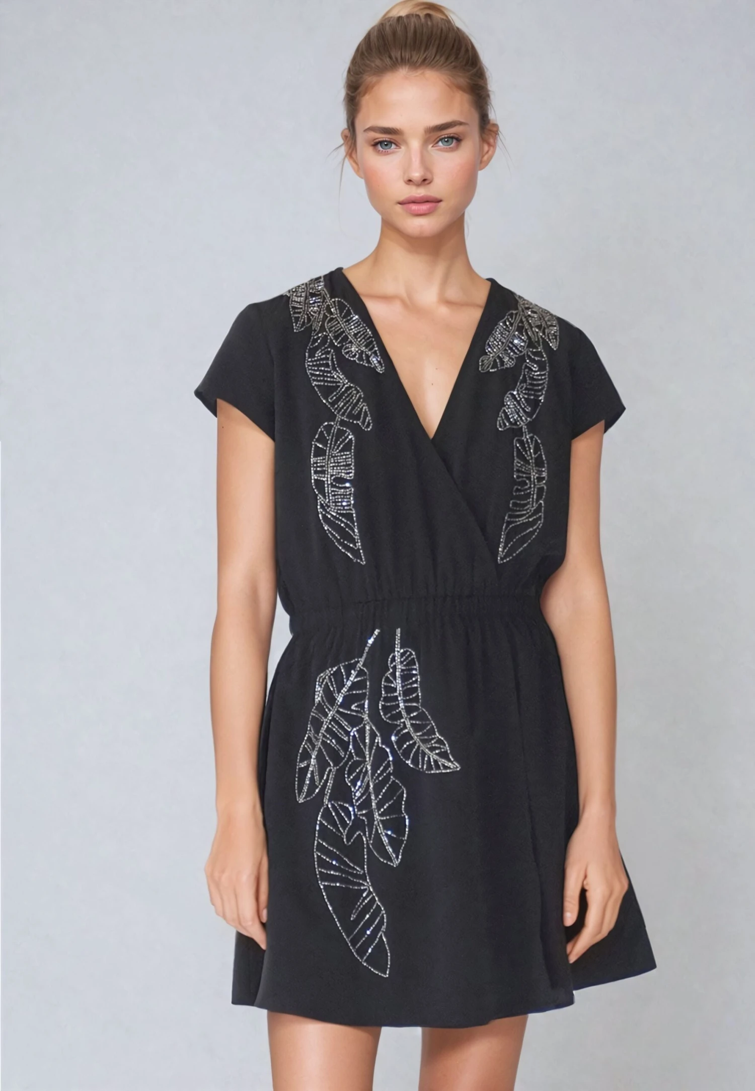 The Sensation dress in black crepe is a stunner with a fake wrap front, offering ease and comfort with an elasticated waist. Featuring short sleeves and a V neckline, it provides a comfortable regular fit. Adorned with beading, this versatile dress effortlessly transitions from desk to dinner with style. Wear with heels or ankle boots and a leather jacket. The model wears a size S. Length from the top: 88 cm
