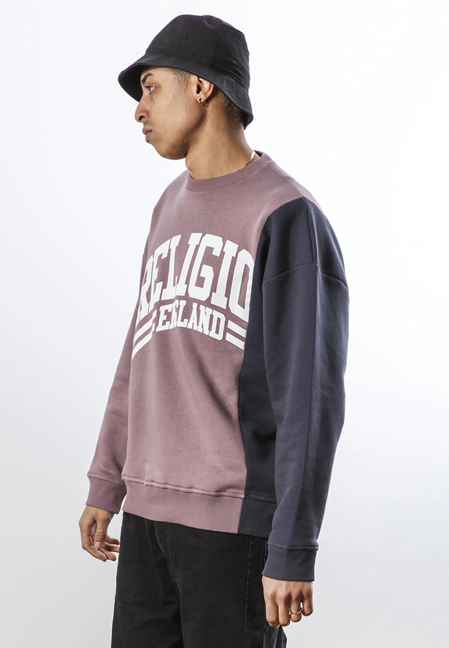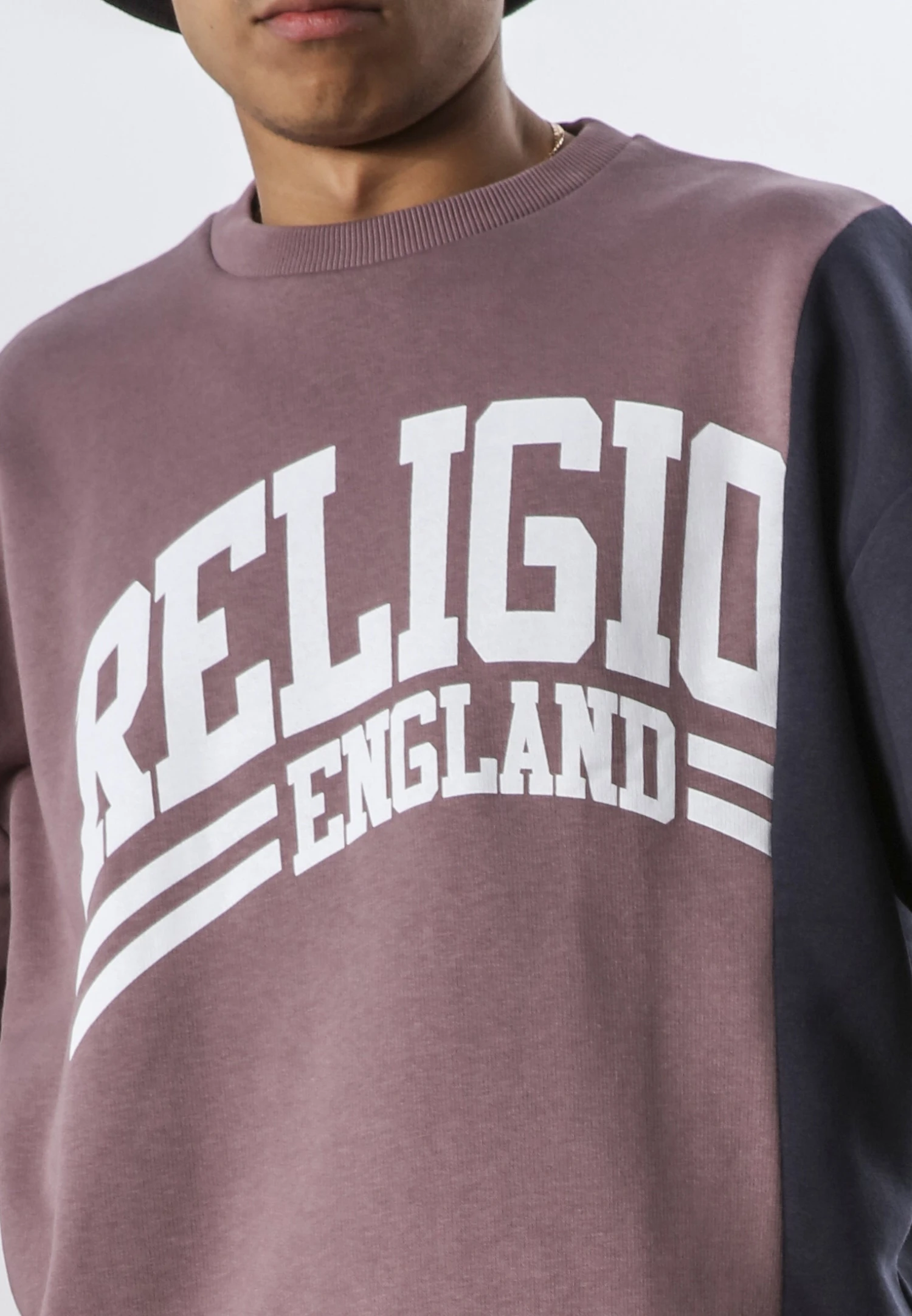 The Split Sweatshirt. Crafted from a soft brushed back sweat in a two-tone of mauve and ink. Shaped to a relaxed fit with dropped shoulders. Our RELIGION England graphic sits on the front.
