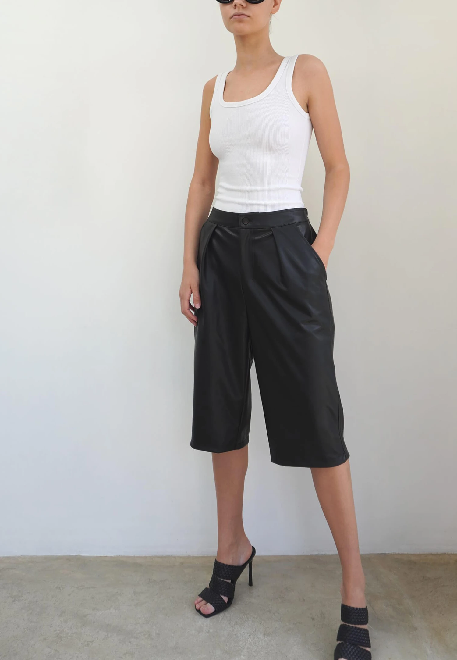 The system shorts are effortlessly cool in black faux leather. These boyfriend fit shorts are over the knee, feature our split pockets at the back, pleats at the front and have an elasticated back waist for ease and comfort. Dress up with heels and a shirt or down with trainers and a jumper. The model is wearing a size S.