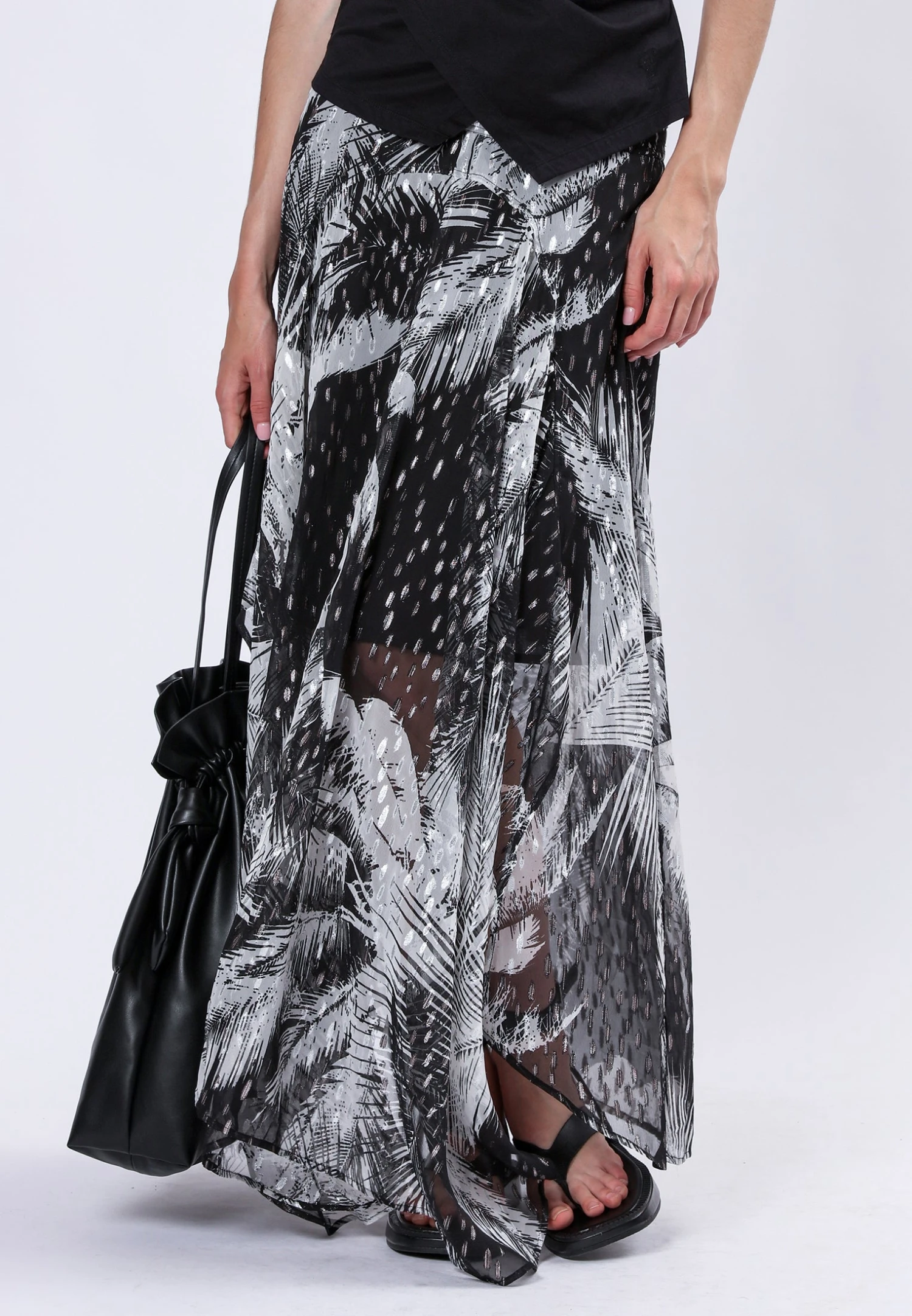 The Tanzanite skirt is a maxi-length marvel featuring intricate cut-out hem detailing, adding a touch of whimsy to its floaty silhouette. Crafted from shimmering silver lurex adorned with our timeless black and white Palm print, it exudes sophistication. The elasticated back waist ensures comfort while maintaining a flattering fit. Pair it with the matching shirt for a coordinated ensemble or opt for a simple t-shirt for casual chic. From daytime outings to evening soirées, the Tanzanite skirt is the epitome of versatile style, ready to elevate any look with its enchanting allure. The model wears a size S. Length from the top: 94 cm.