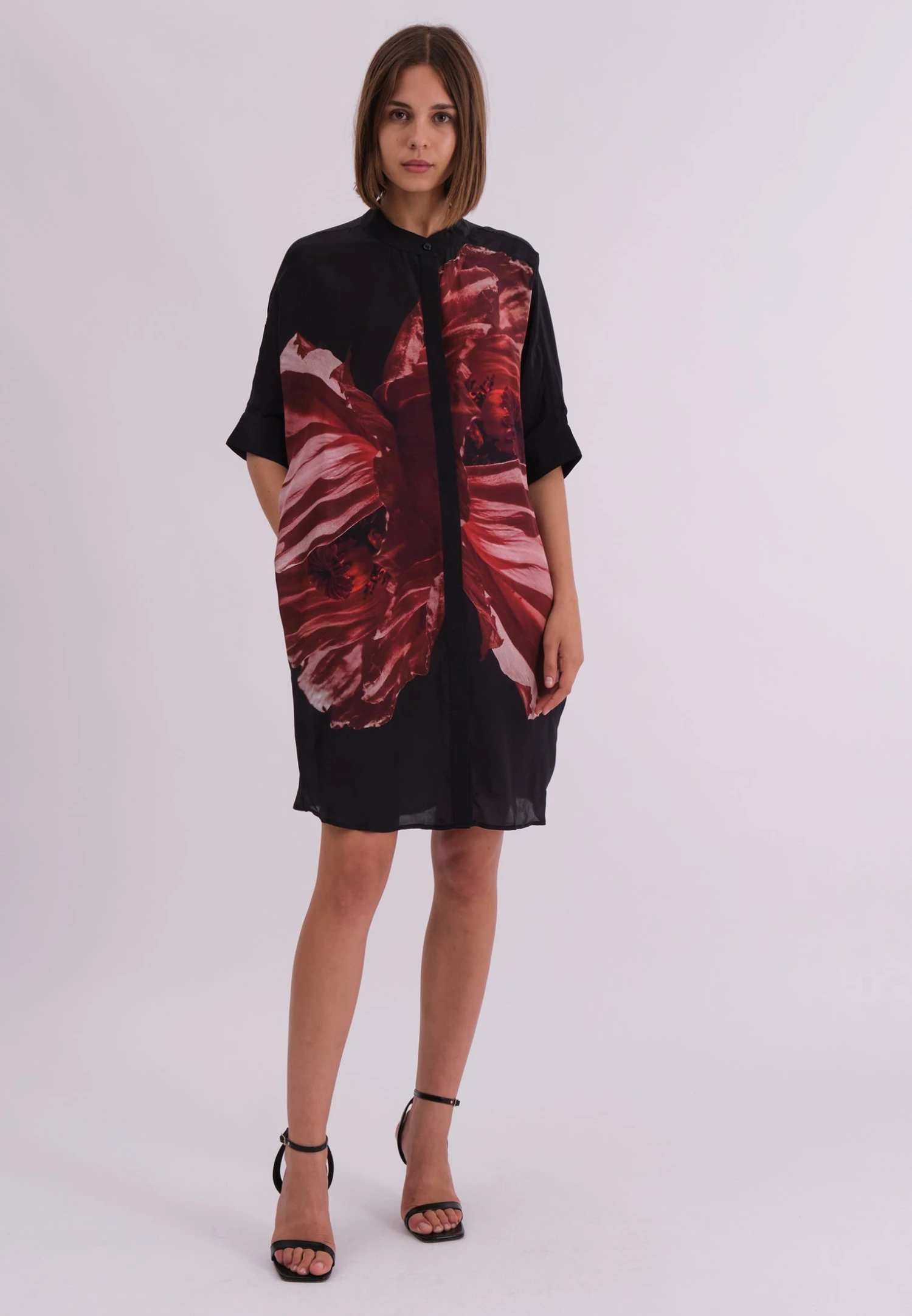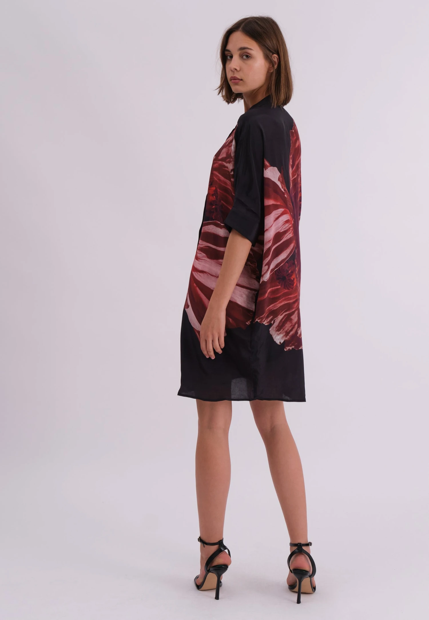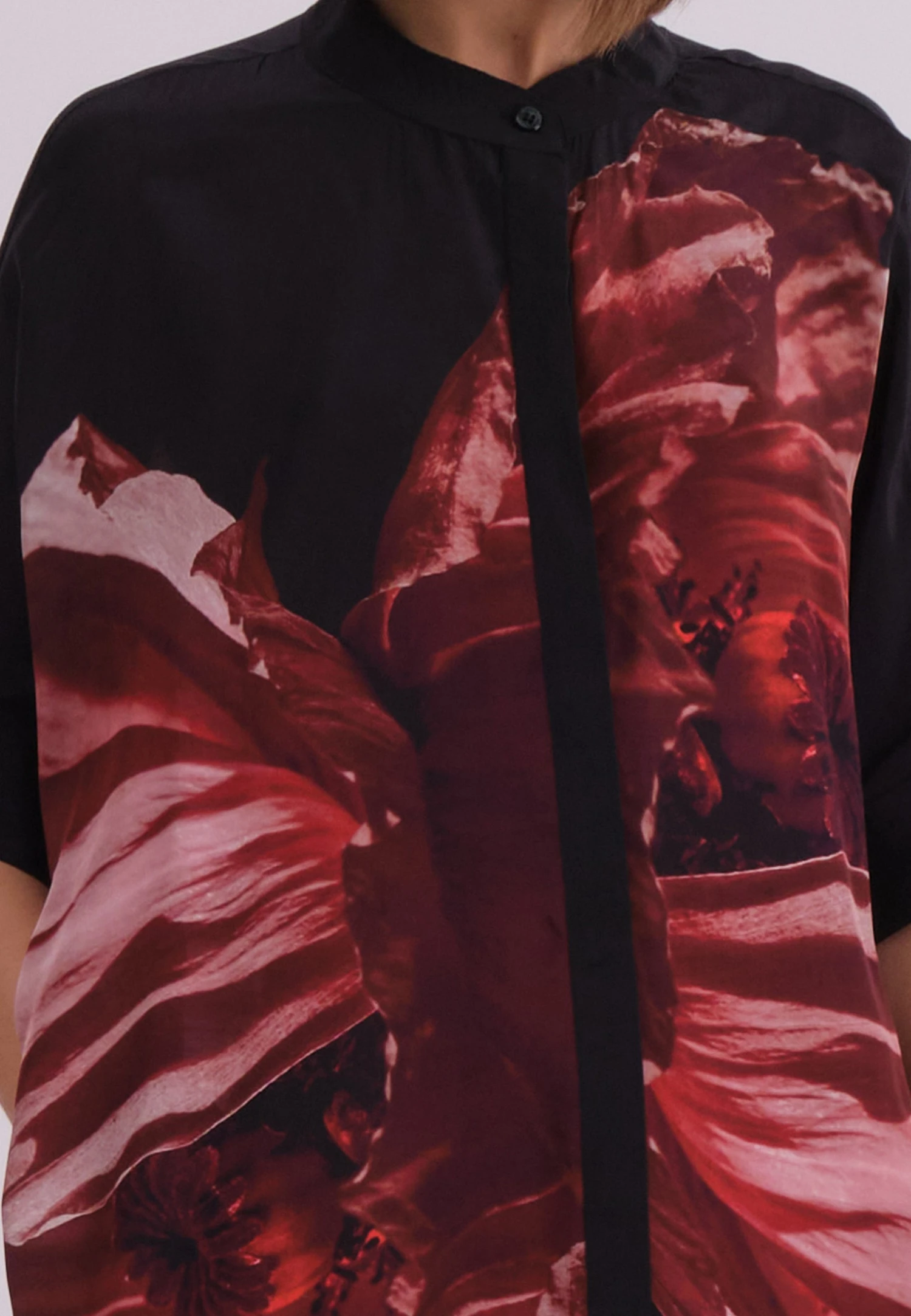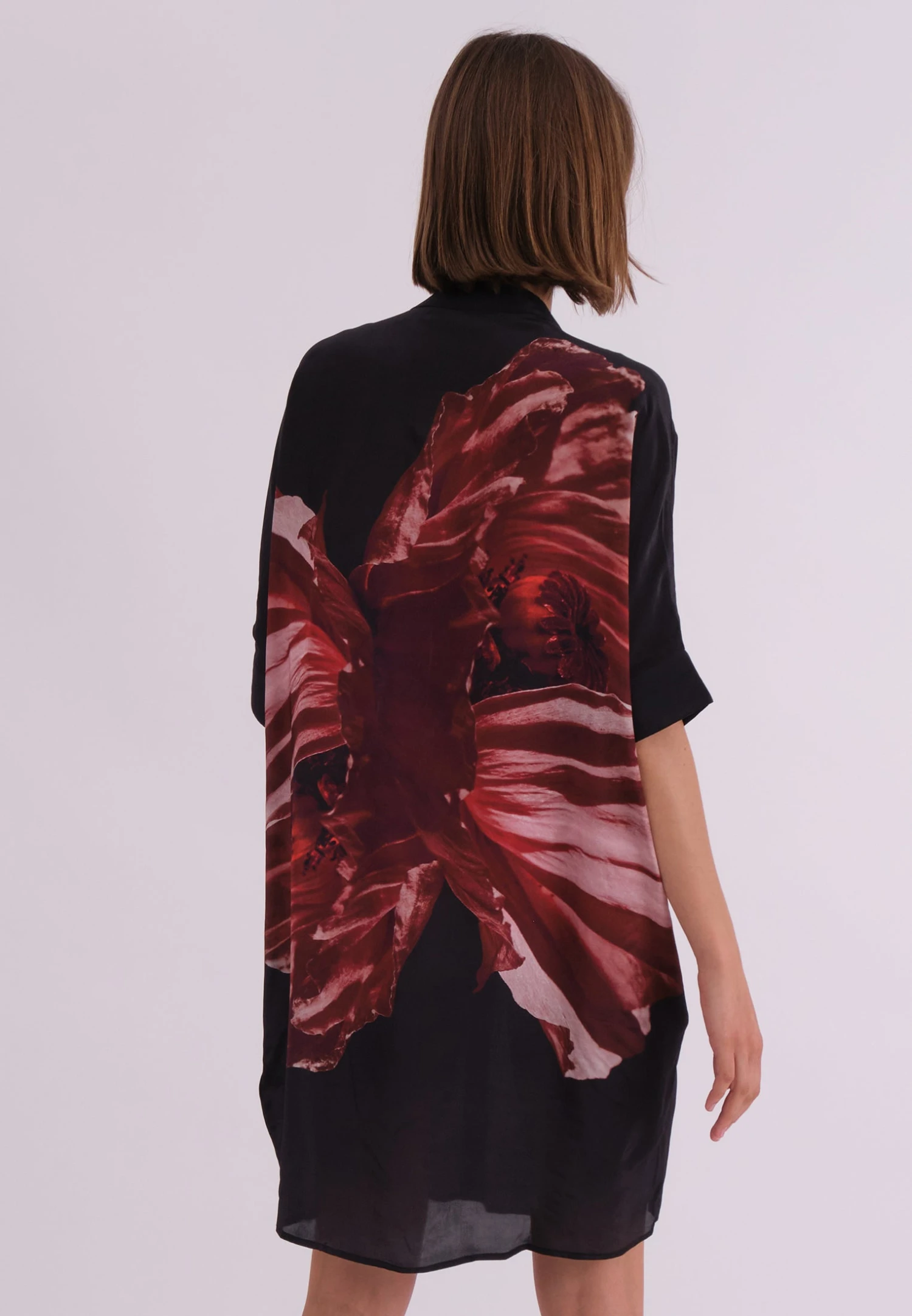The Twist tunic is a statement piece with assured appeal in our floral Charm print in red tones. Our best-selling shape, this style is made from a vegan silk and features a grandad collar, button through placket, short sleeves and pockets. Wear as a dress with or without belt, or open layered over a top and jeans as a layering piece. This is an oversized style, please go down 1 size if you like it better less oversized. The model wears an size 10. Give the style a gentle steaming before trying it on as the shipping might crease the fabric. The length from top shoulder is 90 cm. Chest width is 138 cm on the circumference.