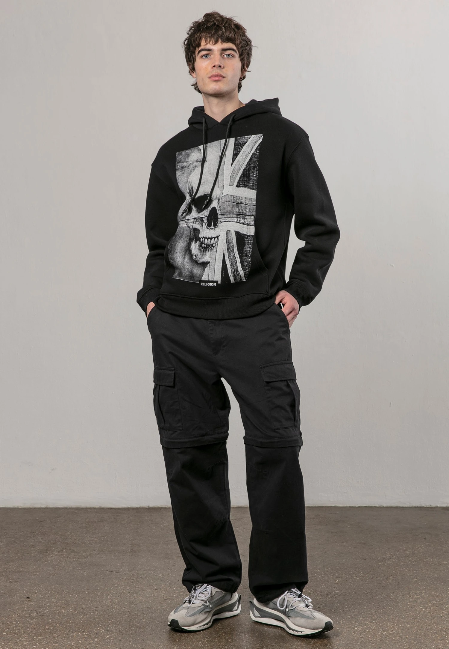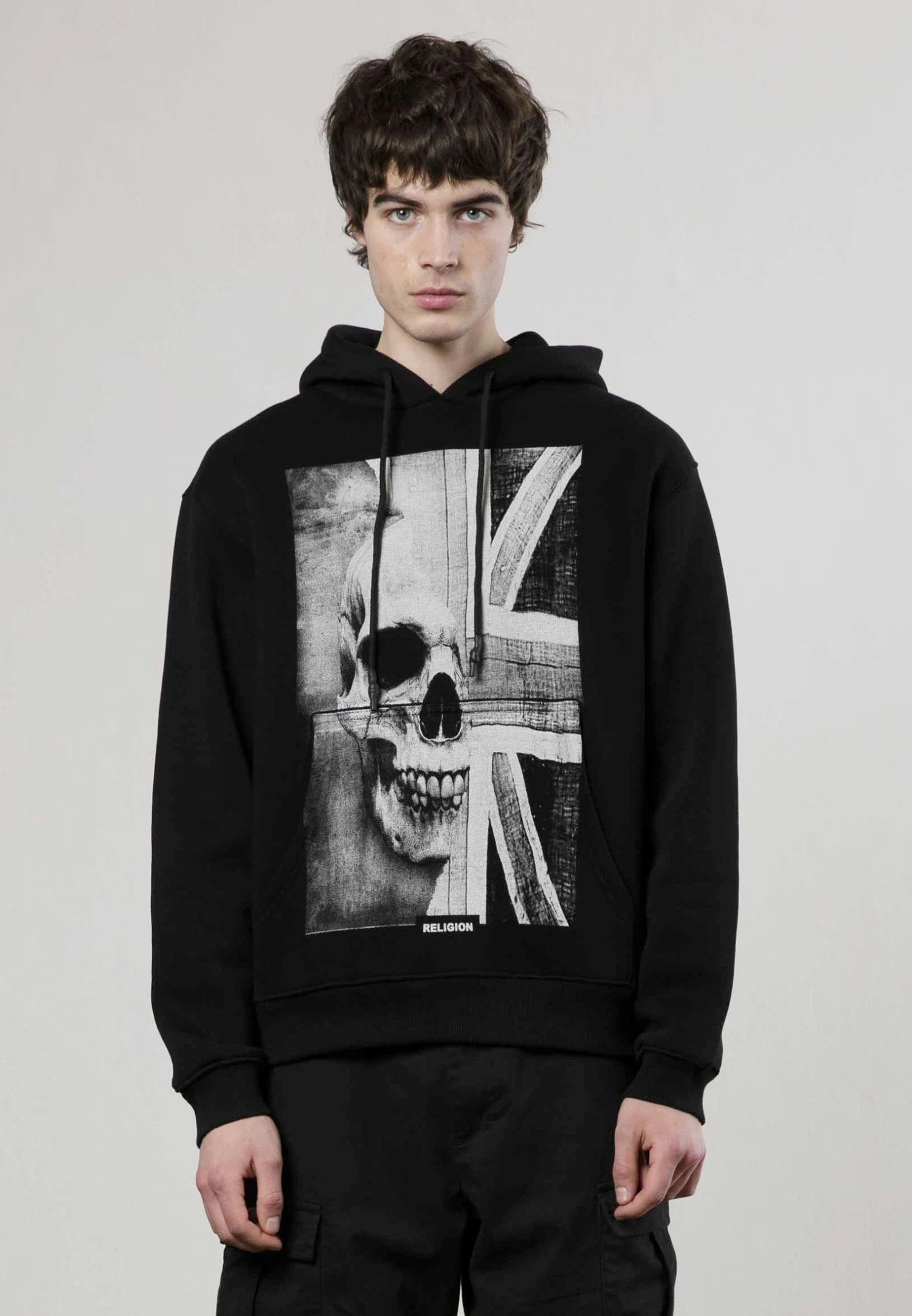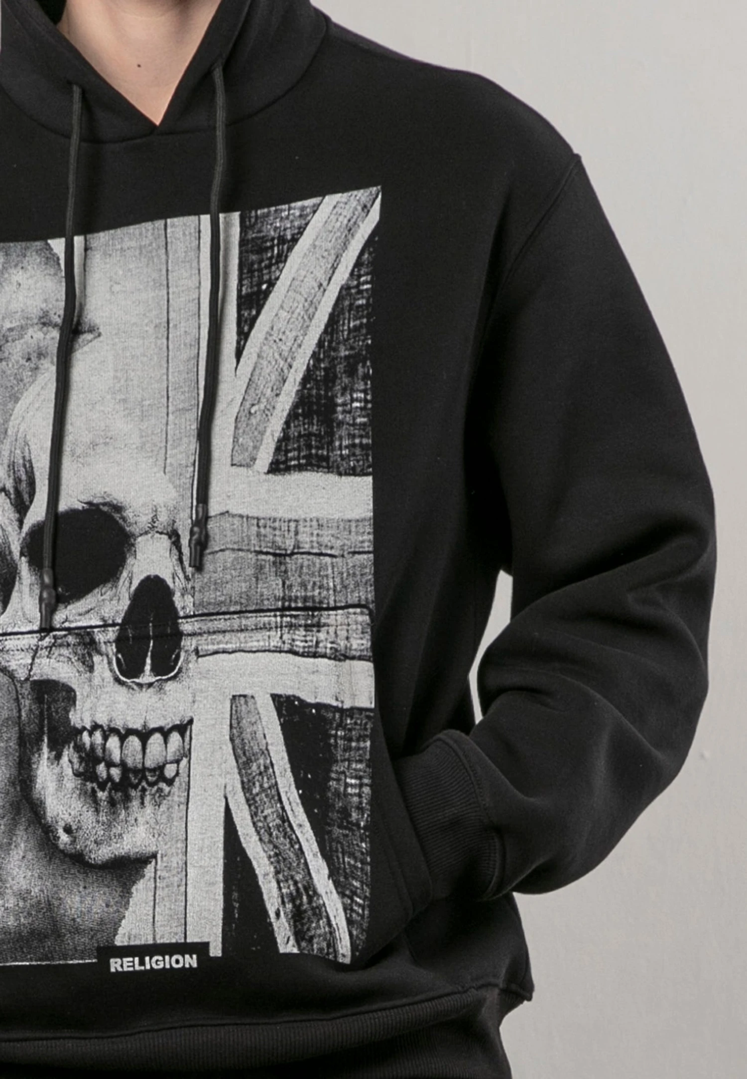 Make a statement with the Union Jack hoodie in black. Shaped to a regular fit, it showcases a striking skull and United Kingdom flag print on the front. Featuring front and back darts, a kangaroo pocket and a drawstring hood, along with ribbed cuffs and hem. Completed with chain stitch cross detailing on the back, it’s the perfect blend of casual and cool.